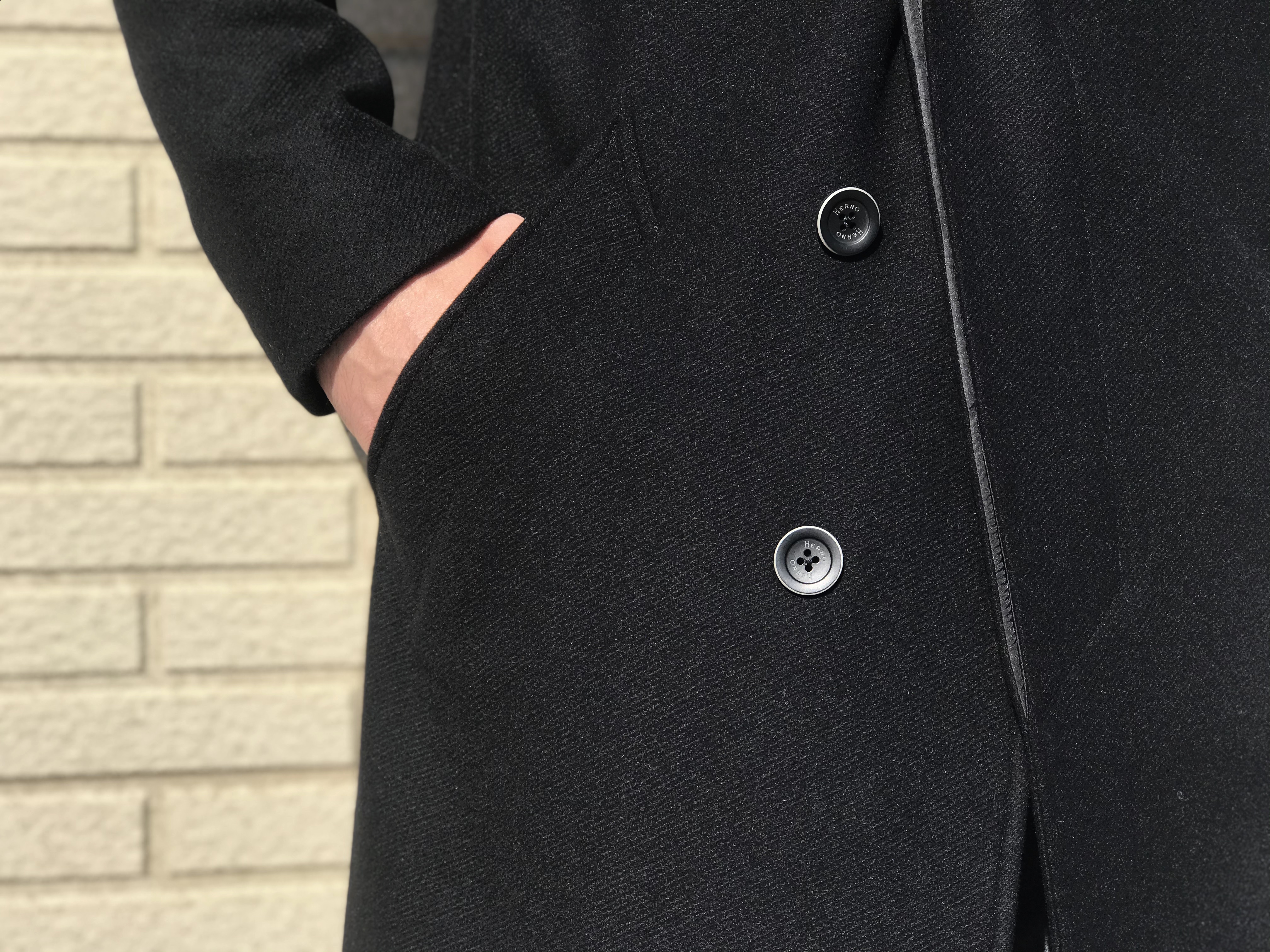 カラーはブラック。素材は、ウール80%・ナイロン20パーセント。先のコートと同じ斜めに織り目が入っていますが、こちらはハリコシの効いた綾織り生地です。