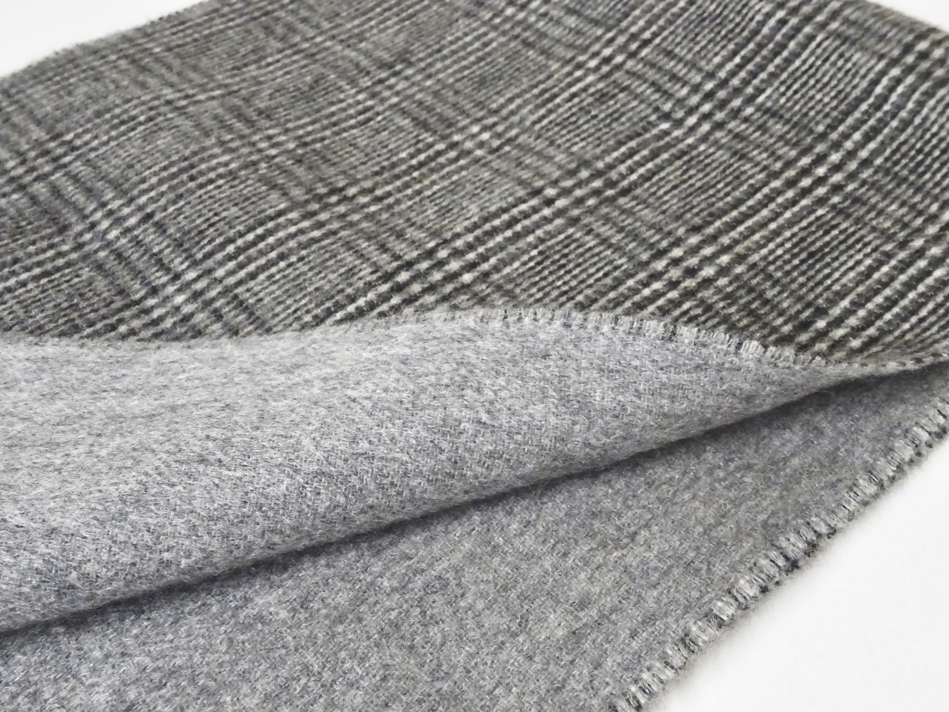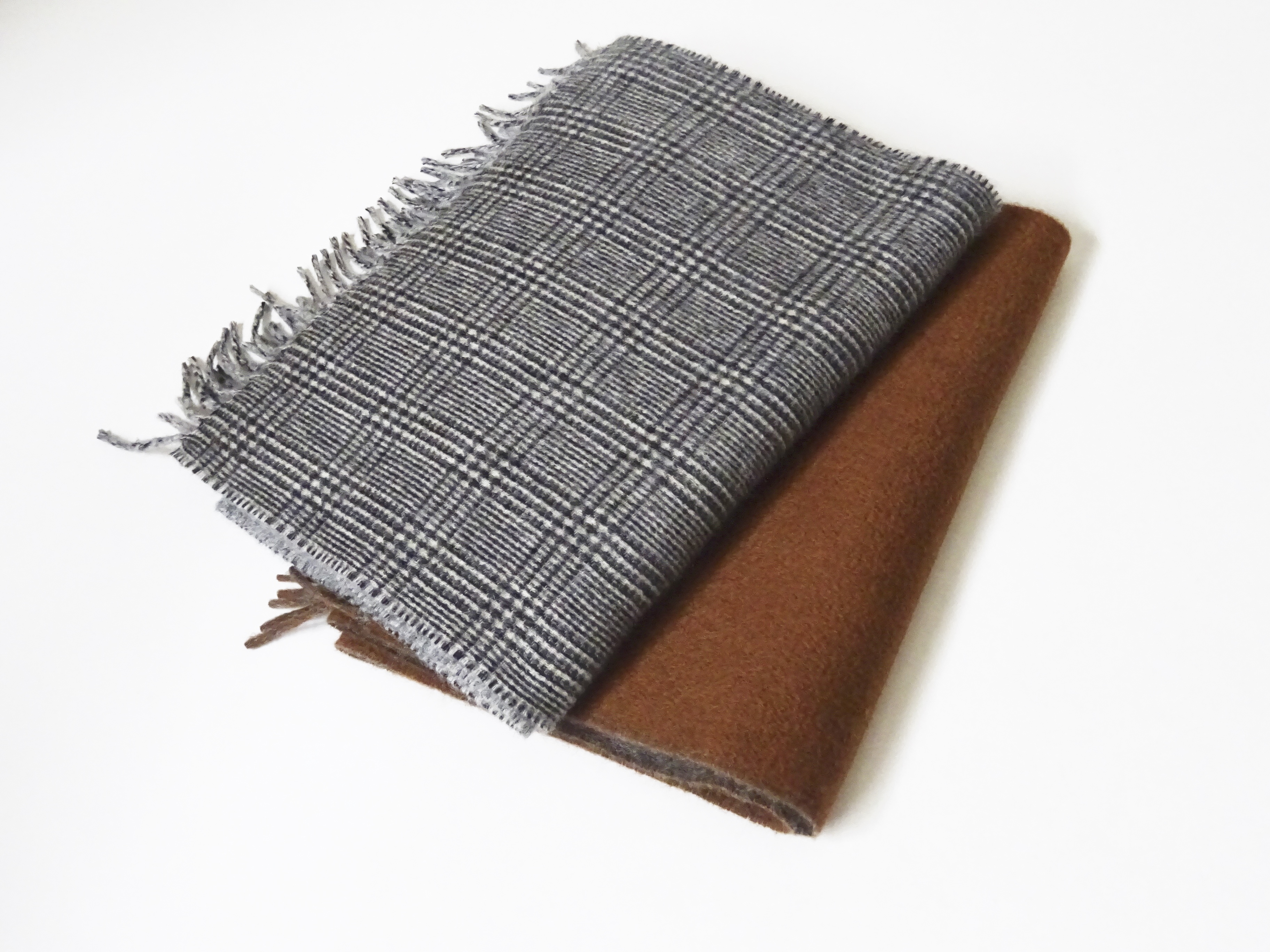 ご用意したのは2型。モノクロのグレンチェックに対してはライトグレイの無地、そして、タンブラウンとミディアムグレイの無地同士のダブルフェイスです。