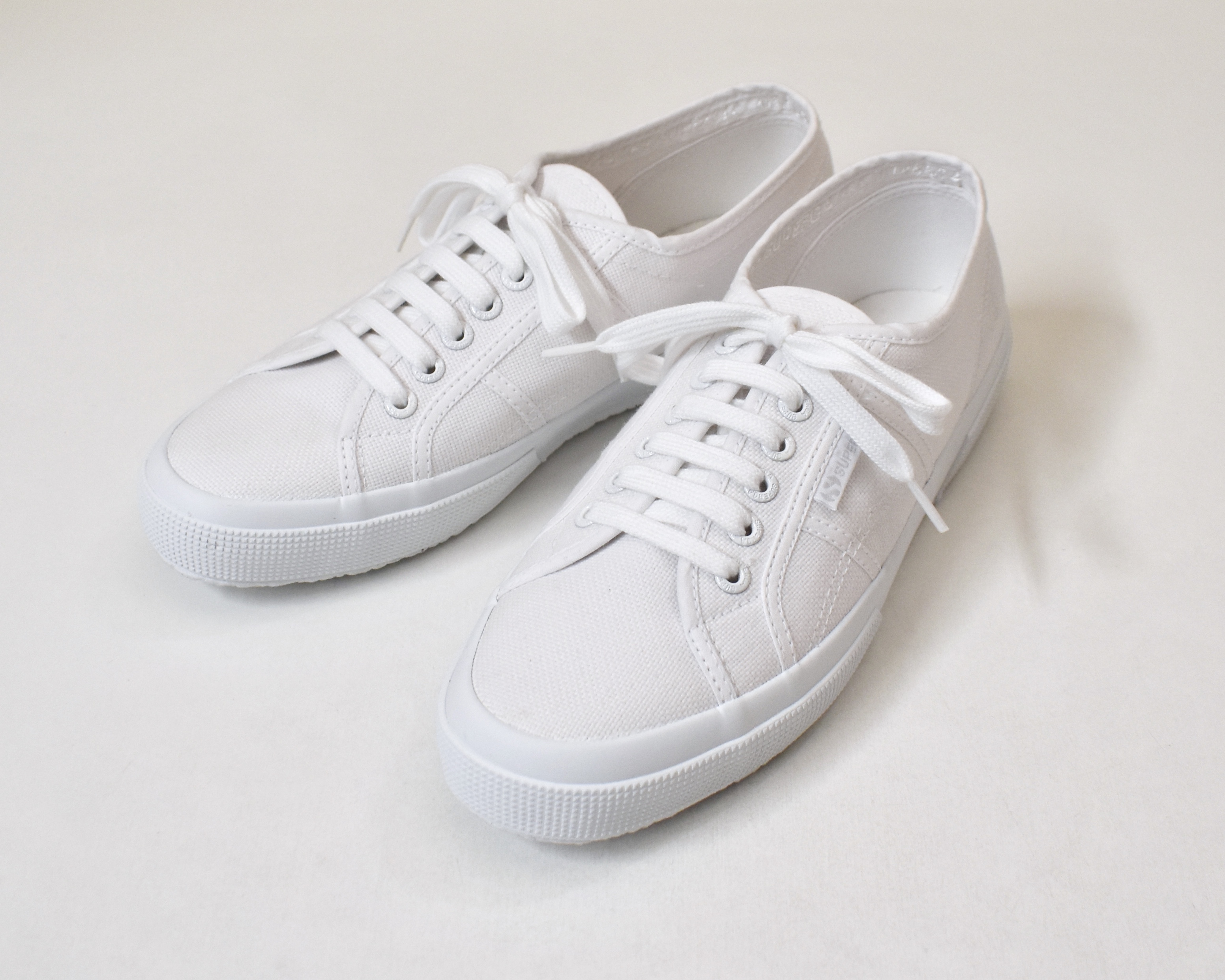 これ以上に使いやすい・合わせやすい物はない...と、つい言葉がこぼれてしまうのが、【SUPERGA/スペルガ】の白スニーカー。昨年の取り扱い開始時に購入したところ、仕事でも履いて、休みの日も履いて...と、最も靴箱から選んだ回数の多いスニーカーとなりました。気軽さというのも、大きかったですね。