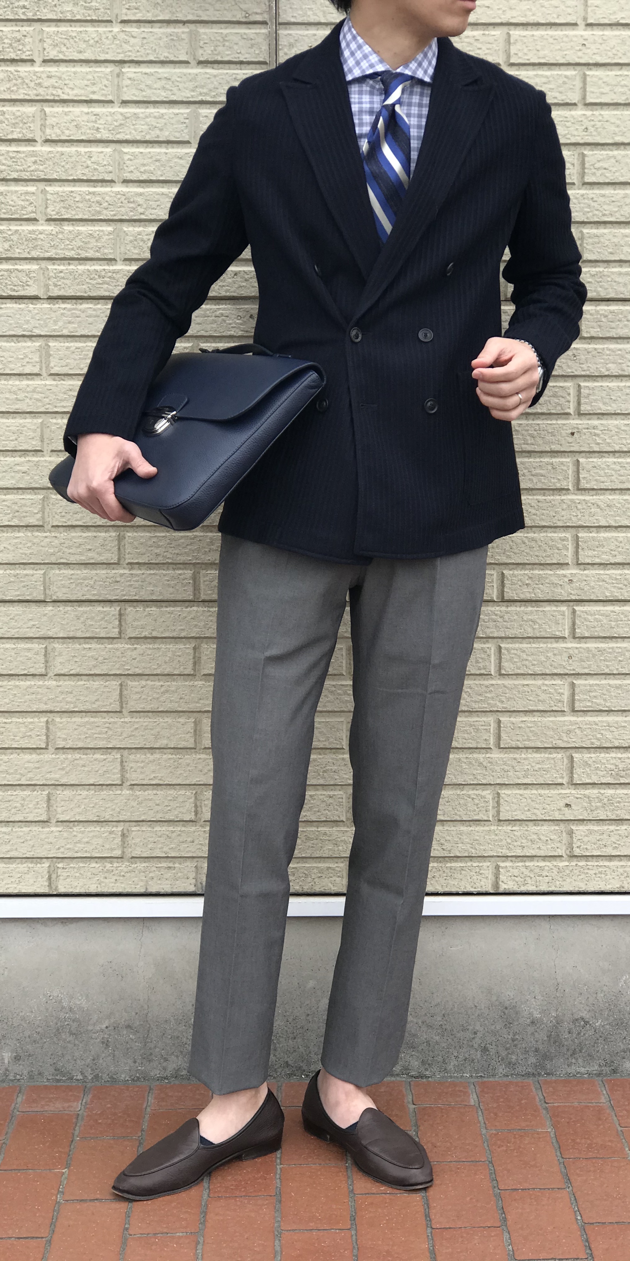 シングルよりも気楽に着れるのがダブル、というのが僕の持論で、すっきり&スマートなシングルよりも、着こなしに表情が出るダブルは、ブルゾンのような感覚でしょうか。