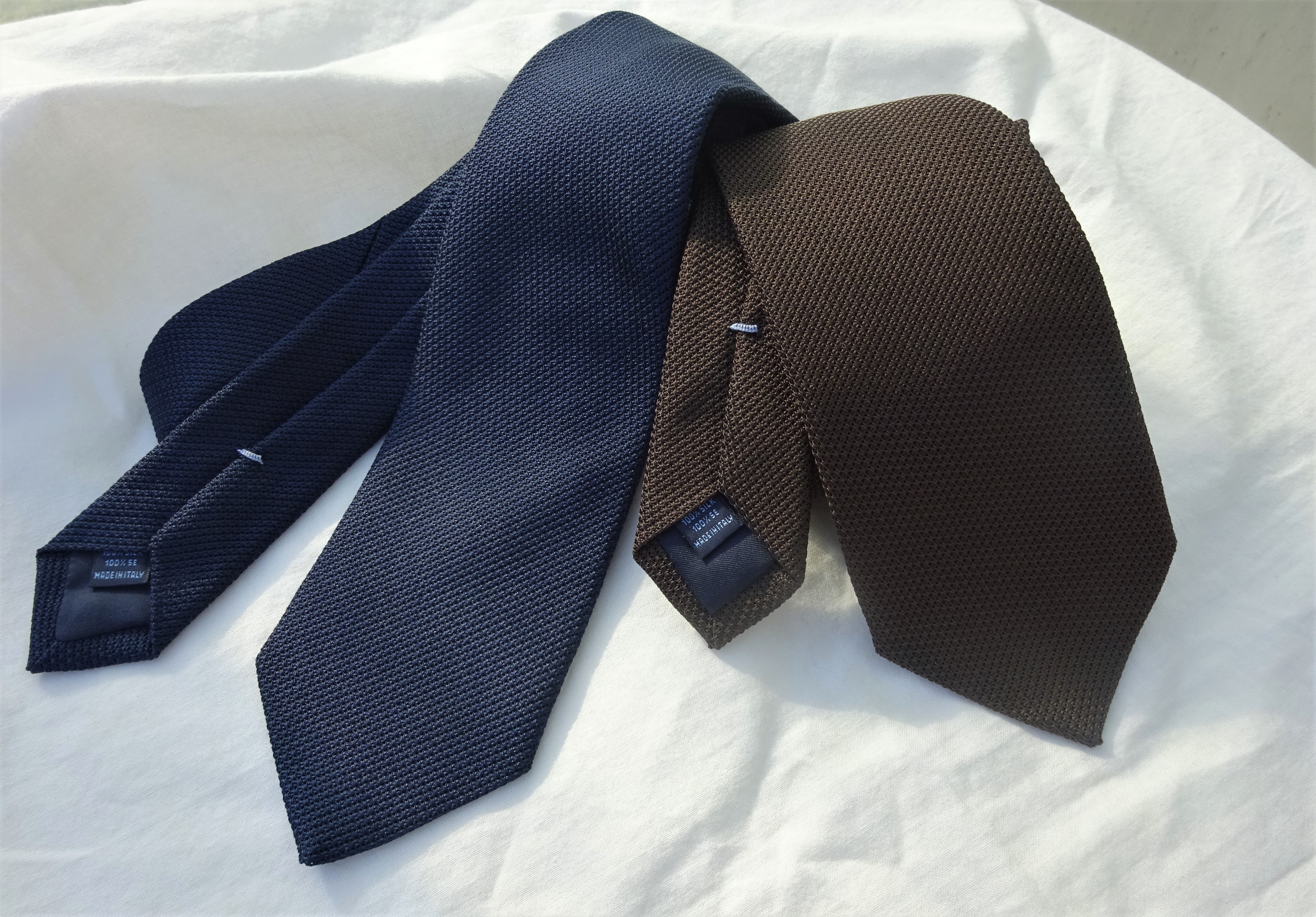 透けないメッシュタイが、今回のキーワード。キーワードなんて、ただ裏地をつけるだけですが、安定感のあるVゾーンを涼しげに演出できます。セレクトカラーはブラウンとネイビーと普通かもしれませんが、いつもより浅めのトーンで晴れやかな気分をご提案です。