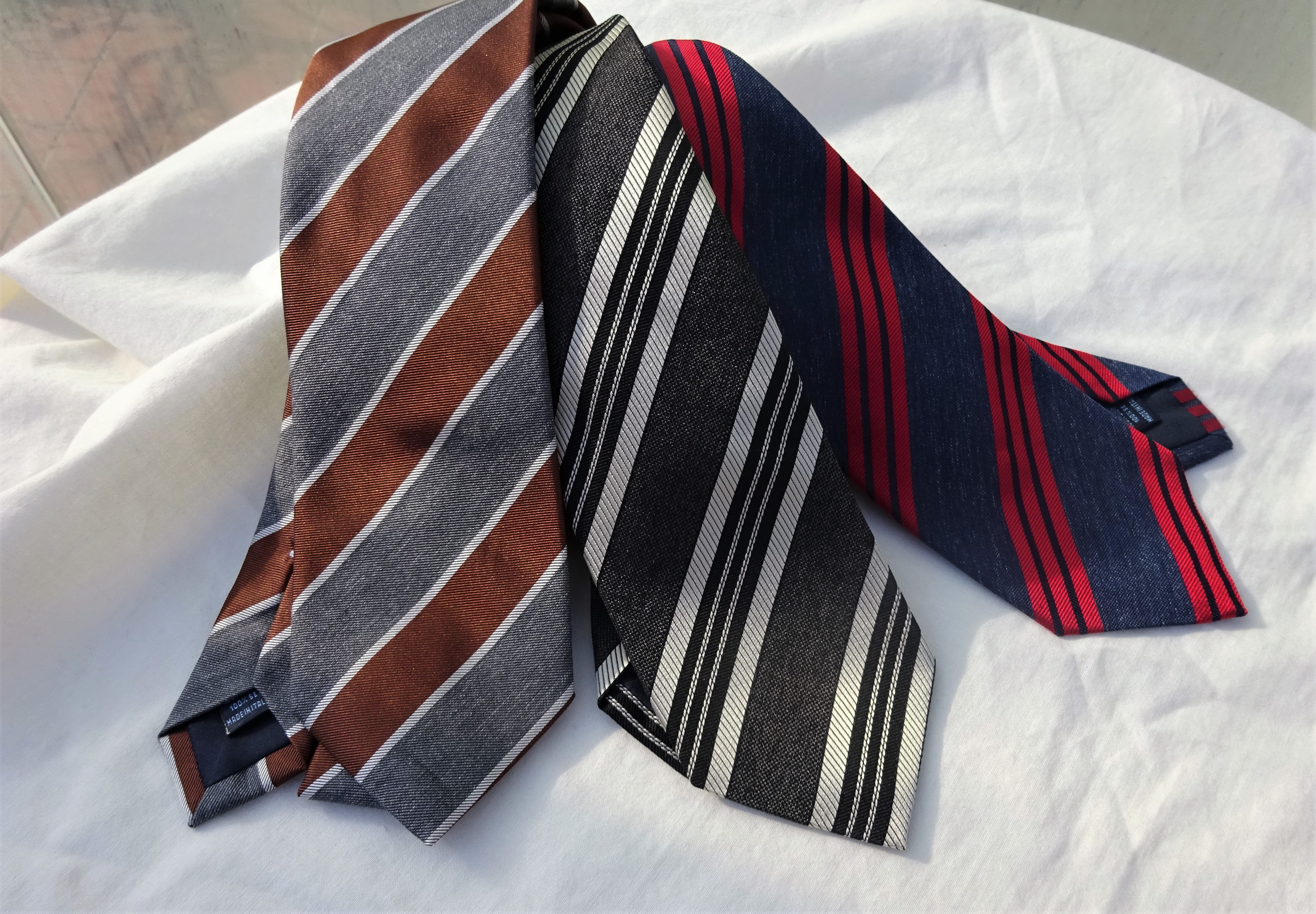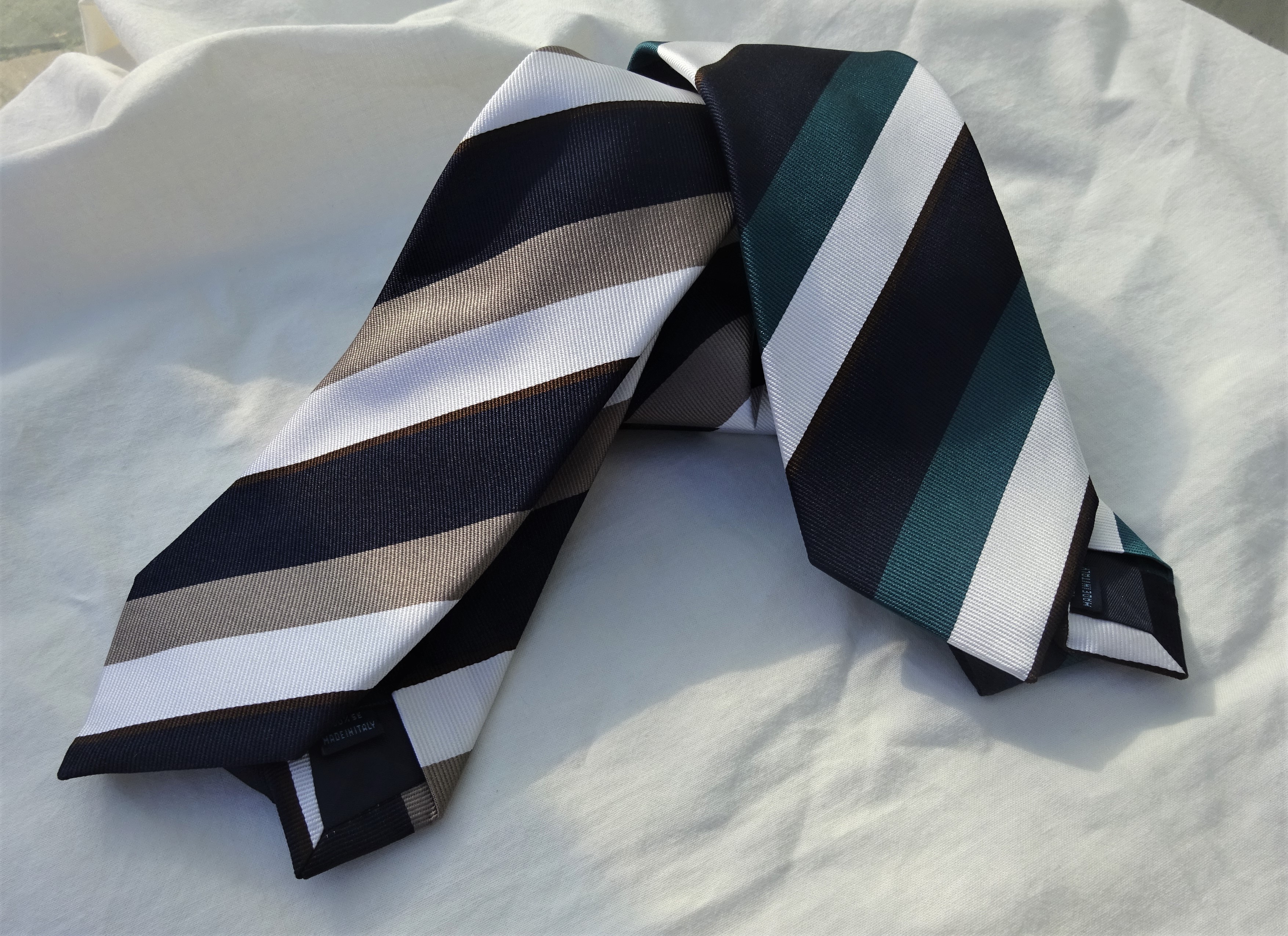 捻りのないストレートカラーの3段のレジメンタルタイです。どちらもネイビーを基調にし、ベージュとグリーンをアクセントカラーに。共通カラーは控えめなブラウンです。