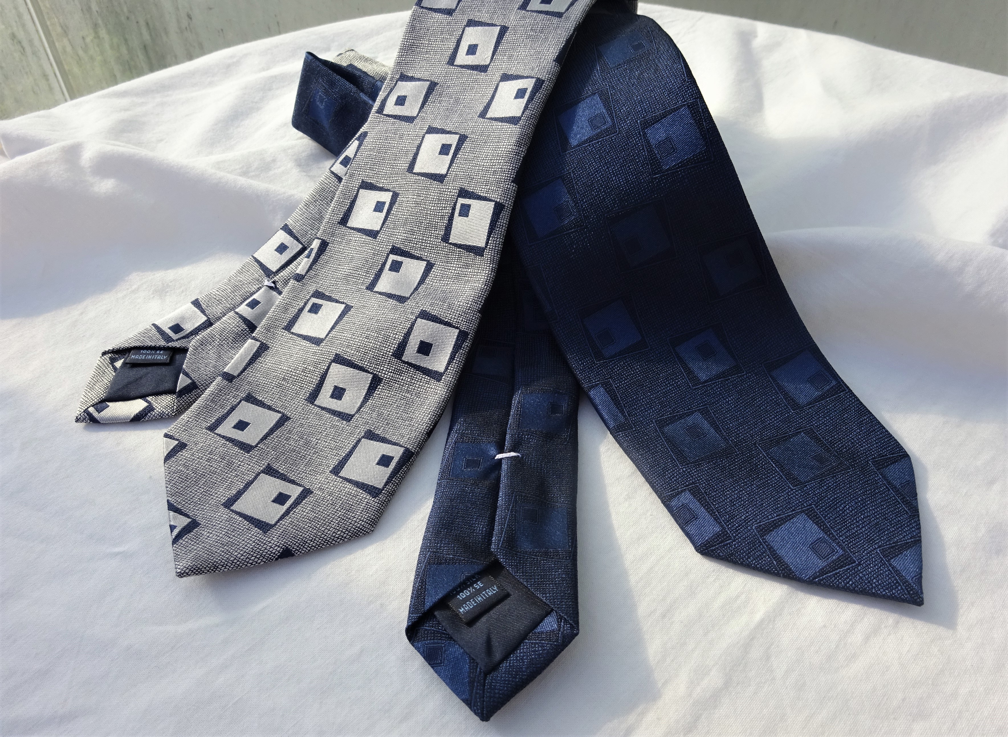 よりフォーマルに魅せるなら、スクエア柄のオールオーバー。シルバーにネイビーの配色、青のグラデーションと、どちらも粋を感じさせるネクタイです。
