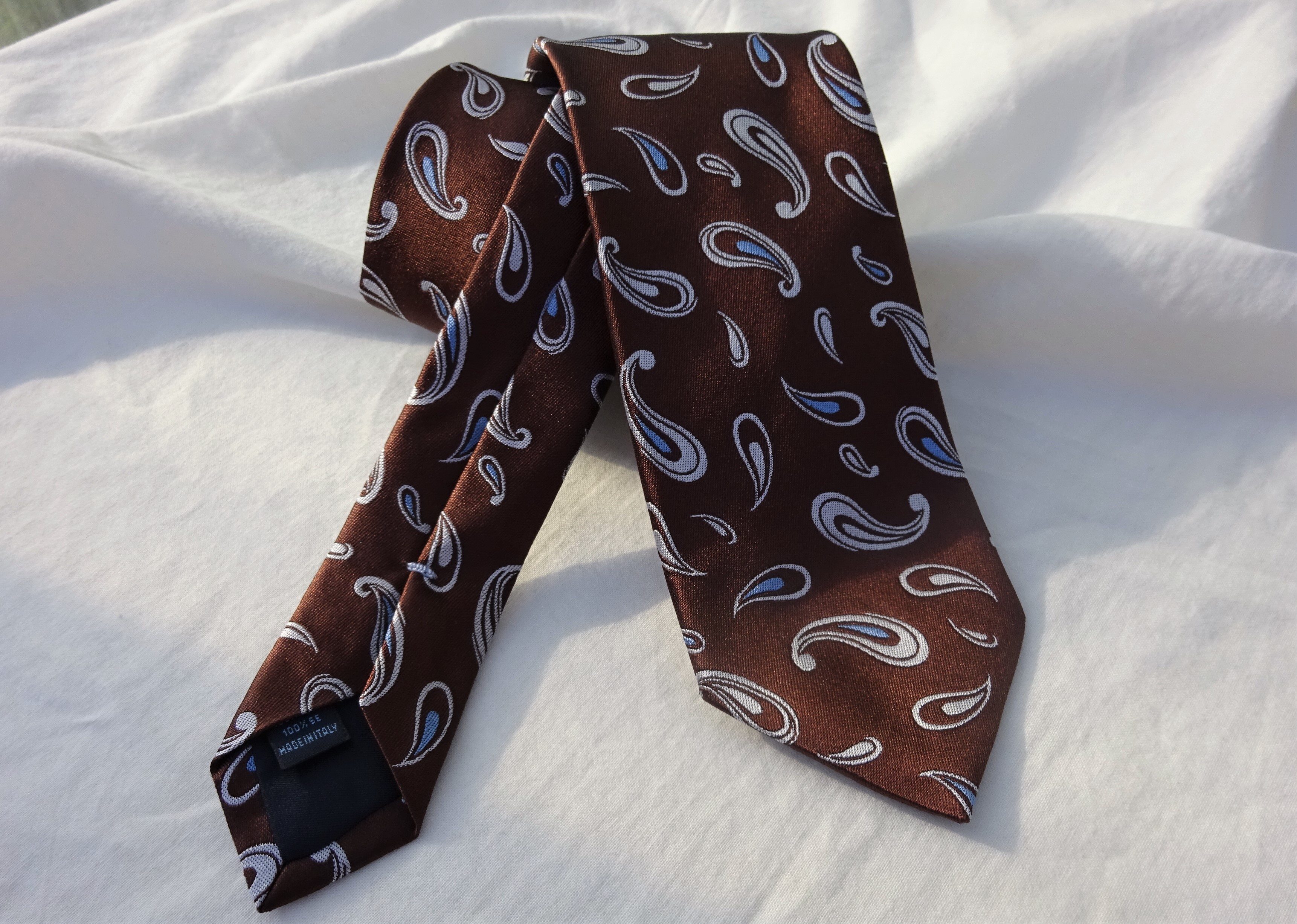 美しいテラコッタにシルバーホワイトとサックスブルーのペイズリー柄。シルバーホワイトが白シャツと好相性。大柄だけに柄物のシャツとも合わせやすく、晴れの日にはお勧めのネクタイです。