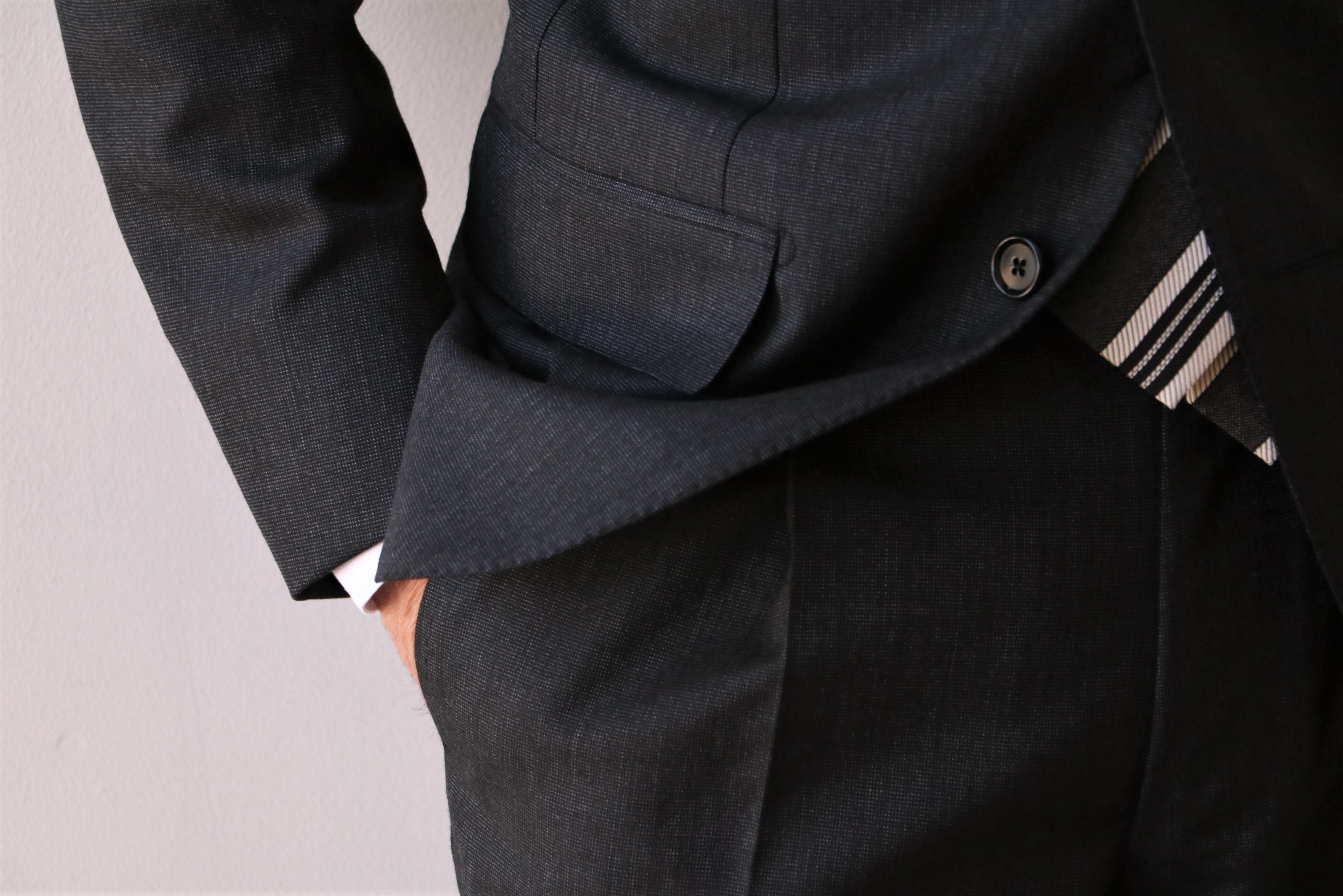 ナポリらしいギャザーの入った、柔らかな肩ライン。ラペル幅はやや狭めにしてあります。カマ(脇の下)を上げることで、アームホールもスッキリ。上げた分、袖を前振りにすることで運動量を確保できます。前肩縫製による首裏(うなじ)に吸い付くような着心地は、服を軽くするとともに正面から見た際、シャツにぴったり寄り添い、美しい襟元を見せます。襟元が開く上着は体に合っていない証拠ですので試着の際に確認してください。ここまでの着心地を実現するのは、かなりの修正が行われています。なぜかといえば、イタリア人と日本人の体形の違いがあるからです。