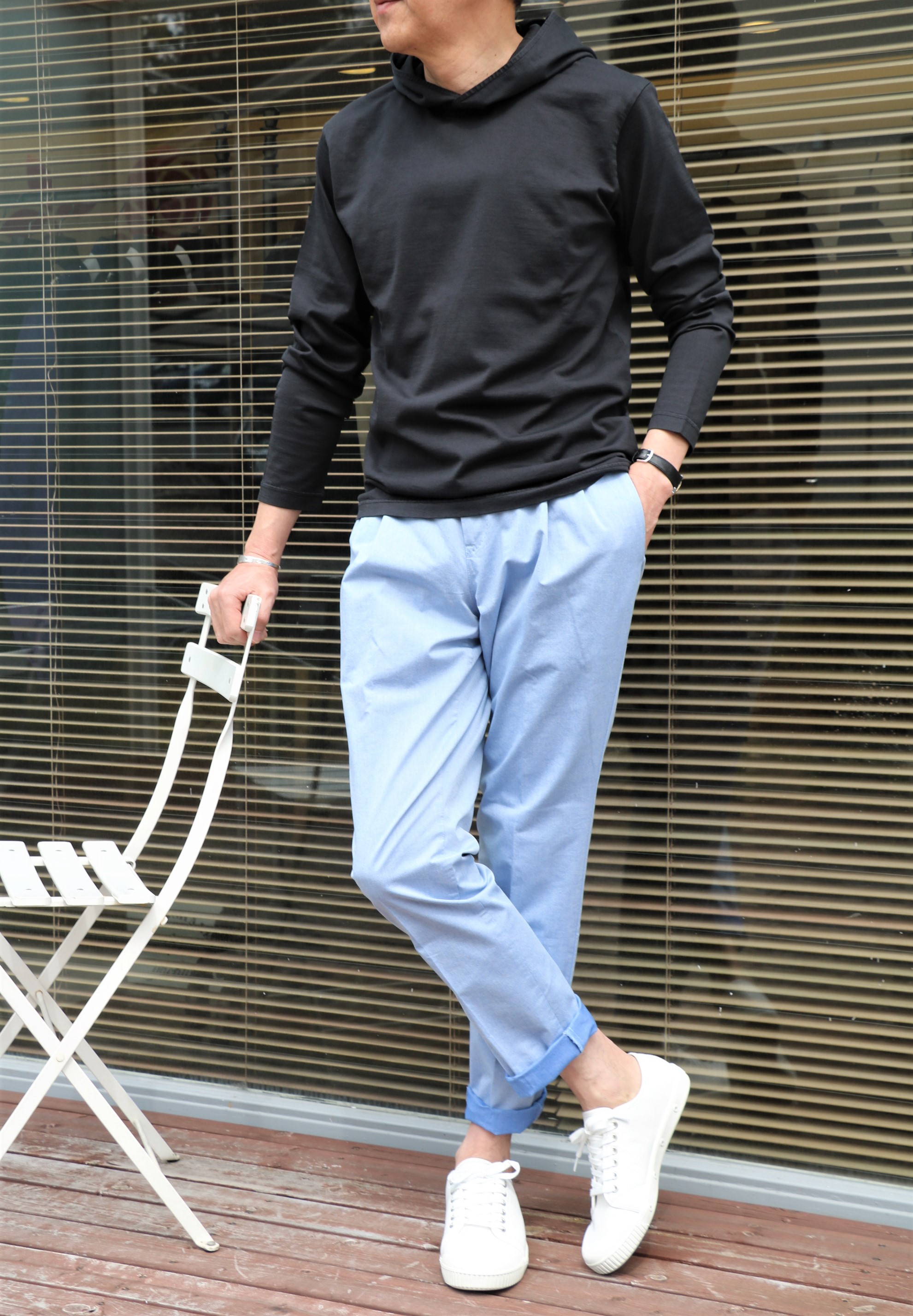 裾をロールアップで、さらにリラックス気分。足元は、やはりスニーカーでしょうか。