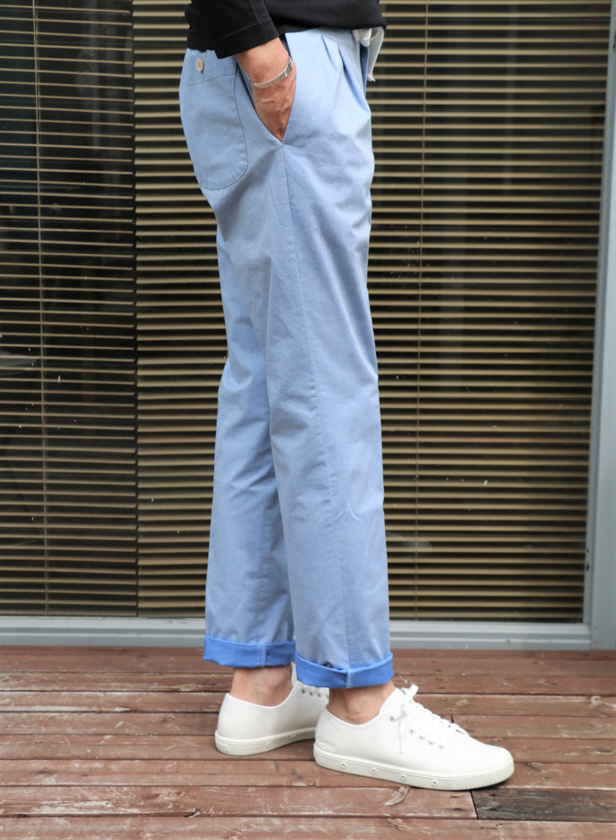 コードレーン同様、この夏を楽しくさせてくれそうなオックスフォード地のコットンストレッチパンツ。爽やかなブルーが気分を高めてくれます。リラックスパンツだからこそ、素材と作りの良さに拘りましょう。購入する前はきれいでも、洗ったらダラしなくなってしまった...そんなことにならないように。