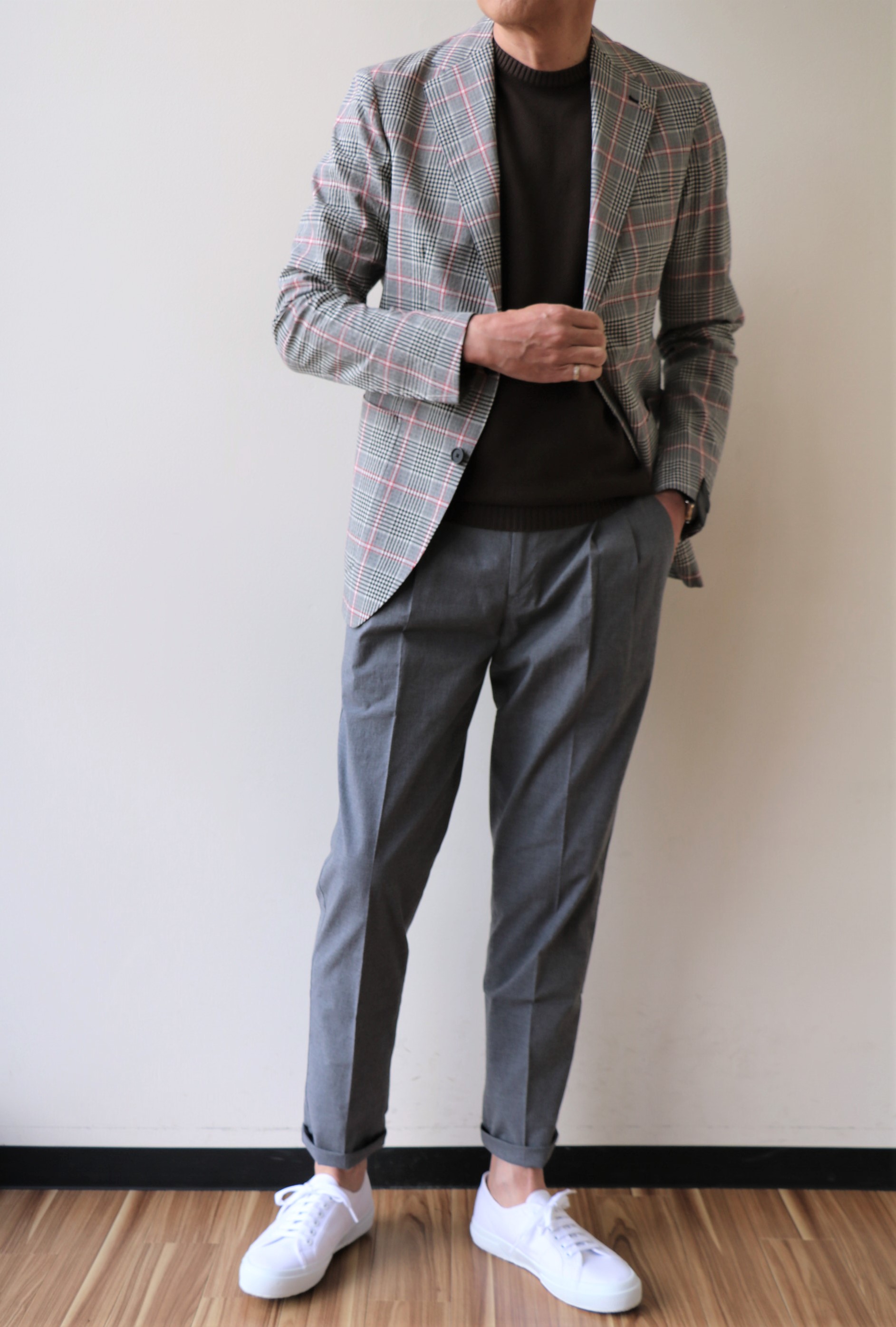 シアサッカーに似た凹凸感のある生地は、ウール・コットンのグレンチェック柄。クラシックな英国柄をモダンに表現しています。モノクロのグレンチェックに赤のペンが入ることで、コーディネートの幅が広がります。You Tube「SUGURU STORY」の第11回目でもお話ししたように、ウールを入れることで、しなやかな肌触りと軽い着心地を実現させます。ウールの繊維には空気の含有量が多いため、軽く、また吸湿率が非常に高いことから、ジメジメした夏でも快適。さらに弾力性があることで復元力に優れているとう特徴があります。シワにもなりにくいということですね。
