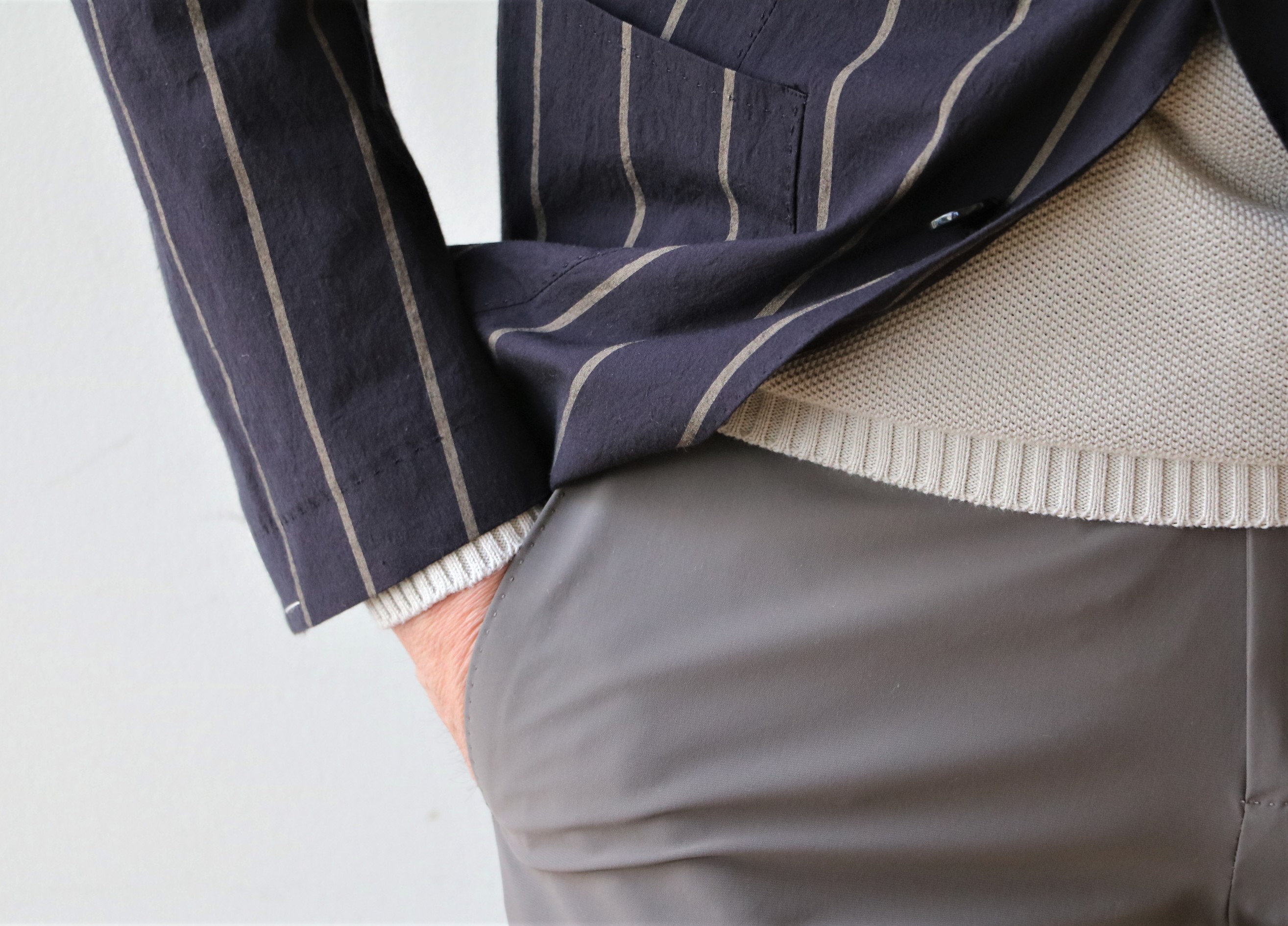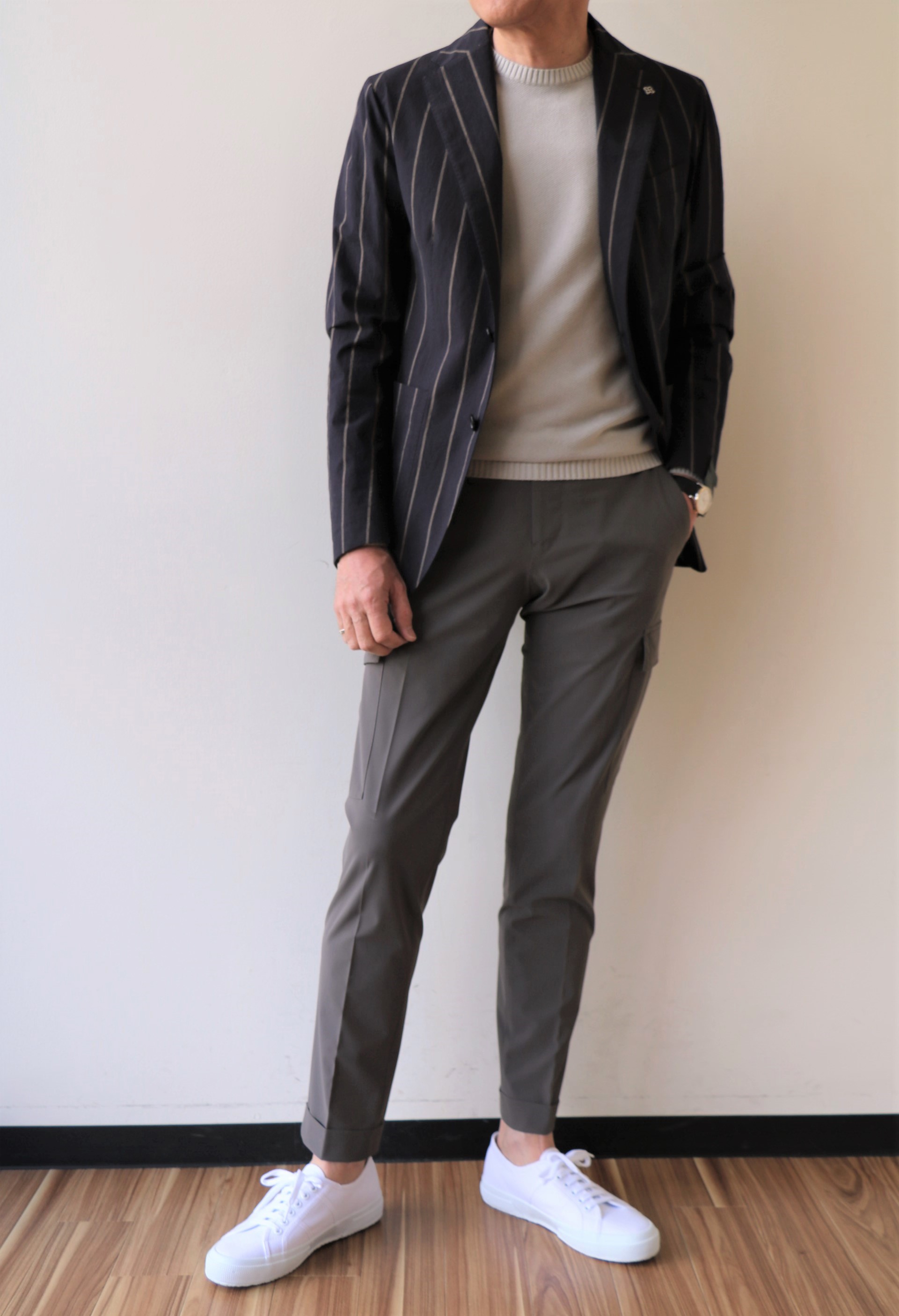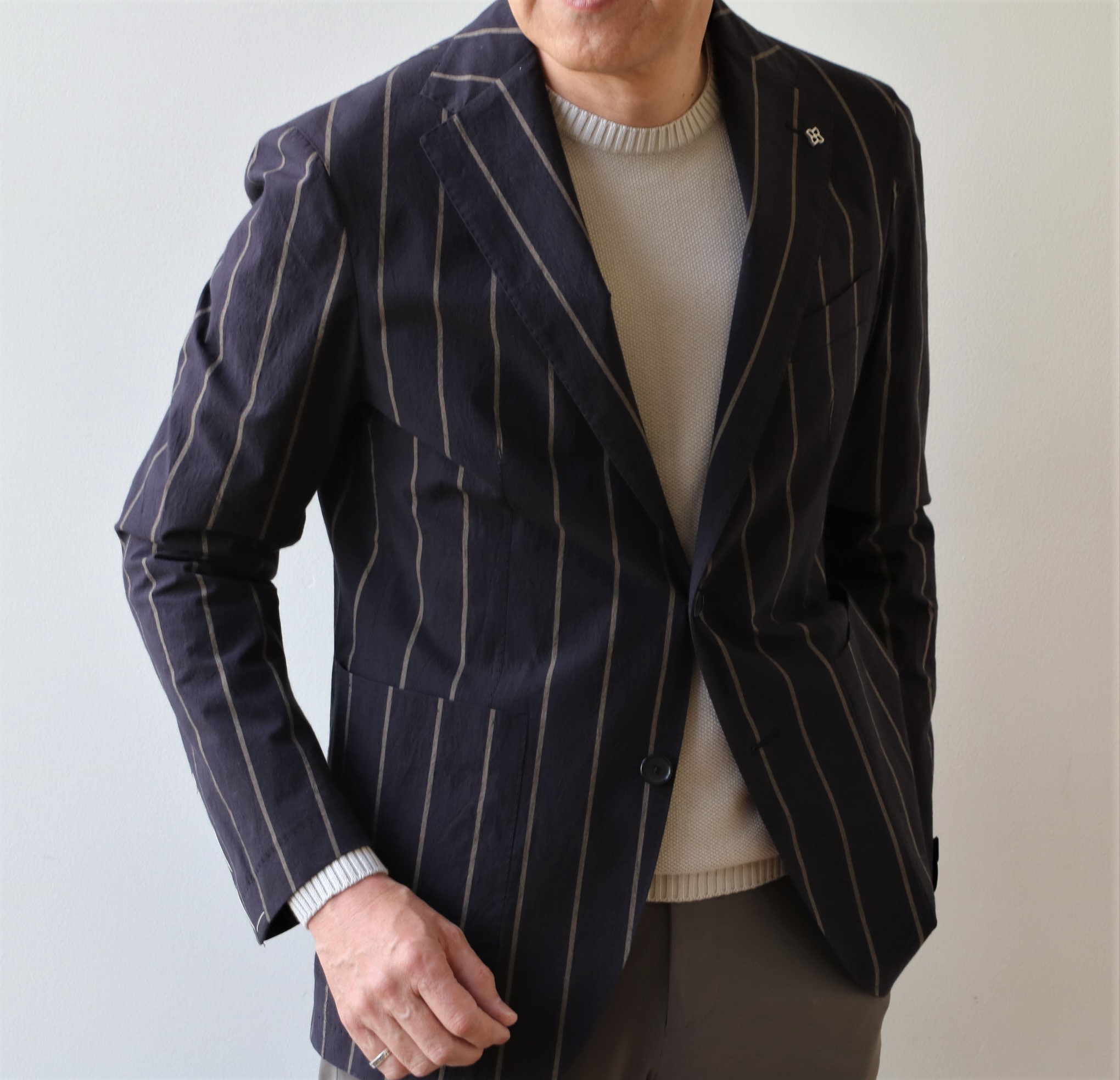 抜けたブラックに掠れたラインの入ったストライプ柄ジャケット。素材はコットンストレッチ。こなれた大人の色気を出すには最適なモテジャケットになりそうです。