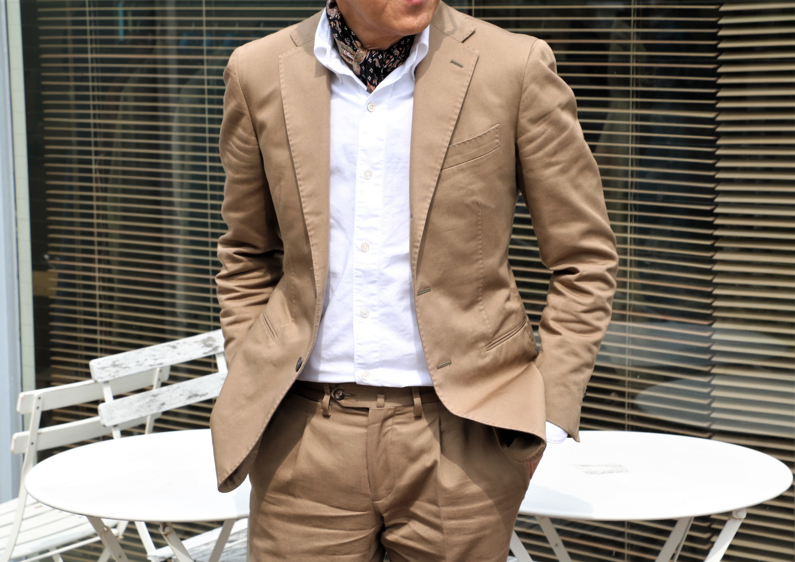 2日続けてのタイドアップ。本日は、どうしようかと思い、白のB.Dシャツにベージュのコットンスーツを着込みました。ネクタイは?実は、このシャツ。ネックサイズが38で閉まらない。ならばと巻いたのが、PAOLO ALBIZZAT(パオロ アルビザッティ)のネッカチーフ。巻くだけでアクセントになり、温度調整もできる、便利なアイテムです。"
