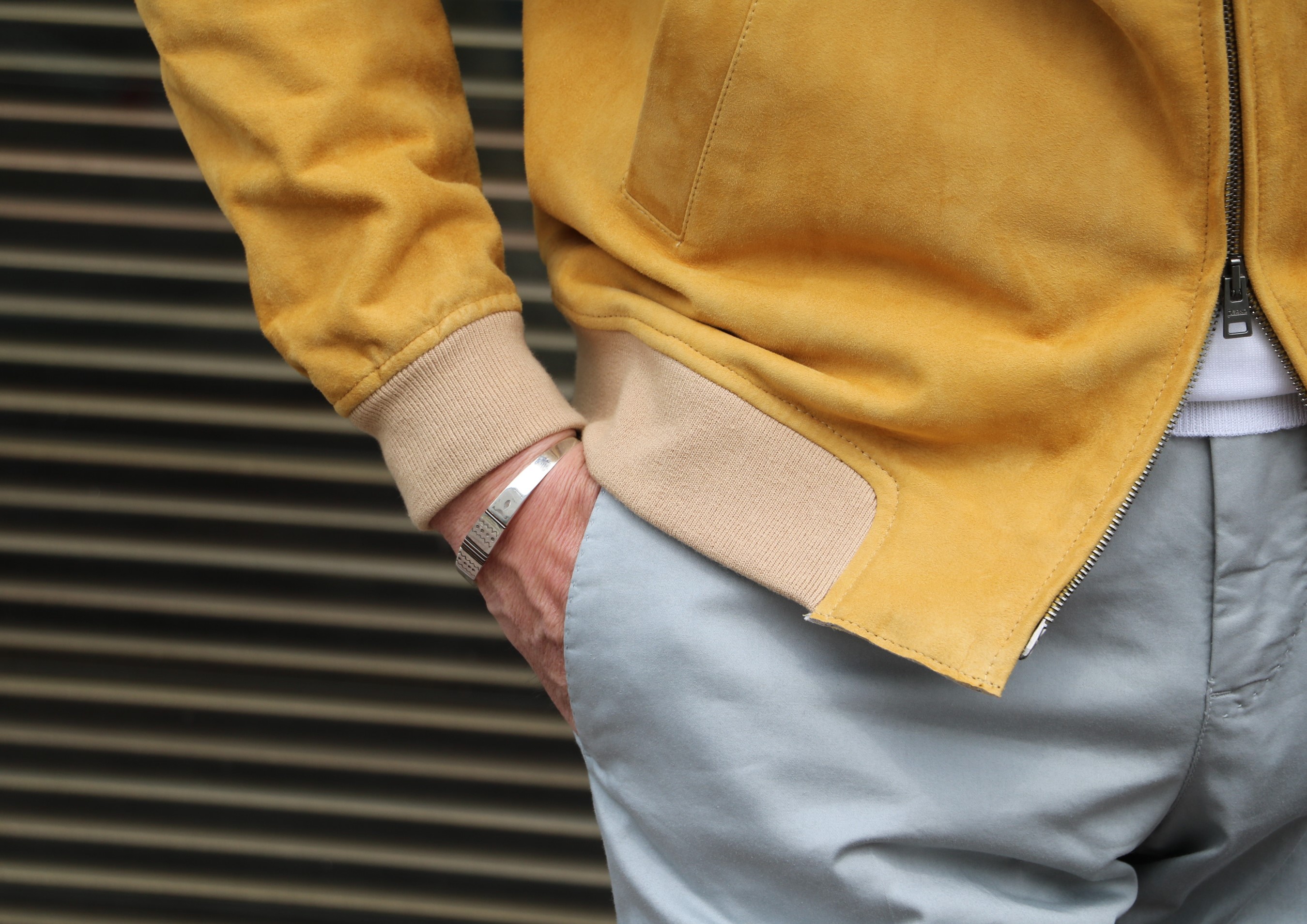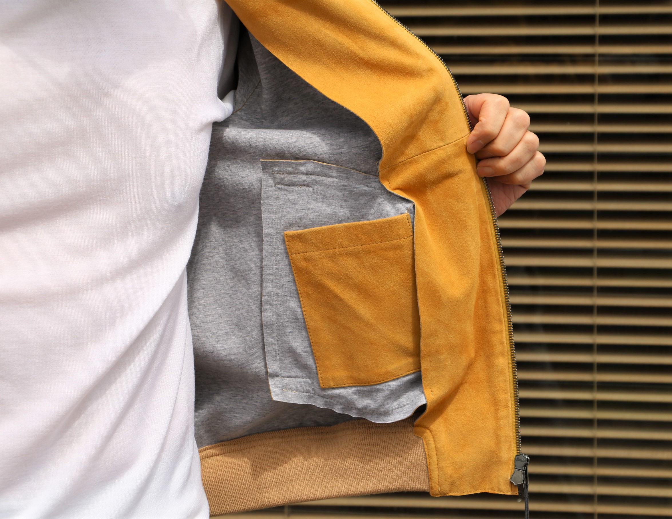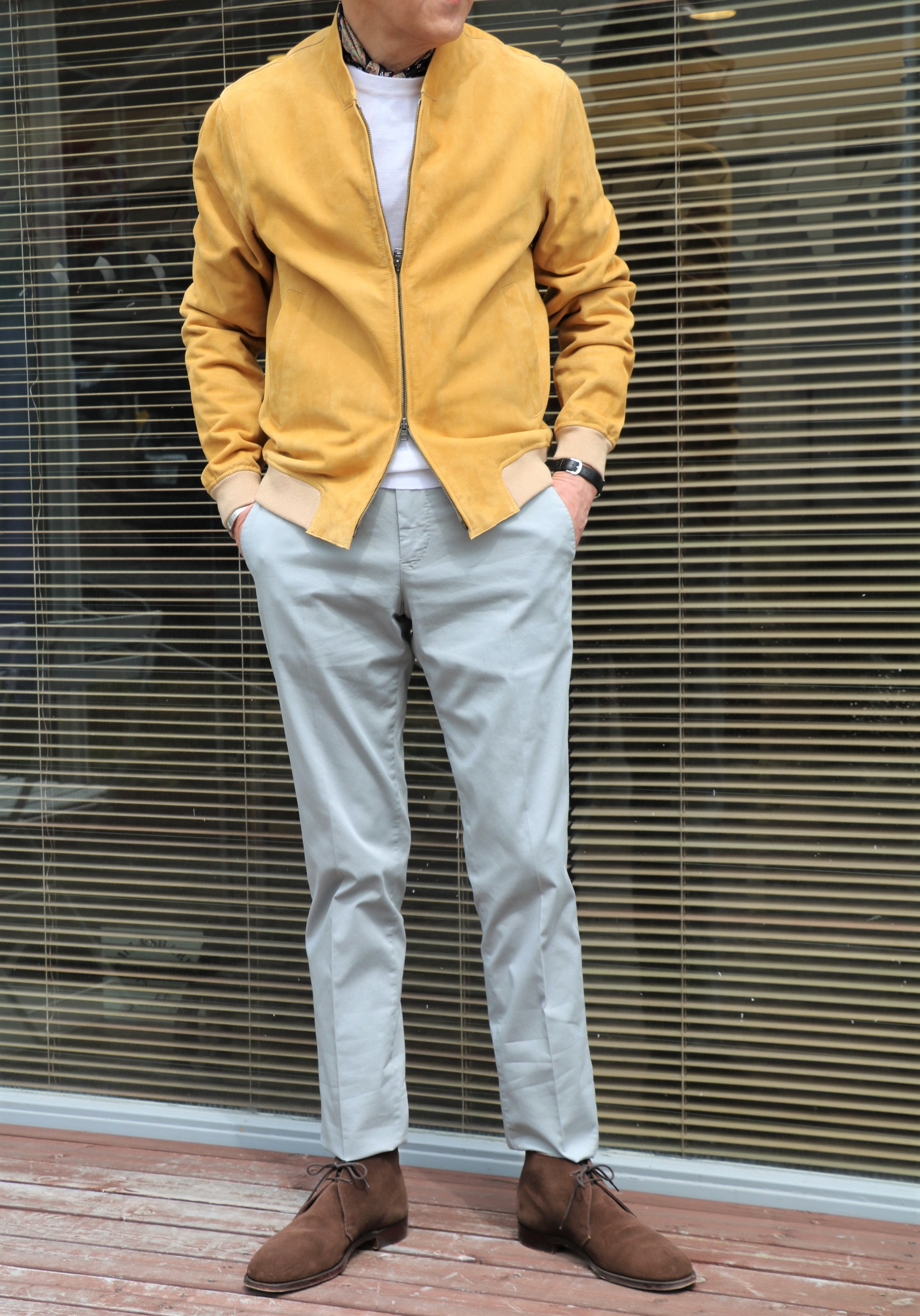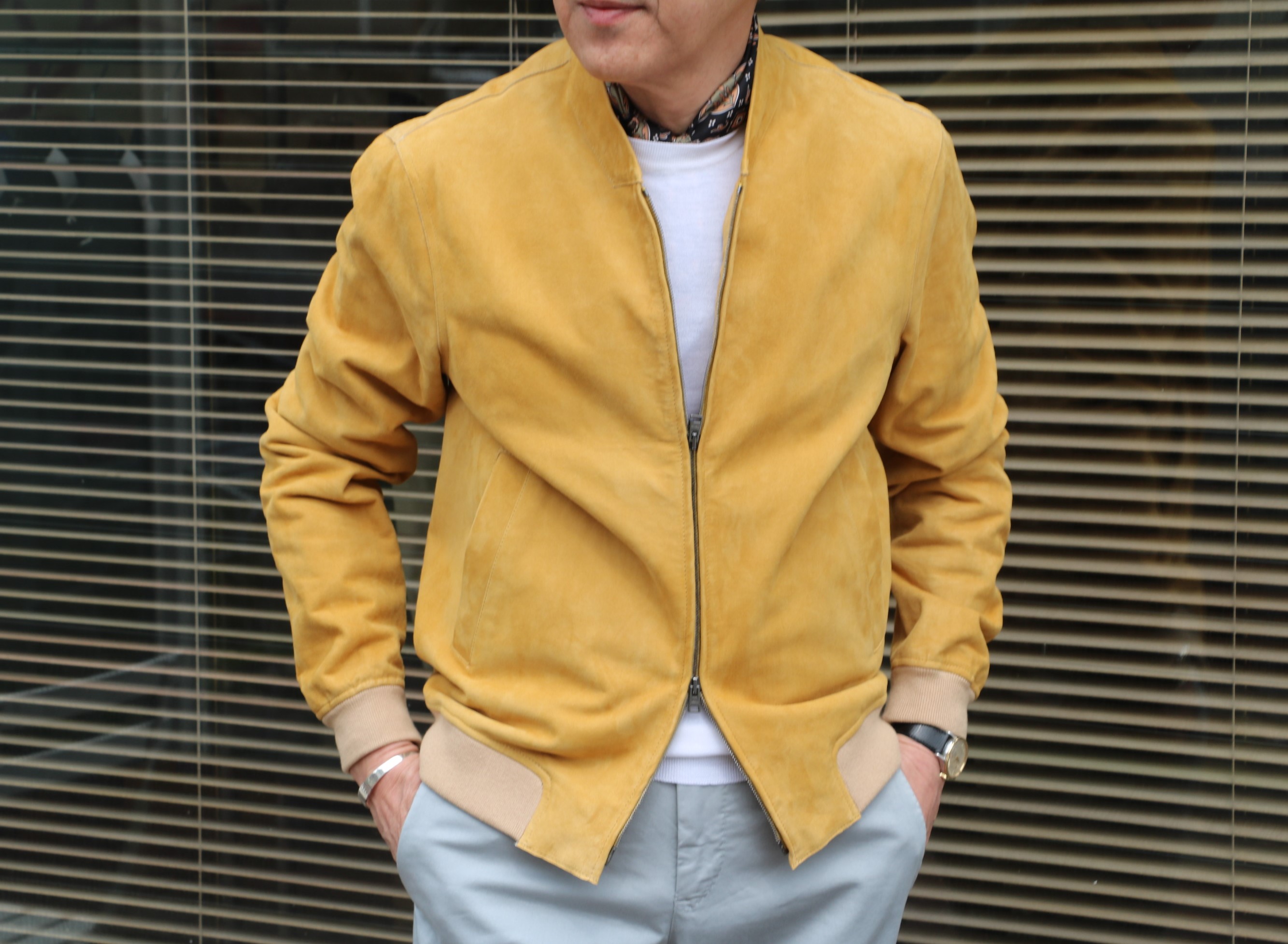 魅力は満載です。まず素材。薄くて耐久性のあるゴートスウェードを使用。そして色合いは、以前、ご案内したミドル丈フーデットブルゾンを思い出してください。玉ねぎの外皮を染色したイエローとは、また一味違う、質感のある色合いです。さらに裏側にボンディングしたジャージ素材により、柔らかな肌当たりとストレッチ性に優れた着心地を実現しています。