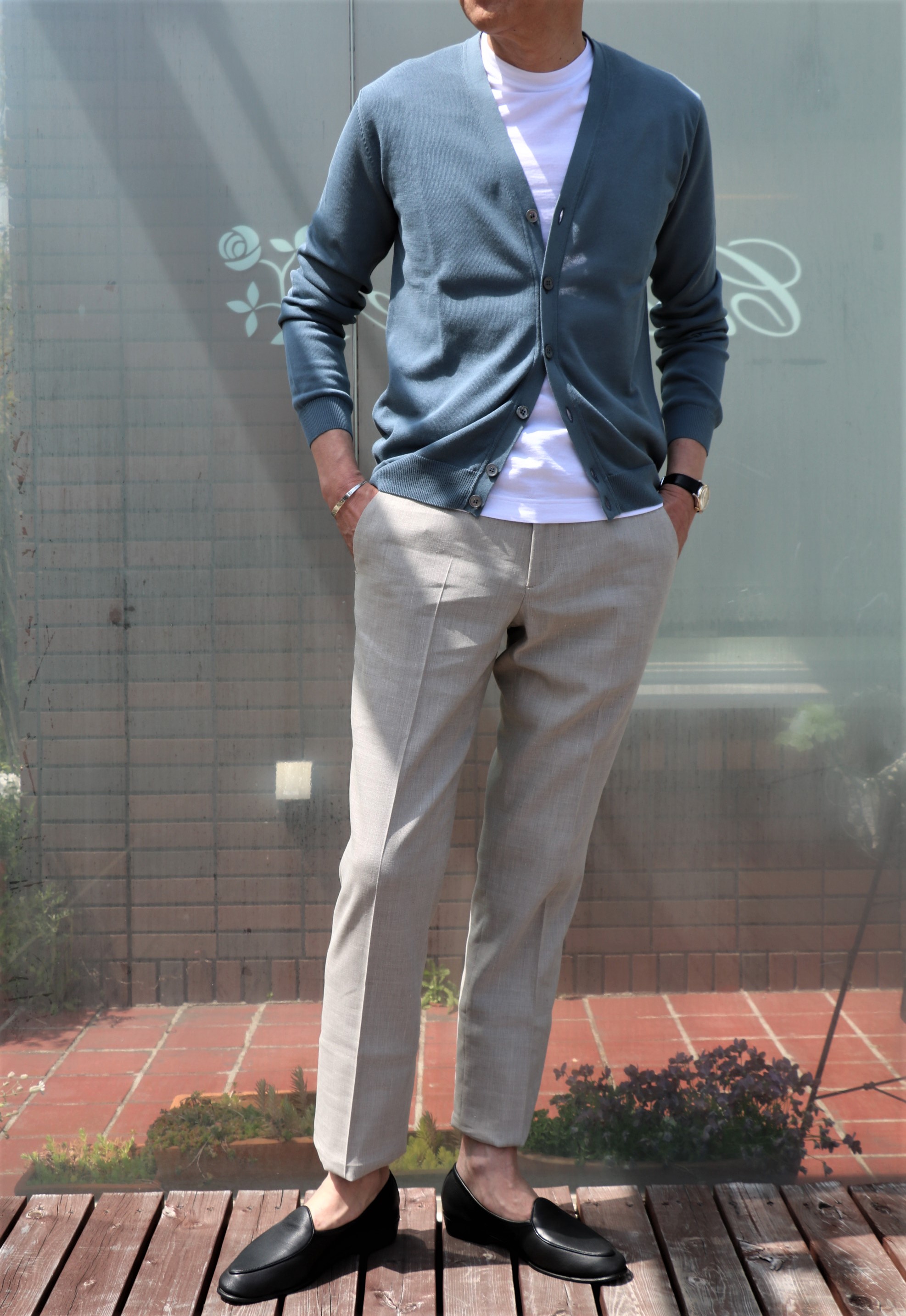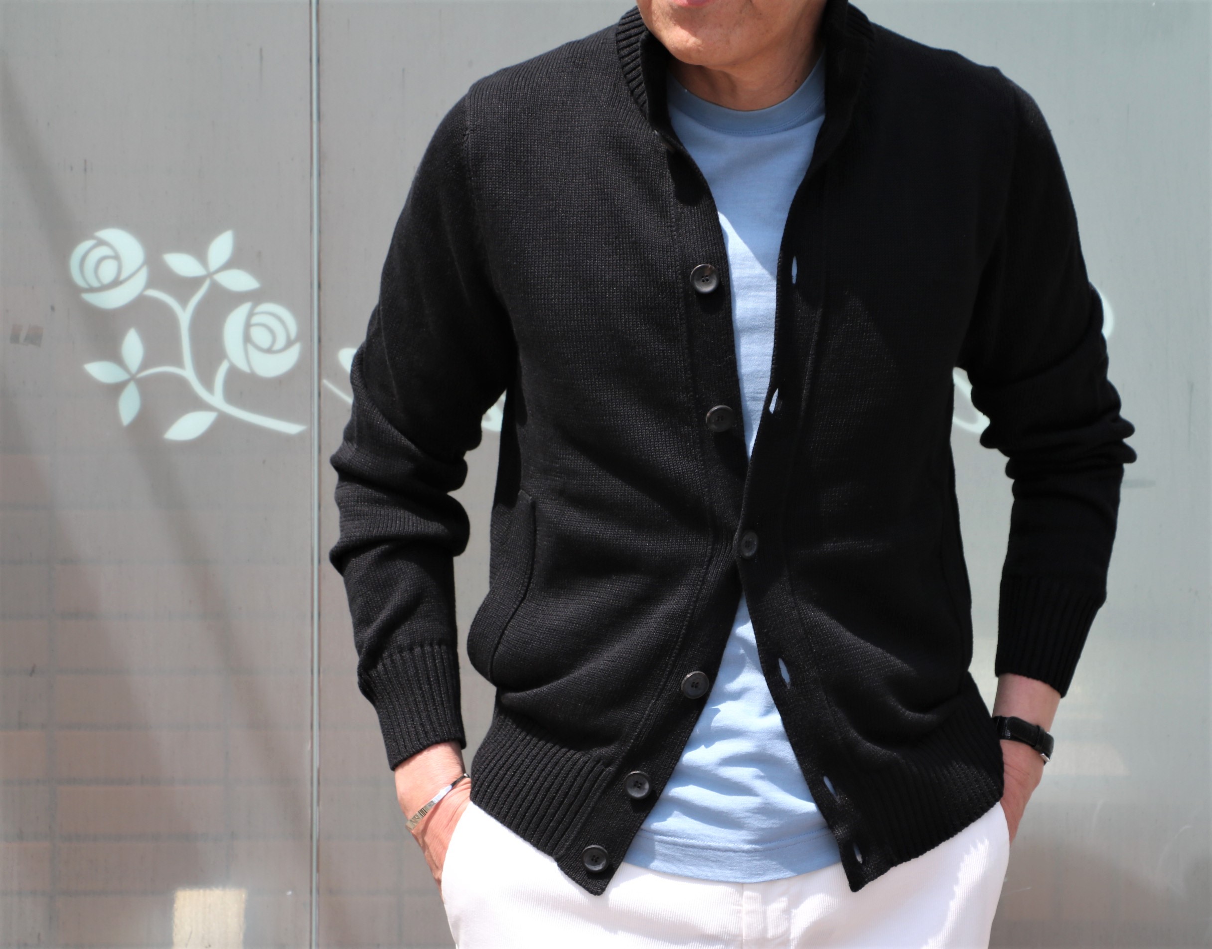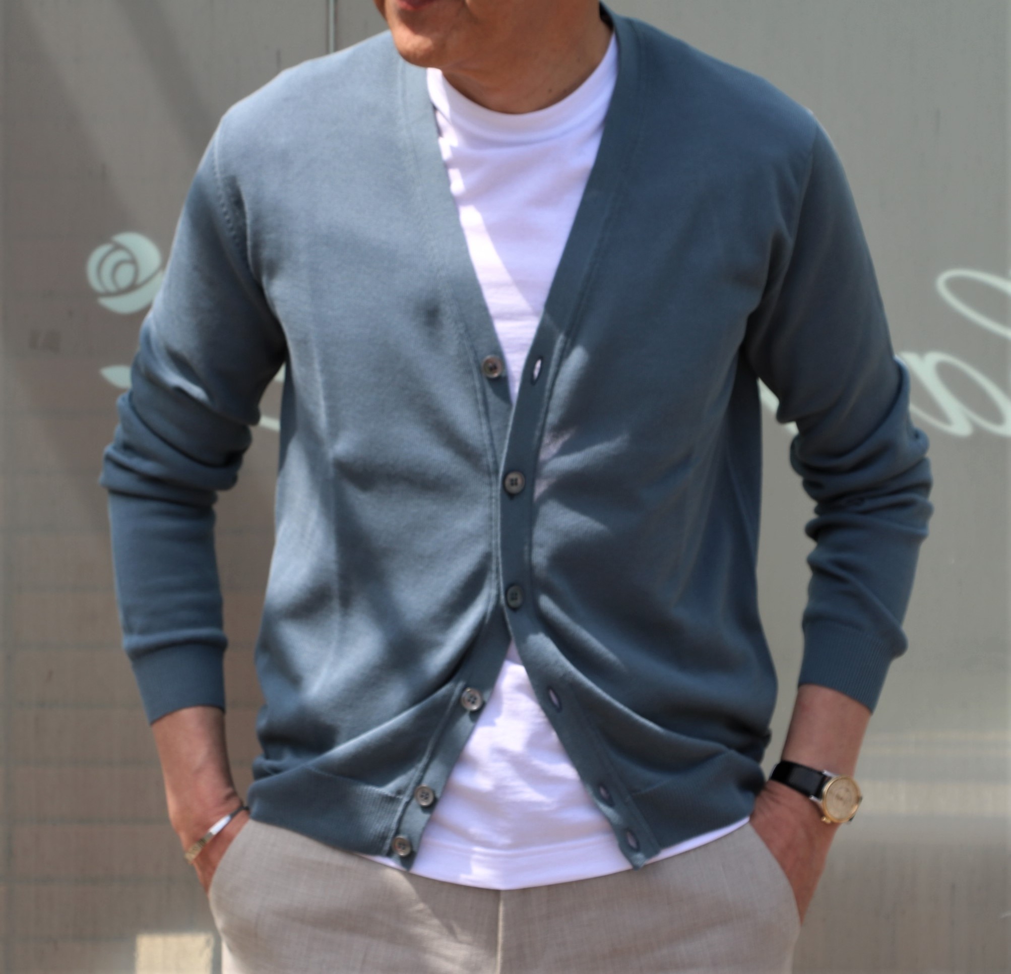ドライコットンのニットカーディガンは、ヘザーグレイとセルリアンブルーの2色。自然素材の柔らかさと無機質でクールな色合いは、昔からザノーネカラーと勝手に呼んでいるほど、魅力的です。