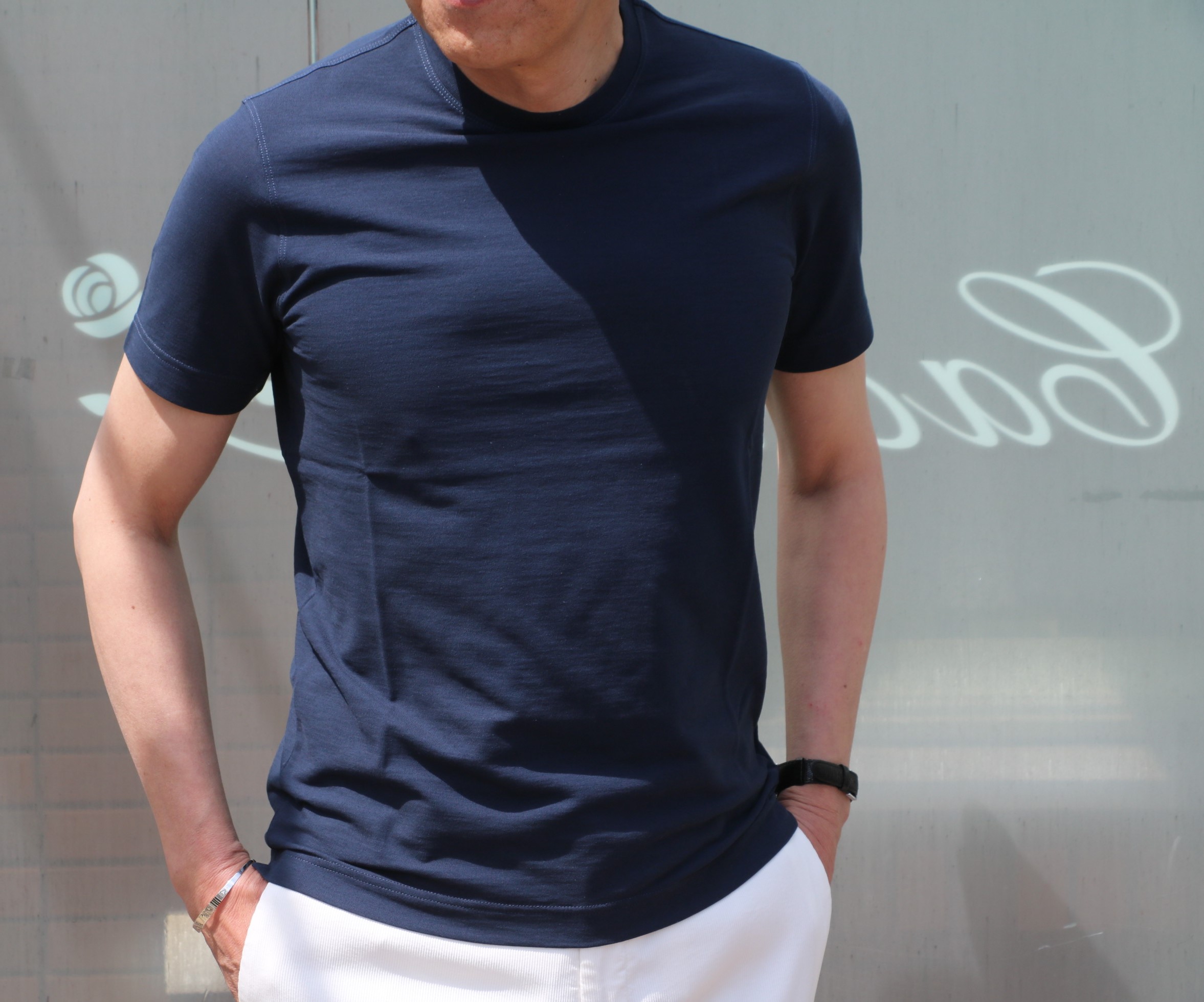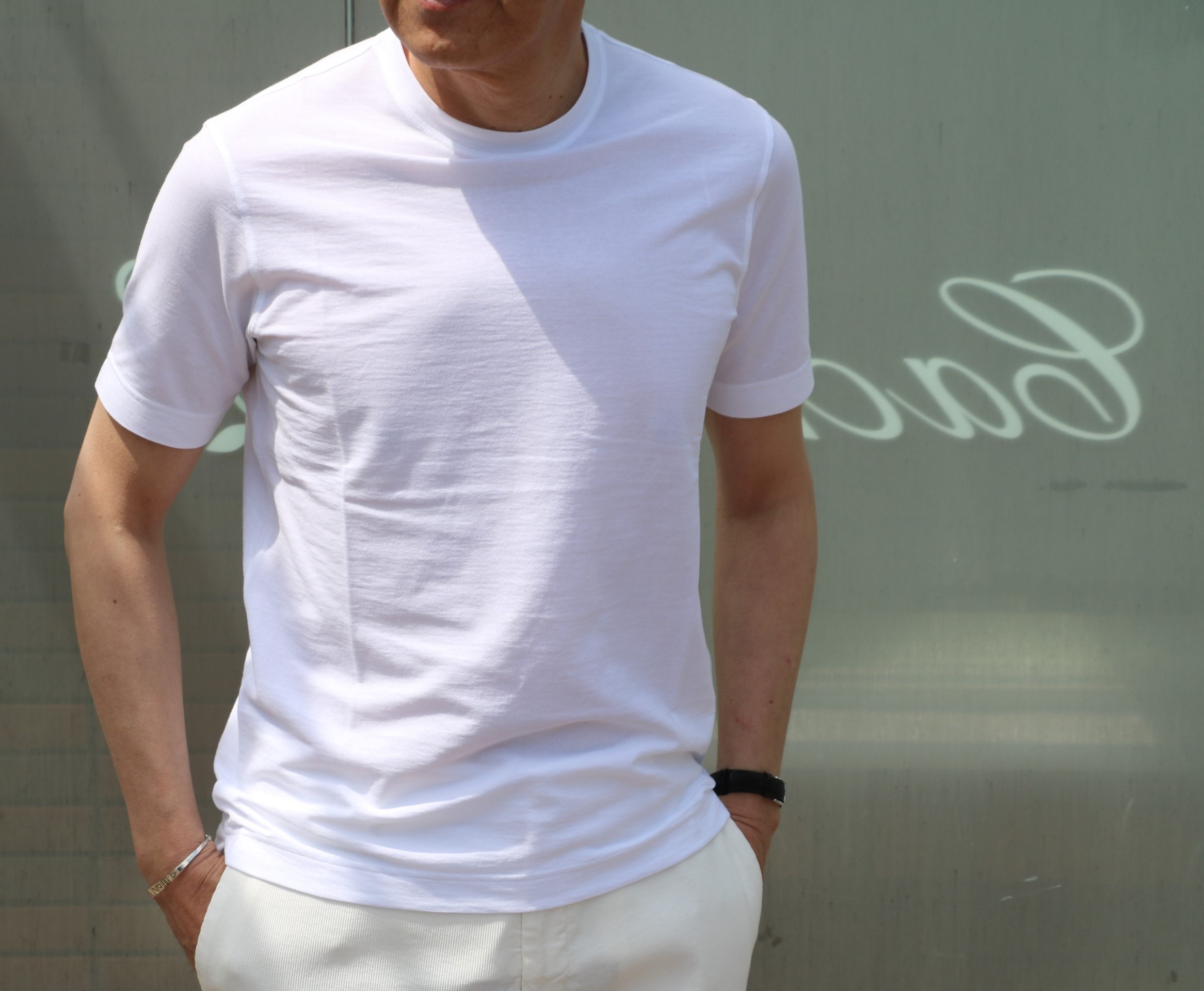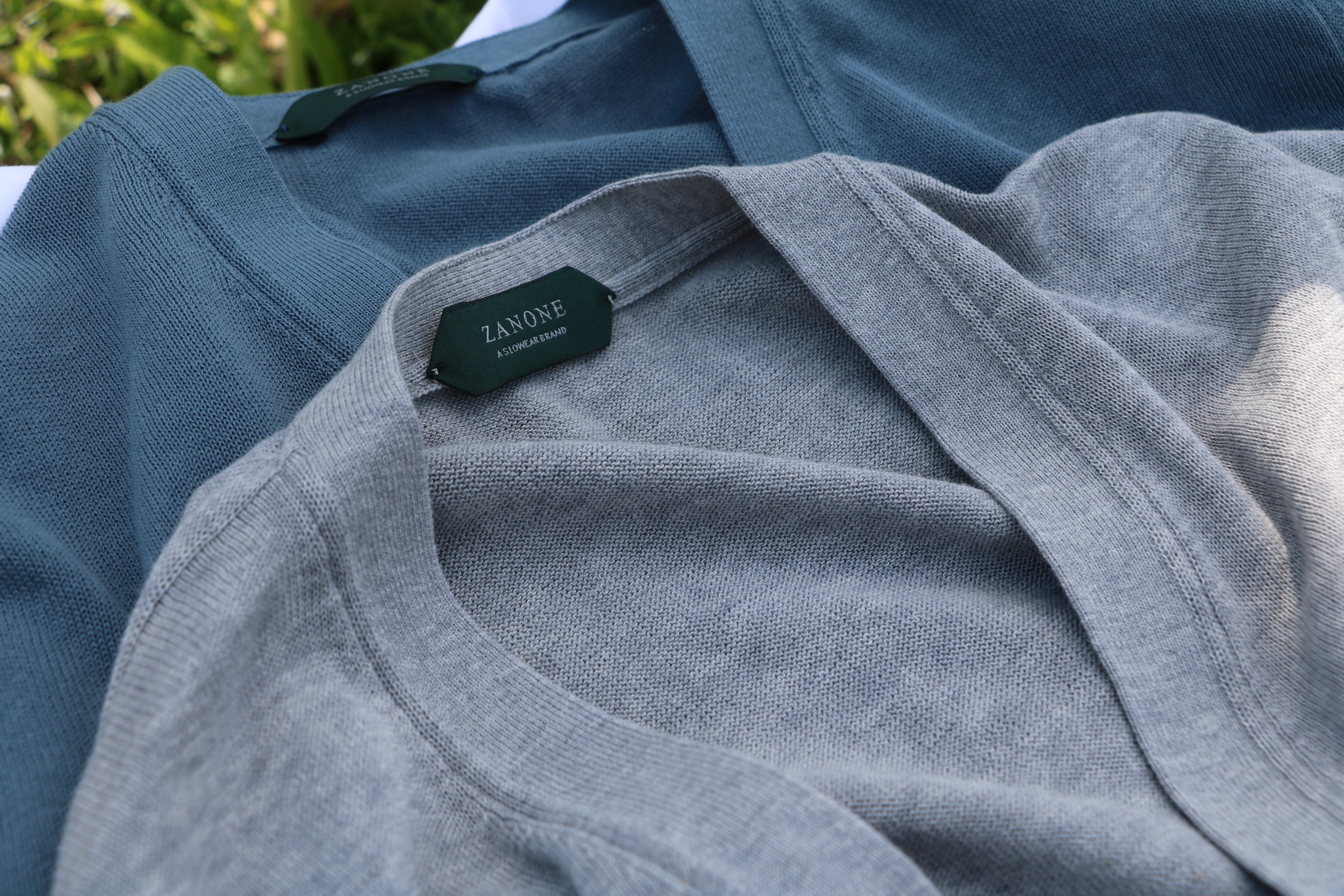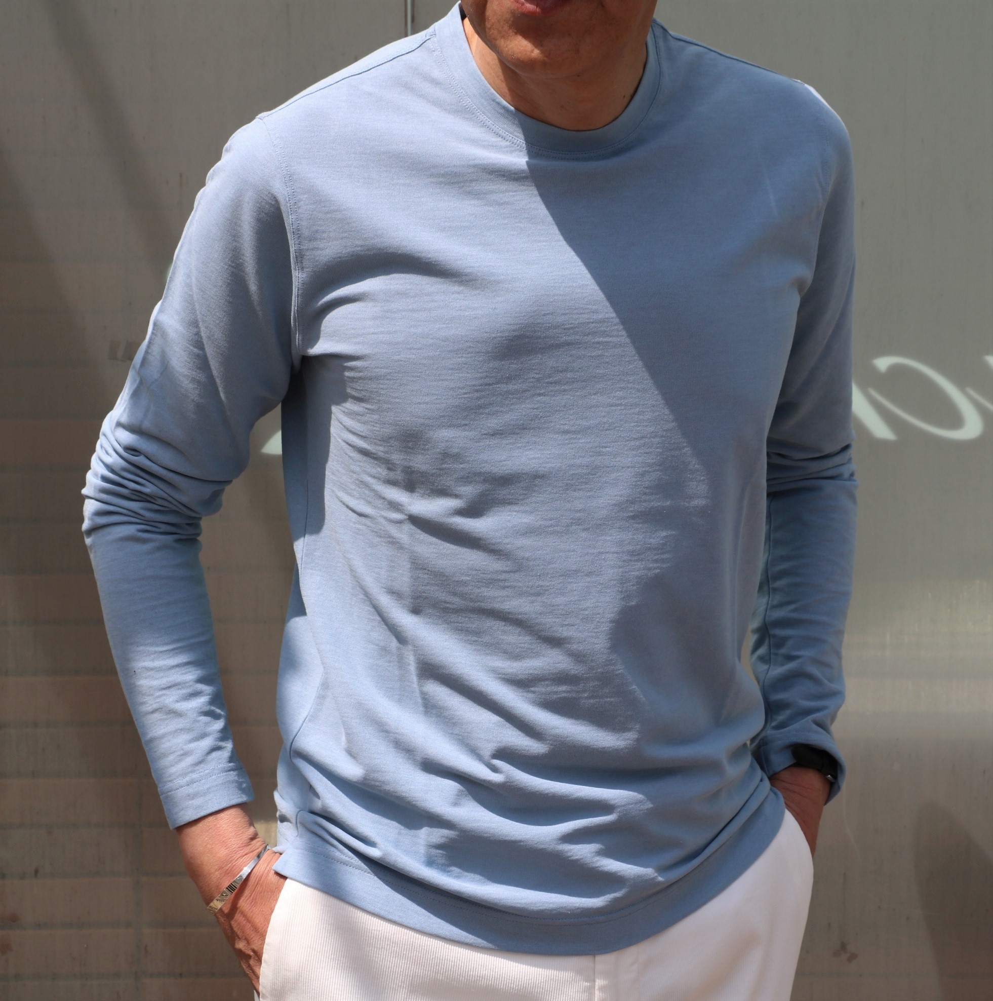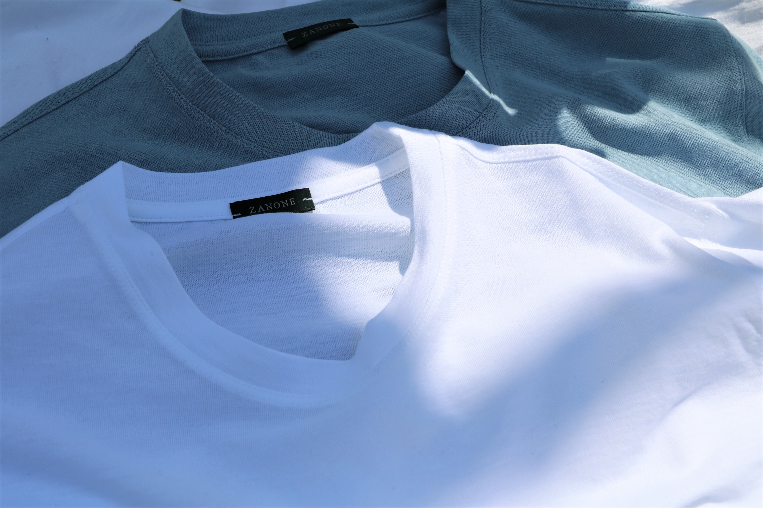 ザノーネの夏の風物詩といえば、ICE COTTON。今季はロングスリーブで、ホワイトとシャワーブルー(勝手に付けた名前です)の2色です。色目は、下の写真を参考にしてください。