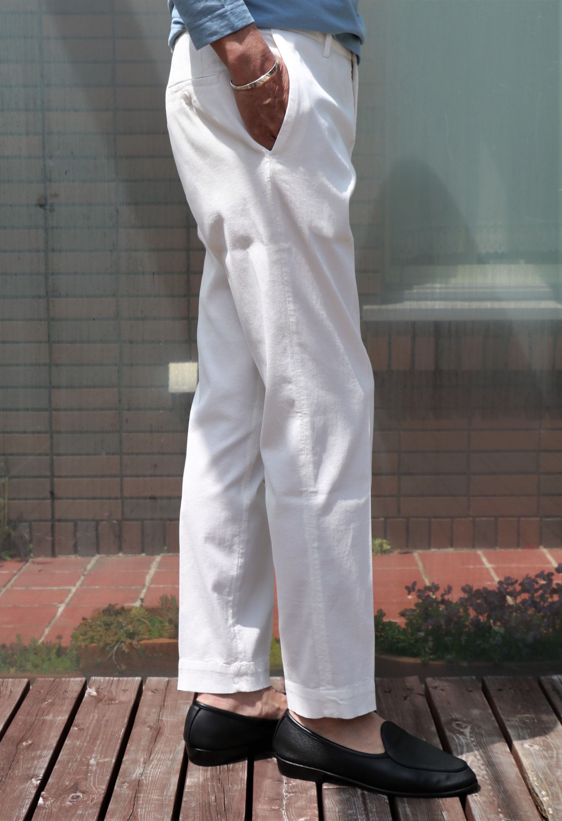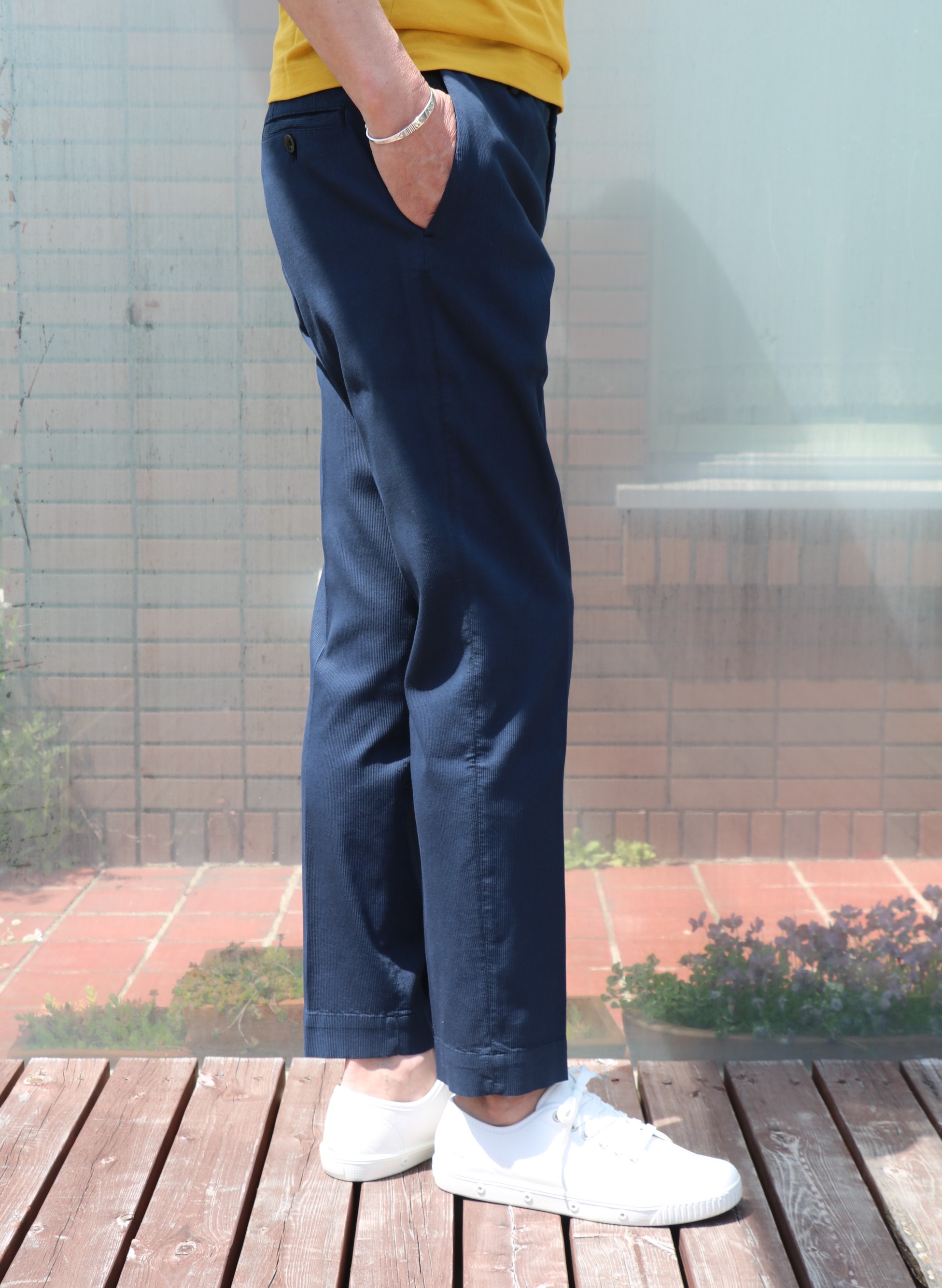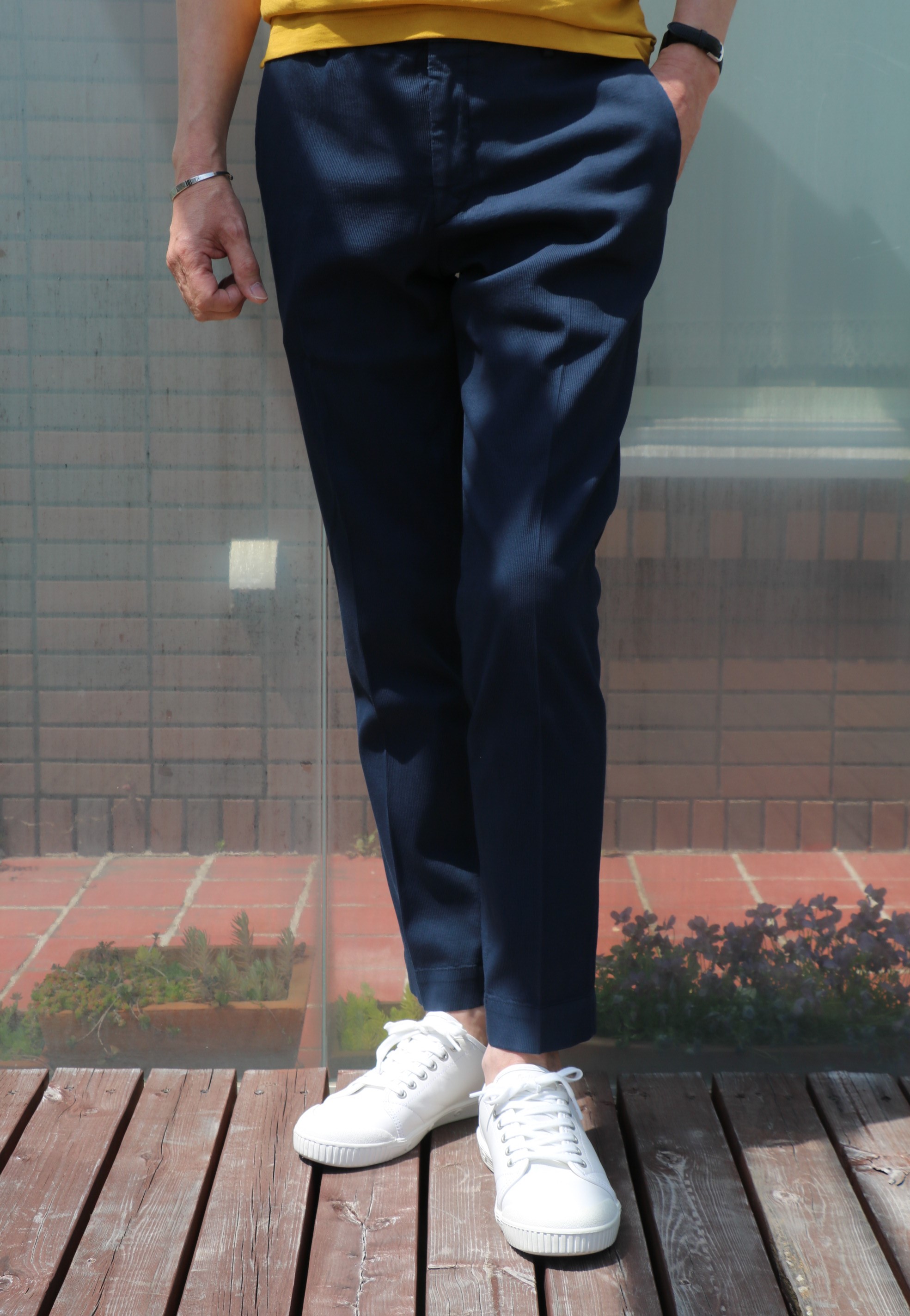 ザノーネのご紹介に大活躍してくれたのが、このコットンストレッチのピケ織りパンツ。グローリーガイの店頭では、スリムフィットの30番に次いで人気の「LOW RISE CARROT fit」。程よく腰回りにゆとりを持たせ、裾幅にかけてのテーパードフォルムは、まさに大人のゆとりを感じさせてくれます。
