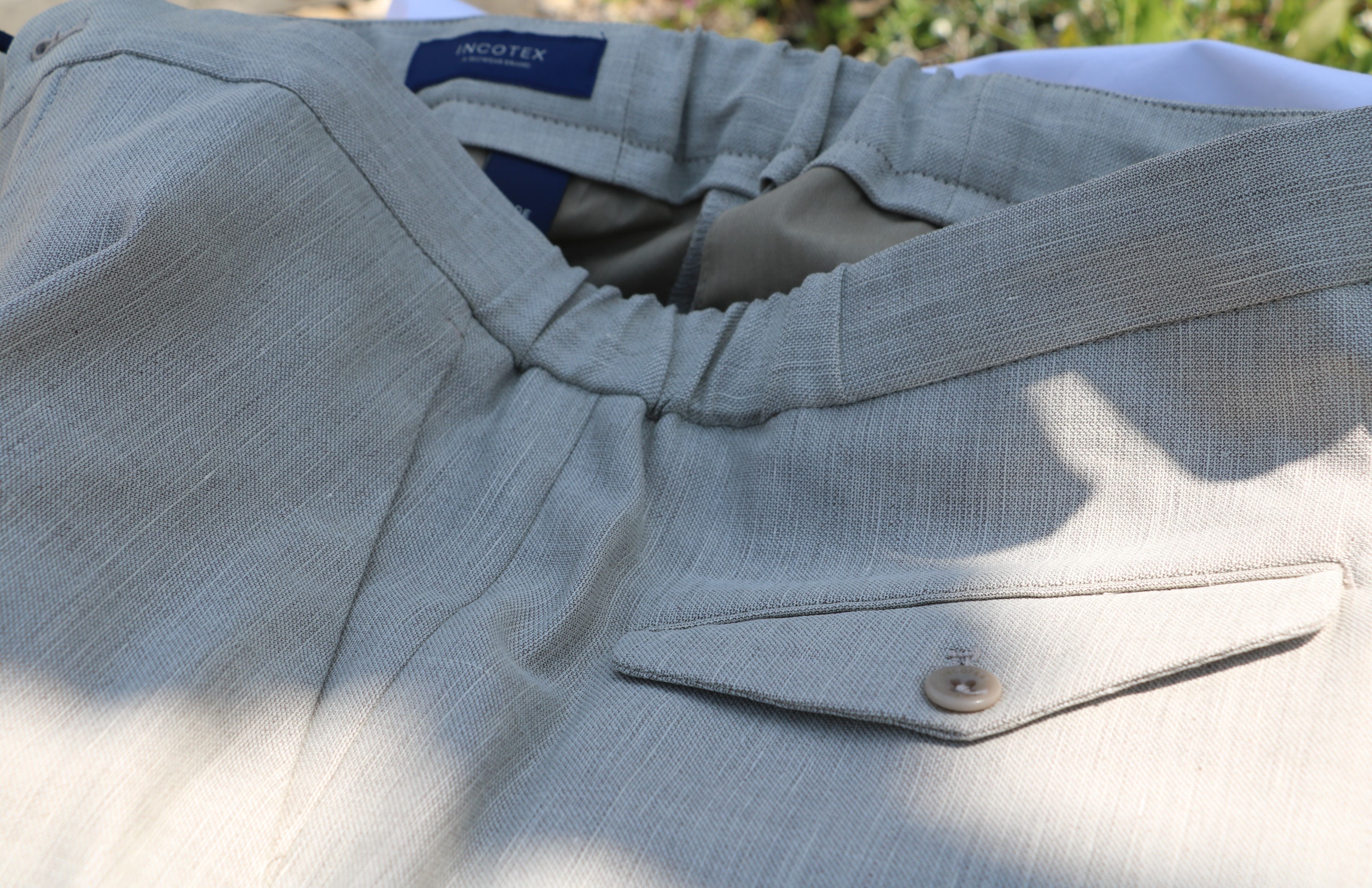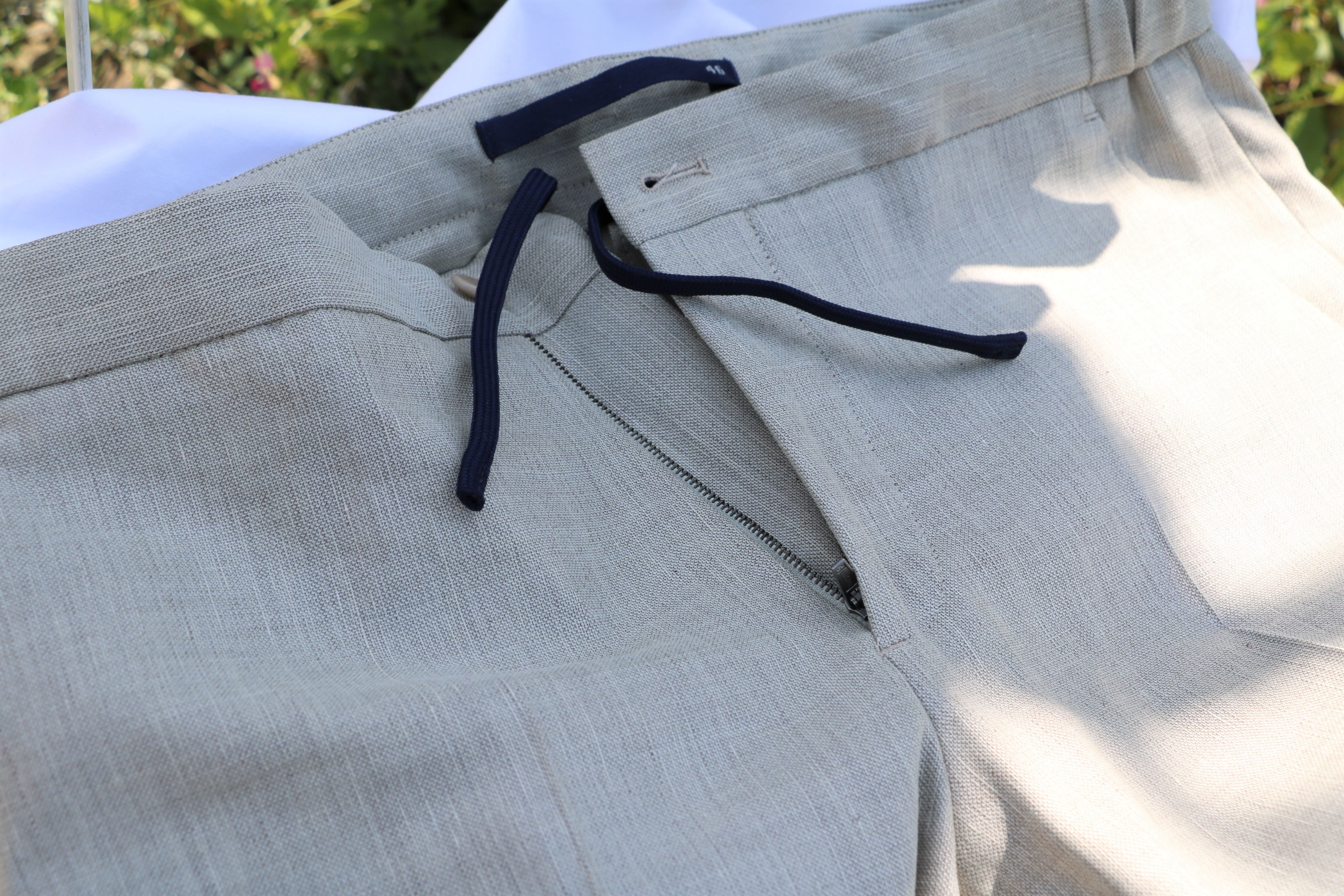 昨日ご案内の立ち襟カーディガン「CHIOTO」に、そしてドライコットンのVネックカーディガンに合わせていたのが、こちら【INCOTEX/インコテックス】のドローコード付きシャーリングパンツ「1AG064」モデル。欲張りにもウール・リネン・コットン・ポリウレタン混紡と、いいとこどりのイージーパンツです。朝陽を浴びた砂浜のような柔らかなライトベージュは、ドライな手触りです。