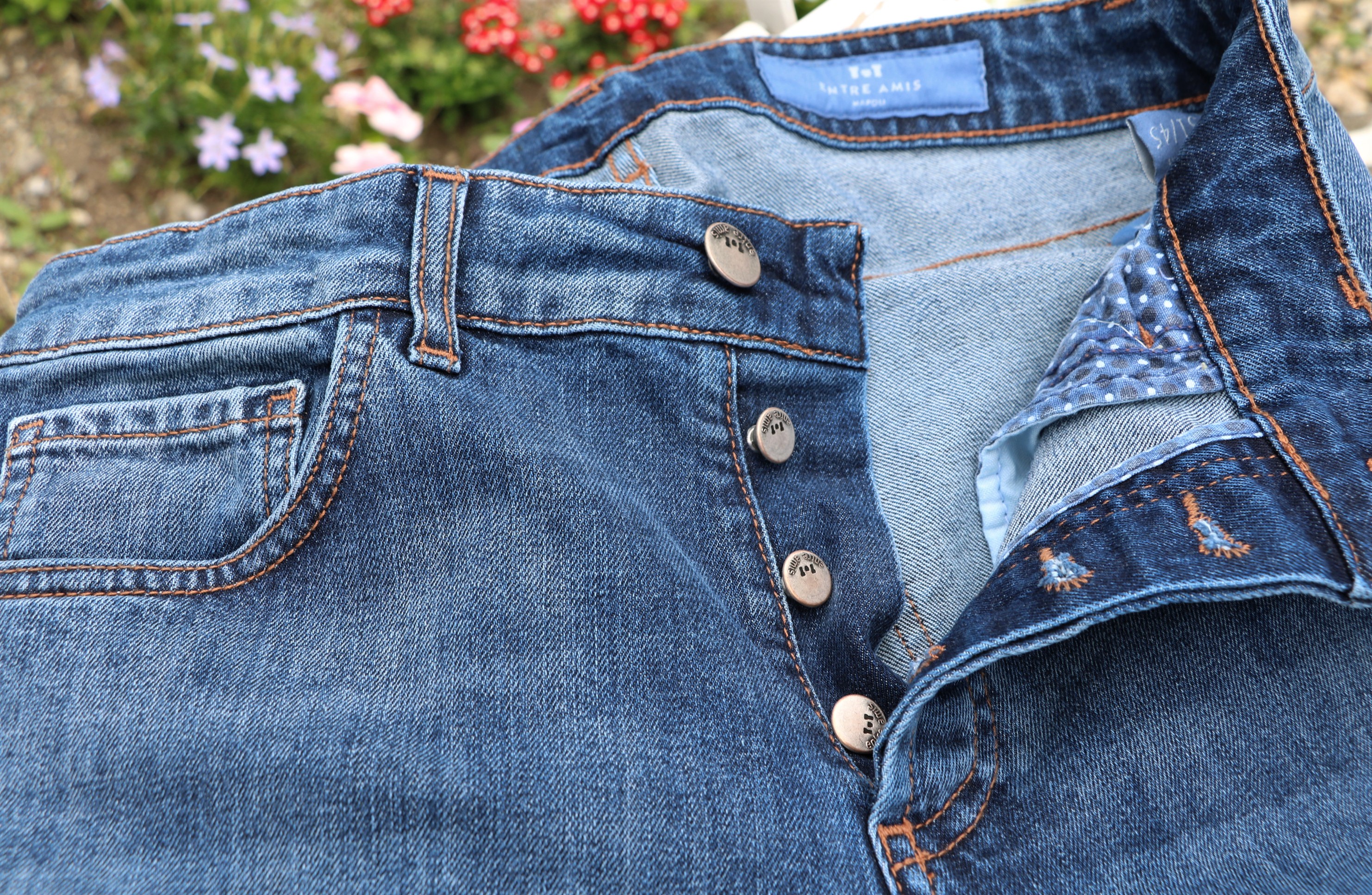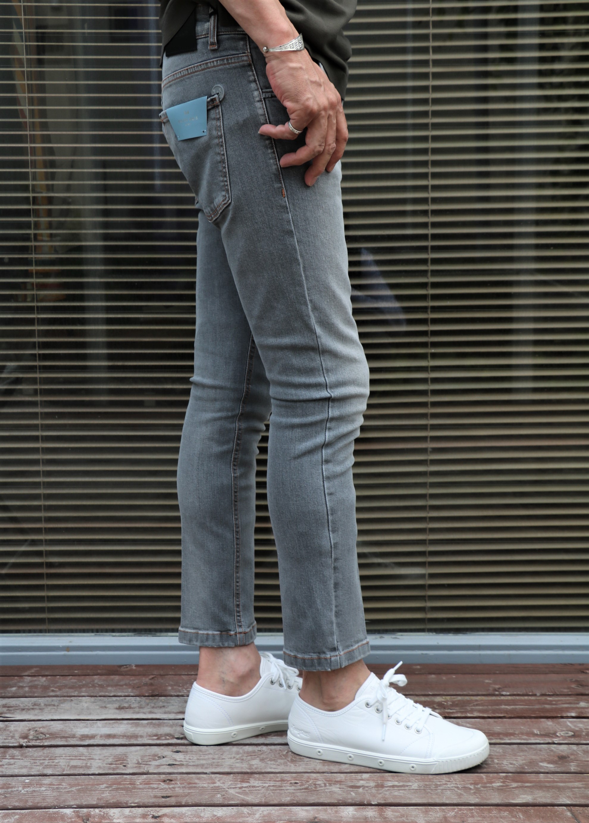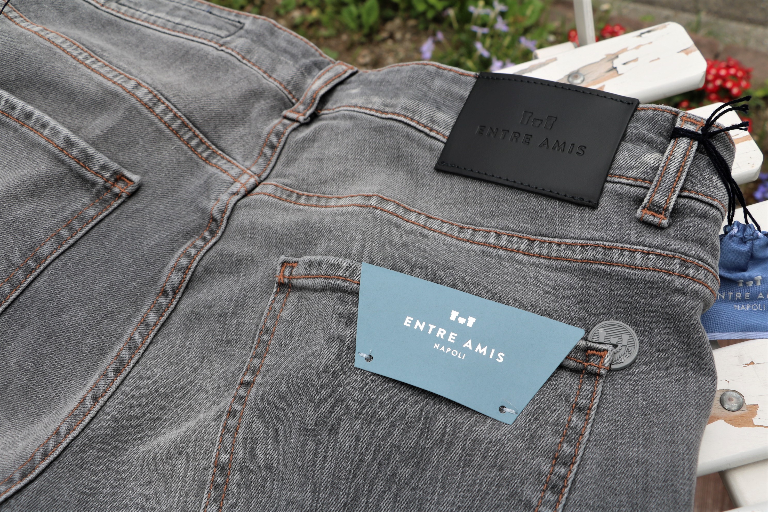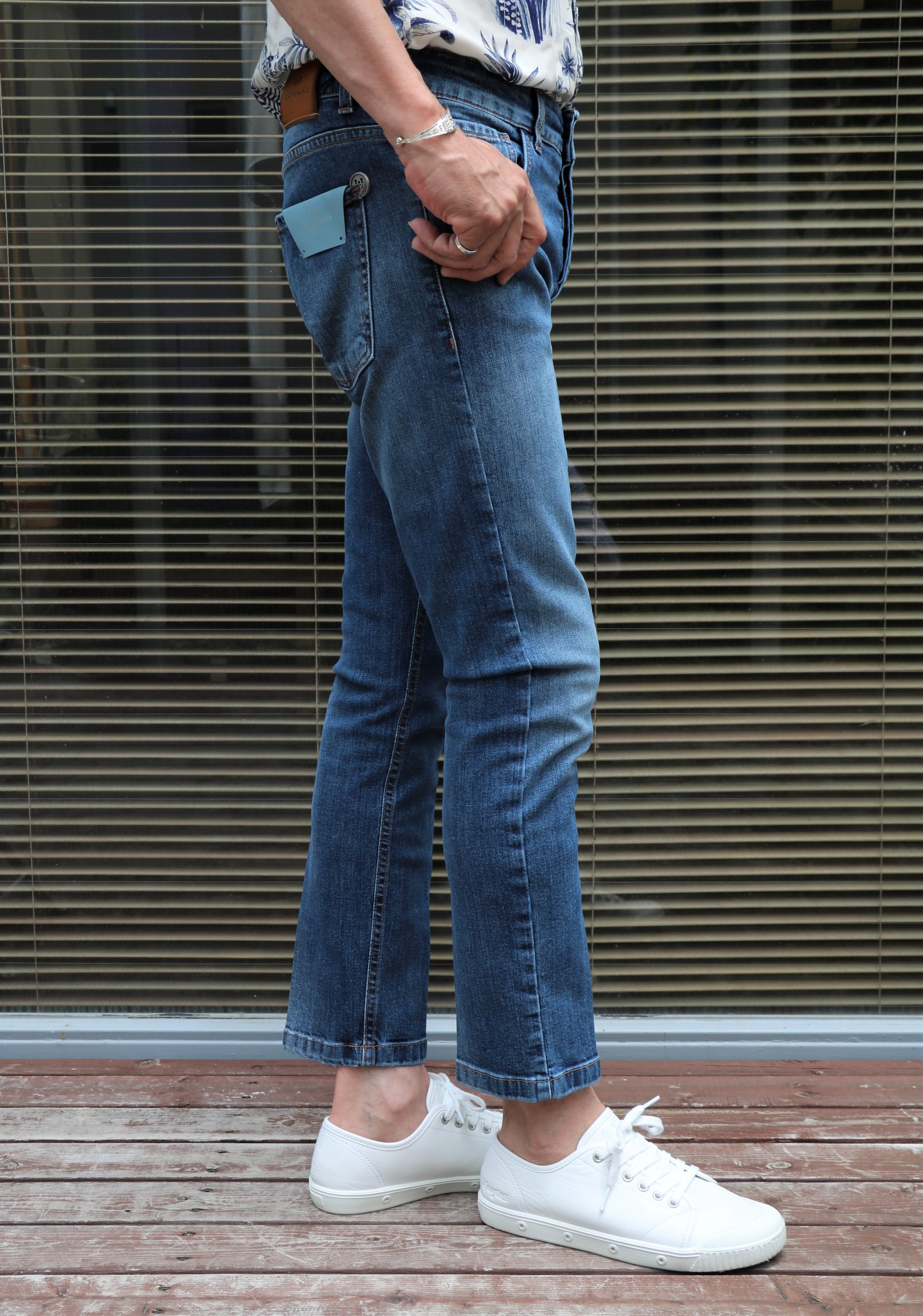 本日は、久しぶりにジーンズのご案内です。穿いたのは、ナポリ発の【entre amis/アントレアミ】。昨年までは、蔵庫/マガジーノで展開しており、グローリーガイでは初めて。詳しいマスヤマに教えてもらいながらのご提案になります。モデルは、ブランドの代名詞となる、九分丈の「GAGA//ガガ」。ただ最近は、その慣れ親しんだモデル名は、明記されていないようです。
