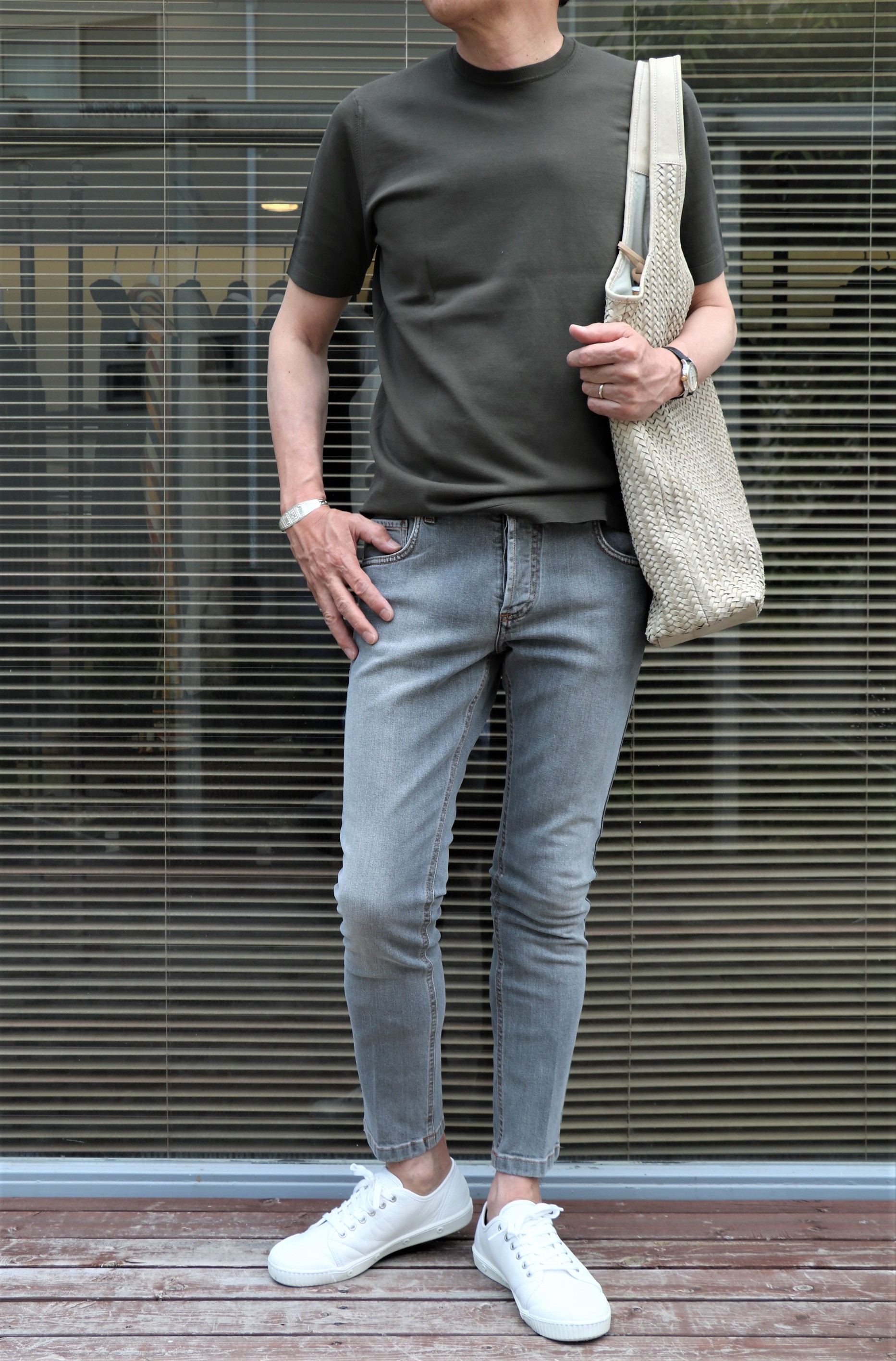 合わせたニットTはFILLIPODE LAURENTIS(フィリッポ デ ローレンティス)、バッグはTIBERIO FERRETTI(ティベリオ フェレッティ)、靴は私物のSPRING COURT(スプリングコート)です。
