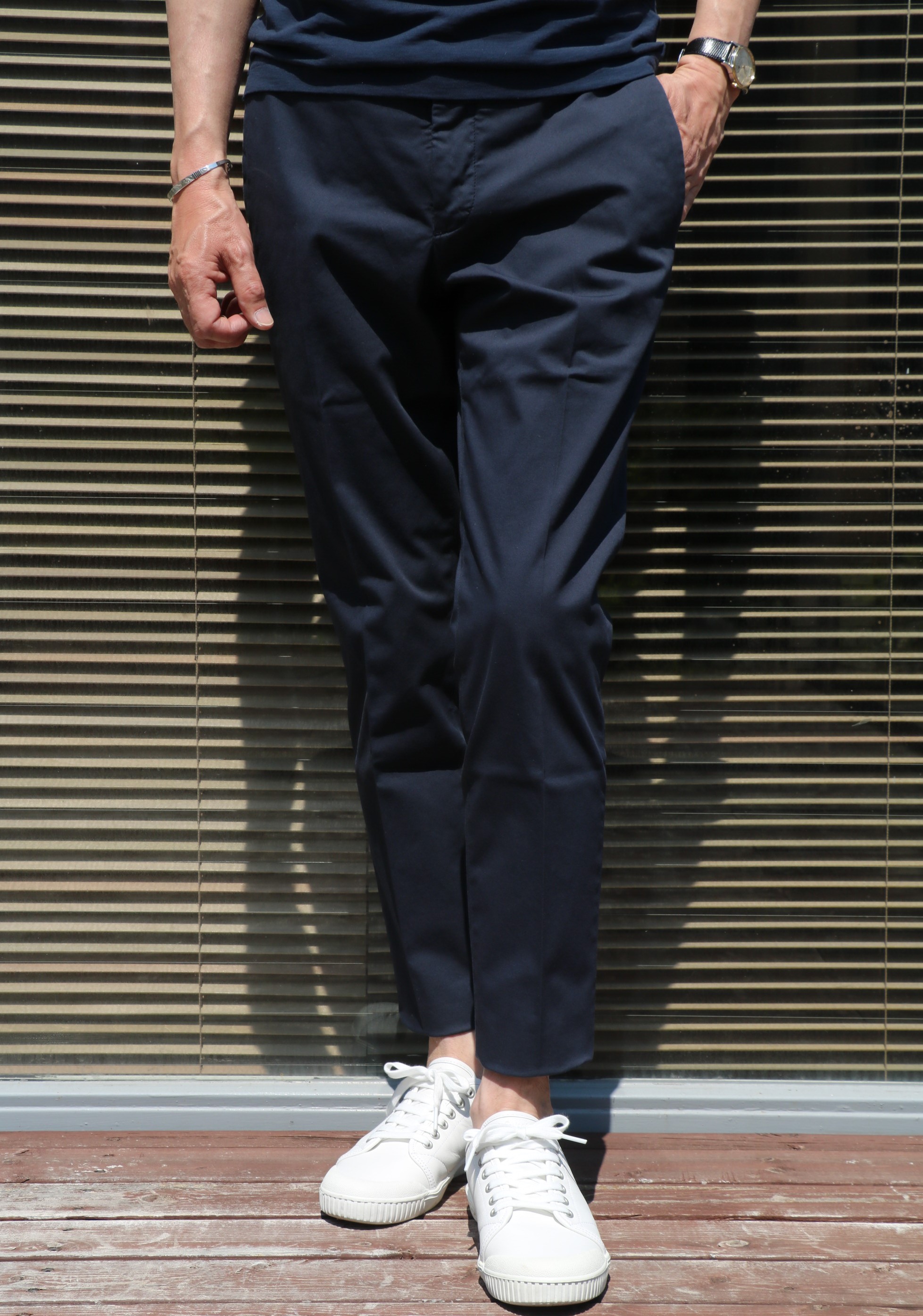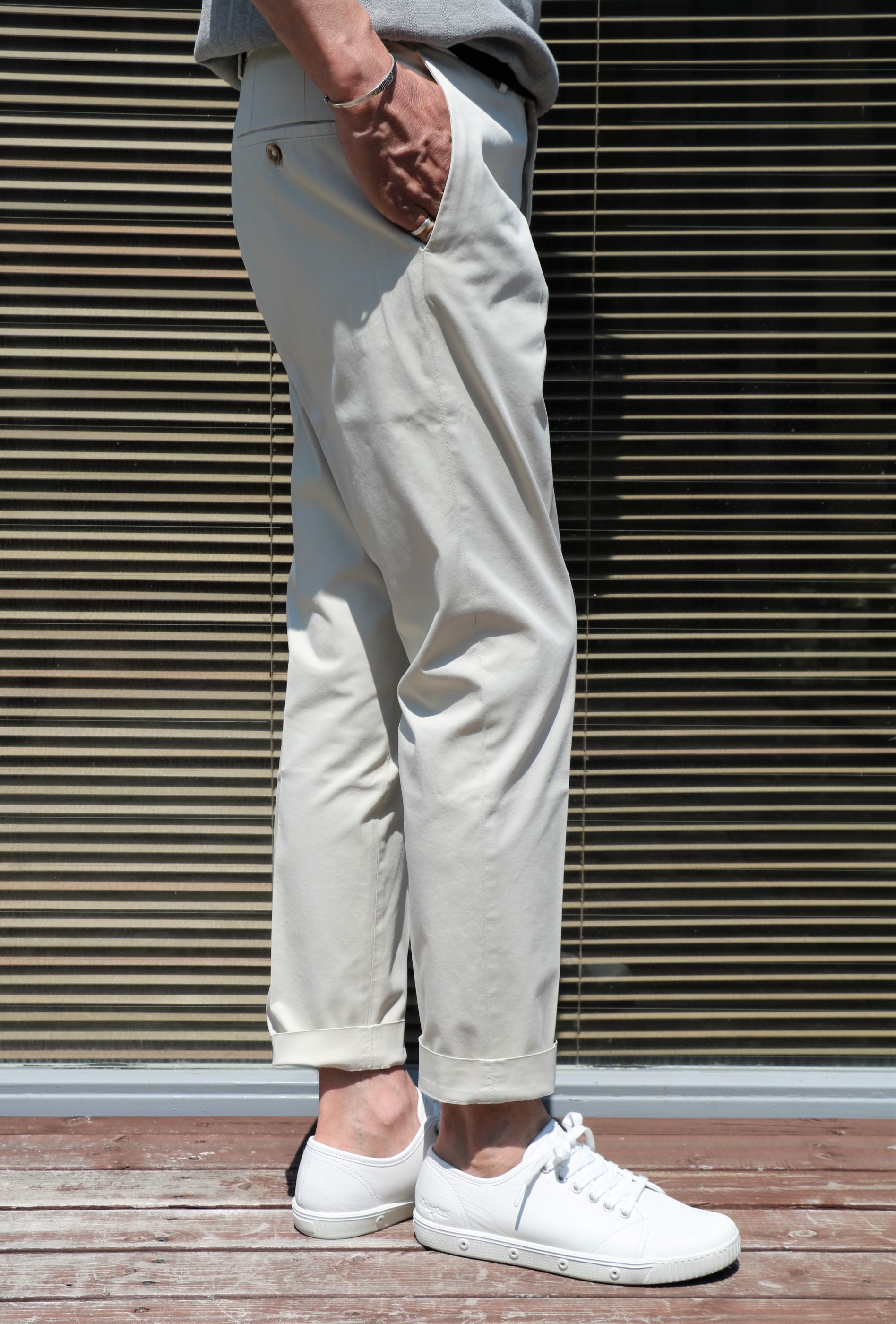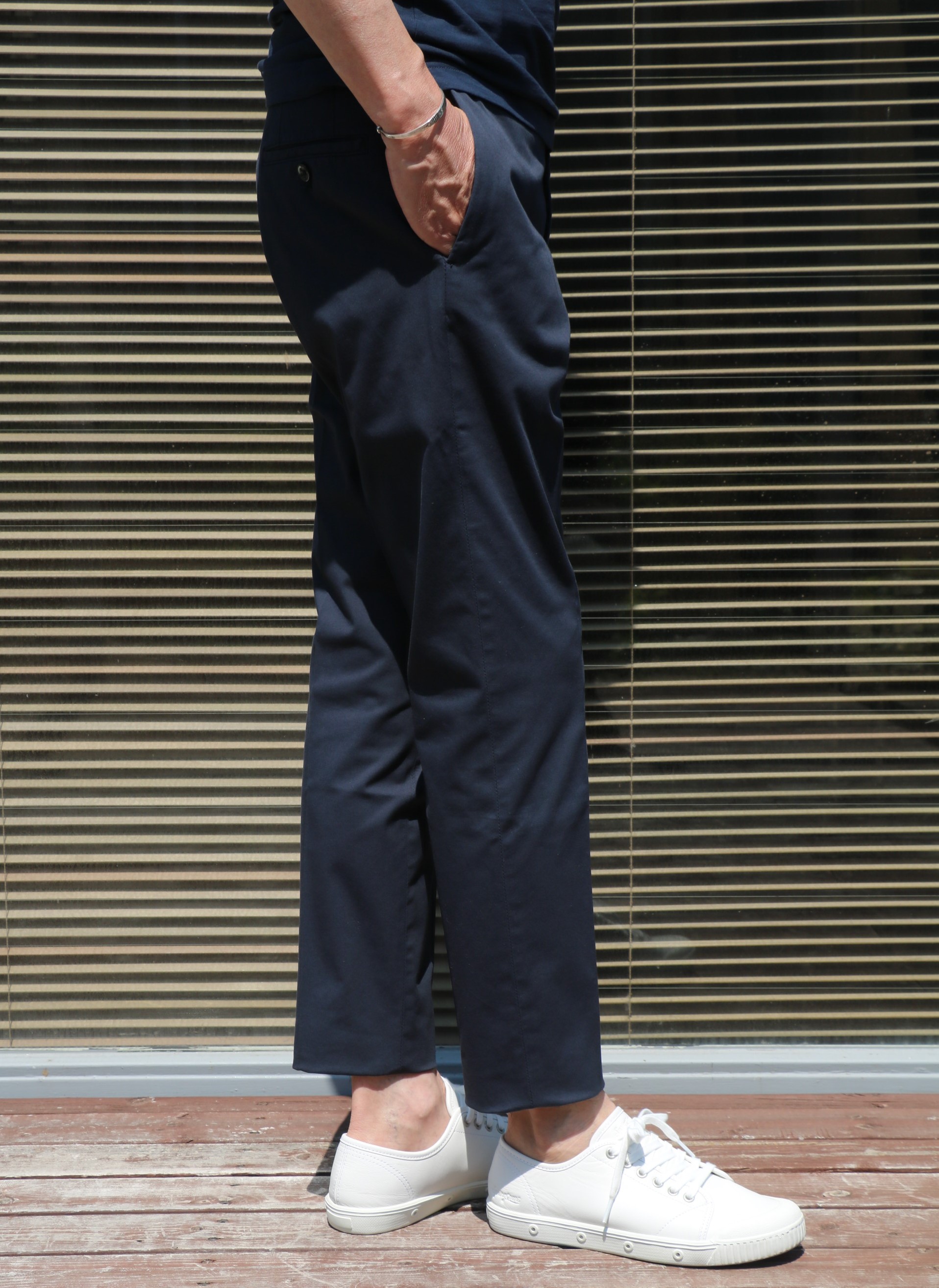 大好きです。客観的にならなければと思いながらも、またまた主観的な意見です。ほんとに普通に見えるストレッチの効いたコットンギャバのパンツですが「ROYAL BATAVIA」のハイコンフォートな生地感と穿き心地に驚かされます。さりげなく穿くだけで、"太陽がいっぱい"のアラン・ドロンになった気分になれる...はずです。普通だけど、色気のある映画、いやパンツなんです。