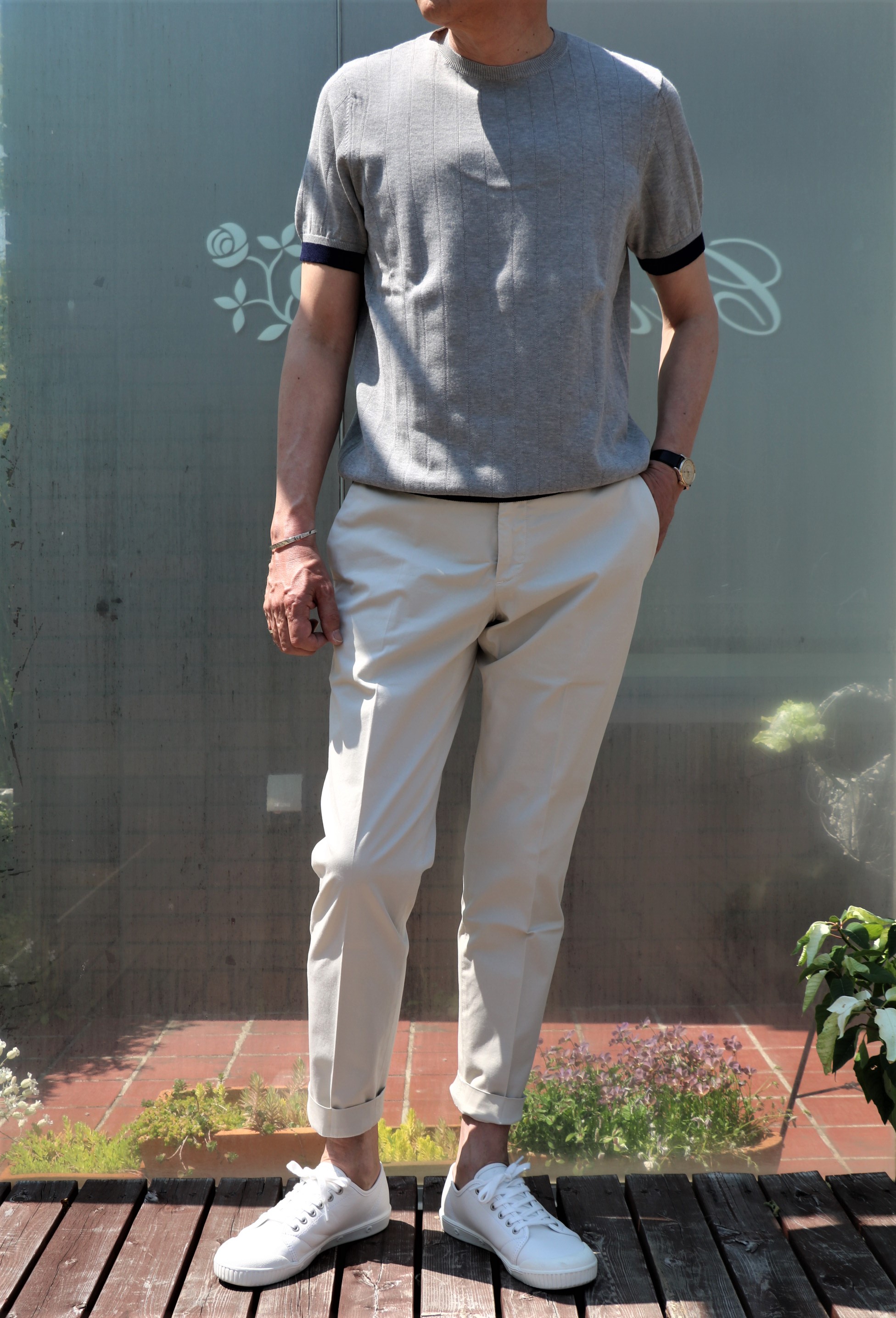 今季のテーマとしたのが、ワークの他にマリンスタイル。車で40分程と海が近い岡崎だけに、この夏はマリン気分で...そう思っていたのは、私以上にジュニア。こんな時代でなければ、もっと注目されていたはずと嘆くのは、PAUL&SHARK(ポールアンドシャーク)。確かに、気温が上がるほど、そんな気分にさせられます。「頑張って、ヨットを買おう!!」って、慰めてはおりますが...。おっと、足元をデッキシューズにすべきところが、ついつい面倒でいつものスニーカーになってしまいました。