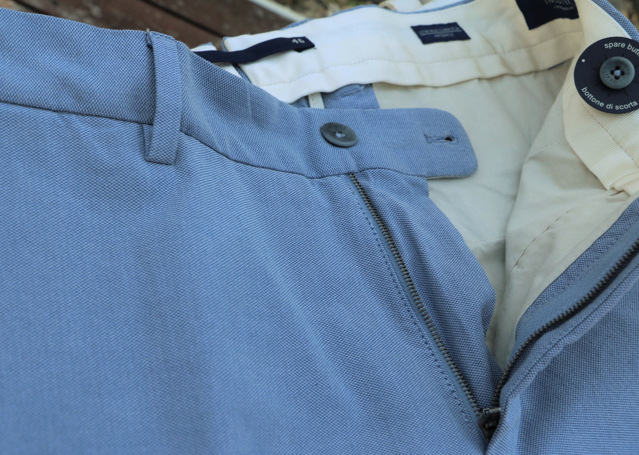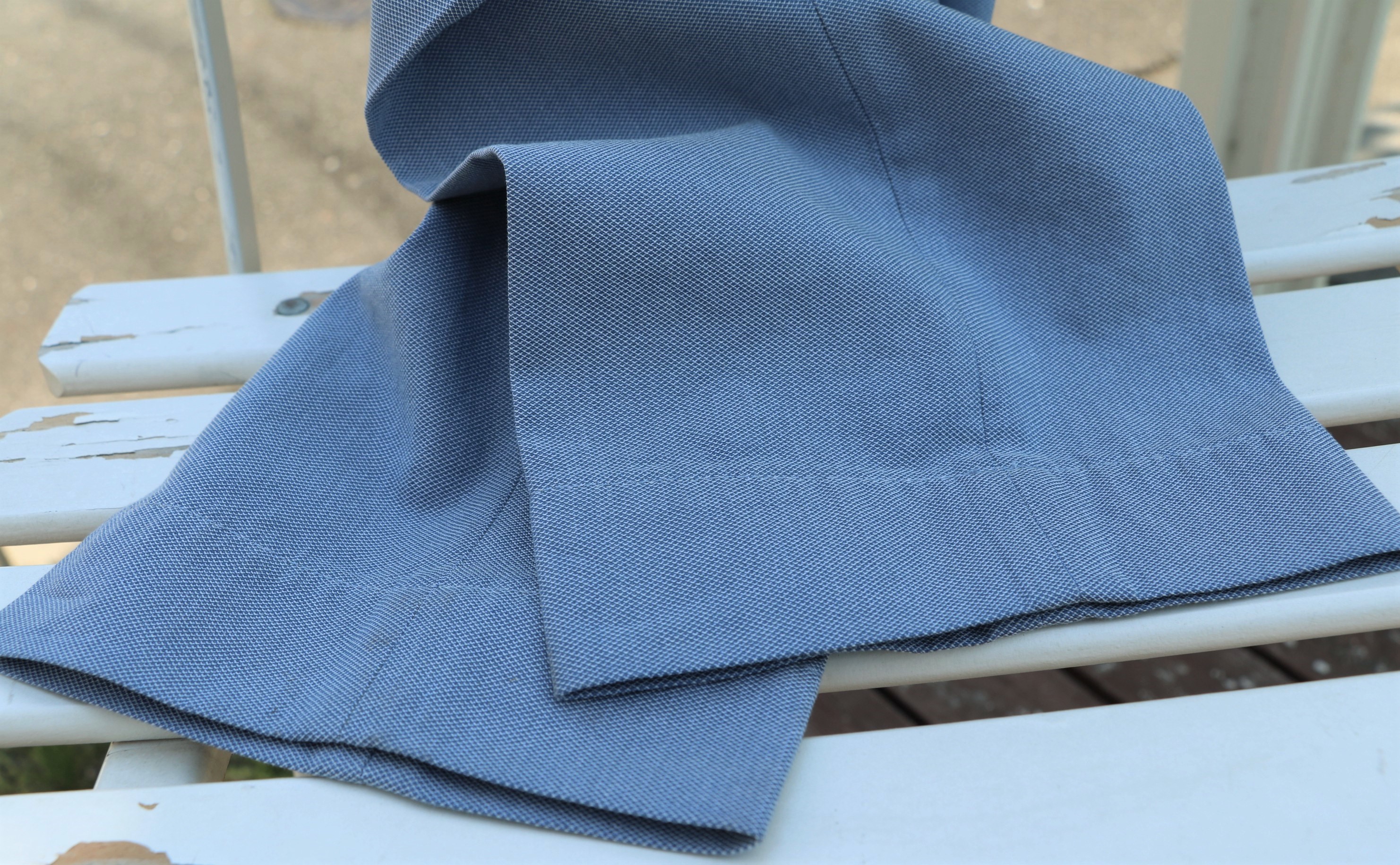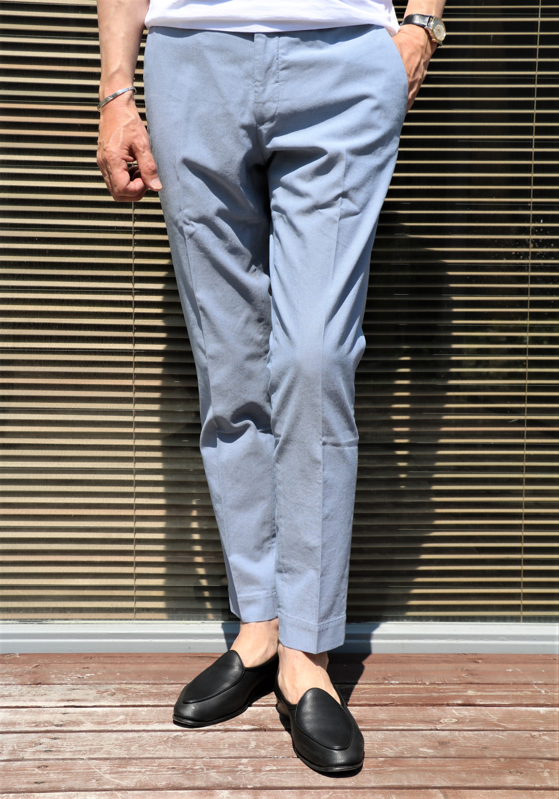 オックスフォードに似た平織りのコットンストレッチパンツは、ドライな質感です。シャツ地にみるサックスブルーほど明るくはなく、色調の抑えられたスモーキーなブルーです。