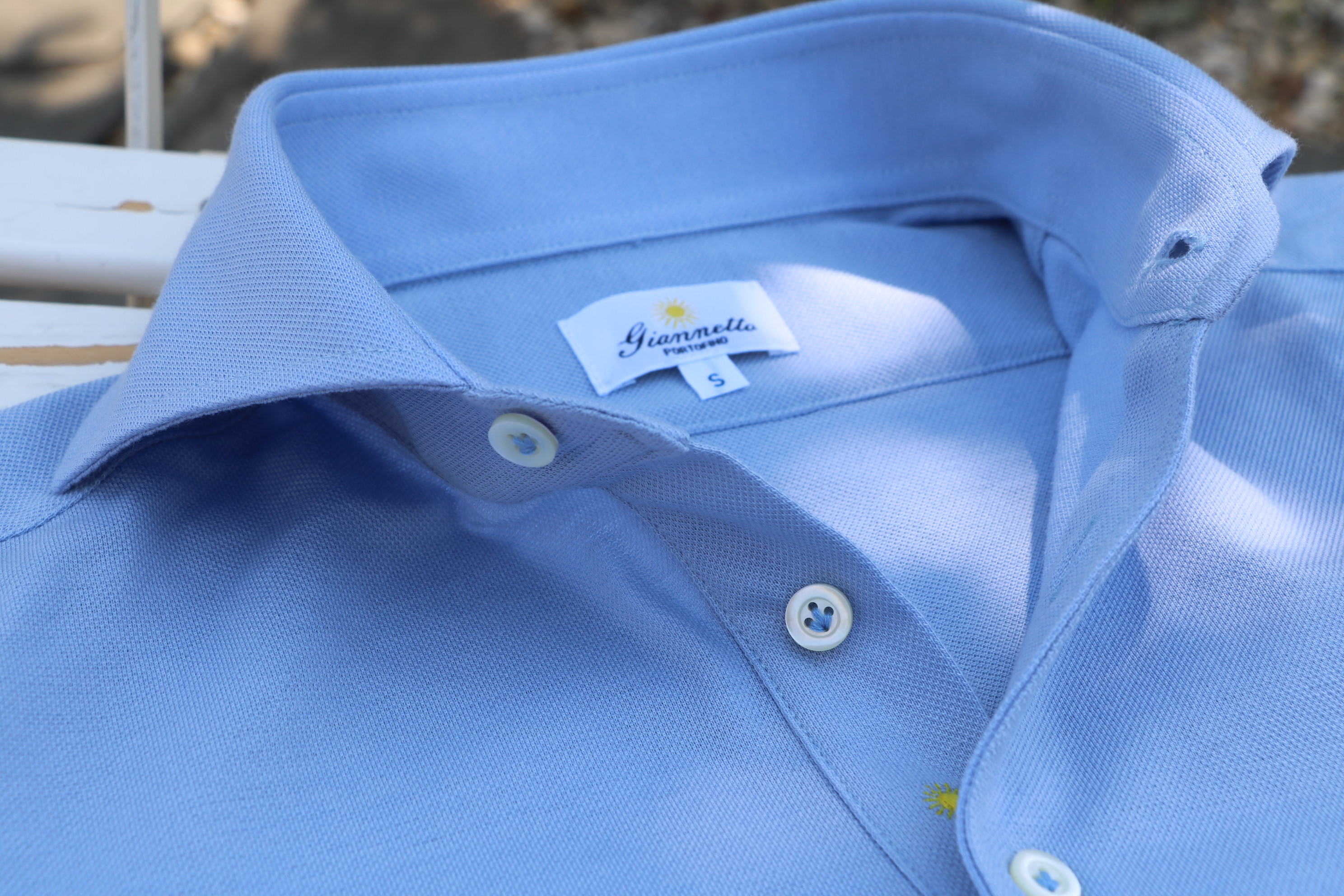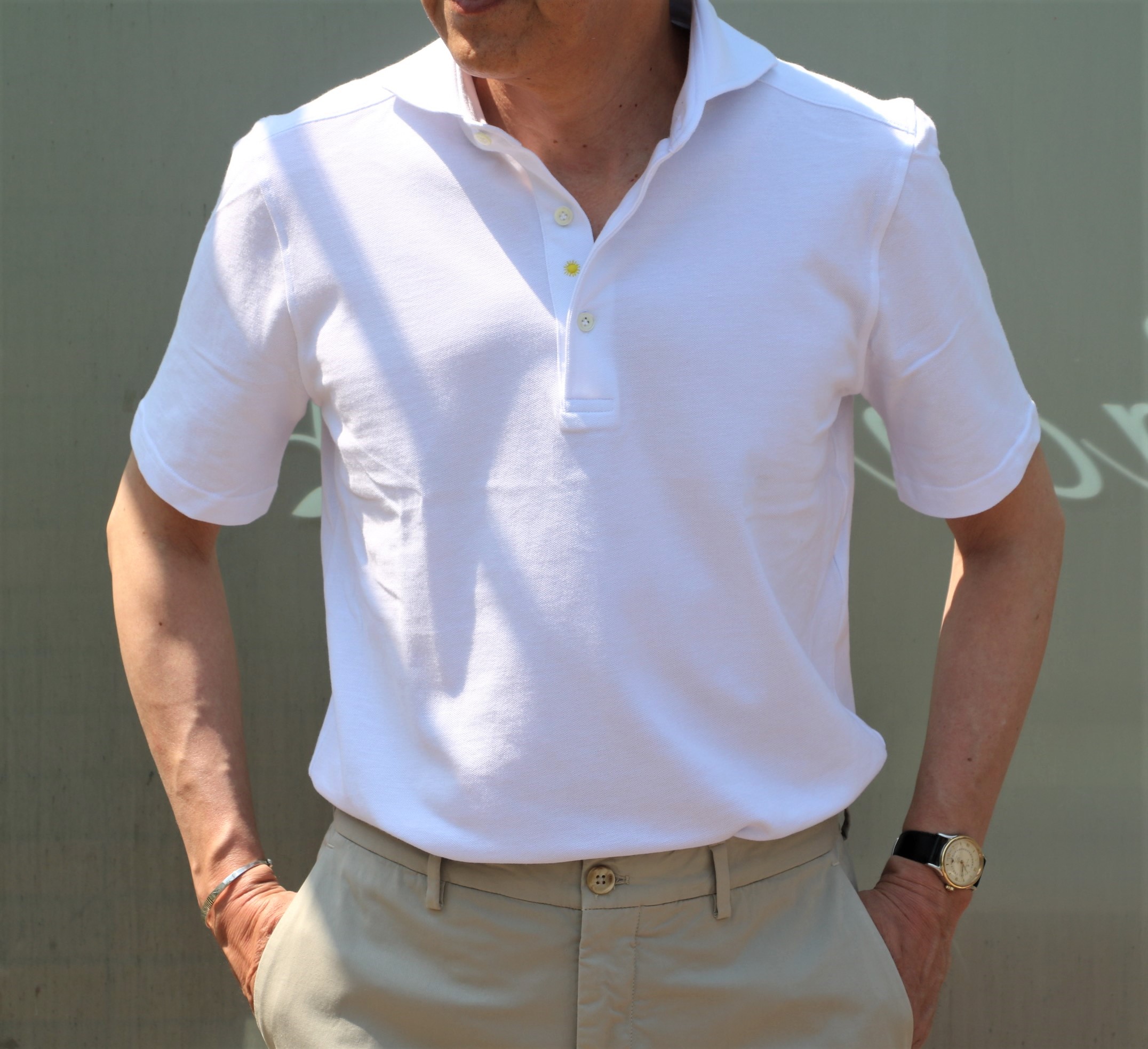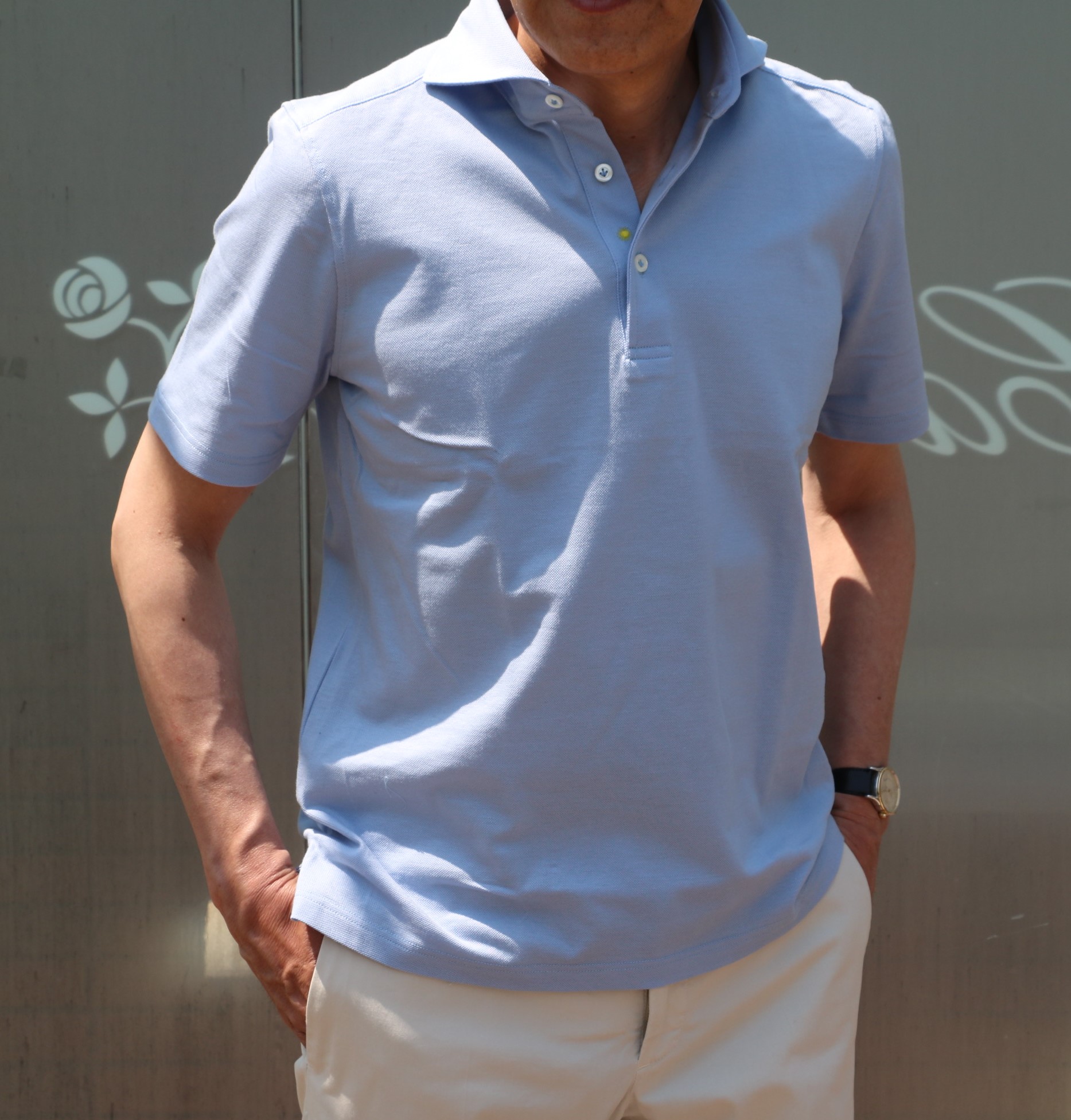 後半も【Giannetto/ジャンネット】。既に通販サイト「SUGURU SHOP」には掲載済みですが、改めてコーディネートでご案内させていただきます。初登場のカットソーということもあり、店頭でもオンラインでもご好評いただいている鹿の子のポロシャツ。ロングスリーブはネイビーのみの展開でしたが、サイズSを残すのみ。こちらの半袖もロイヤルブルーが既に完売してしまいました。