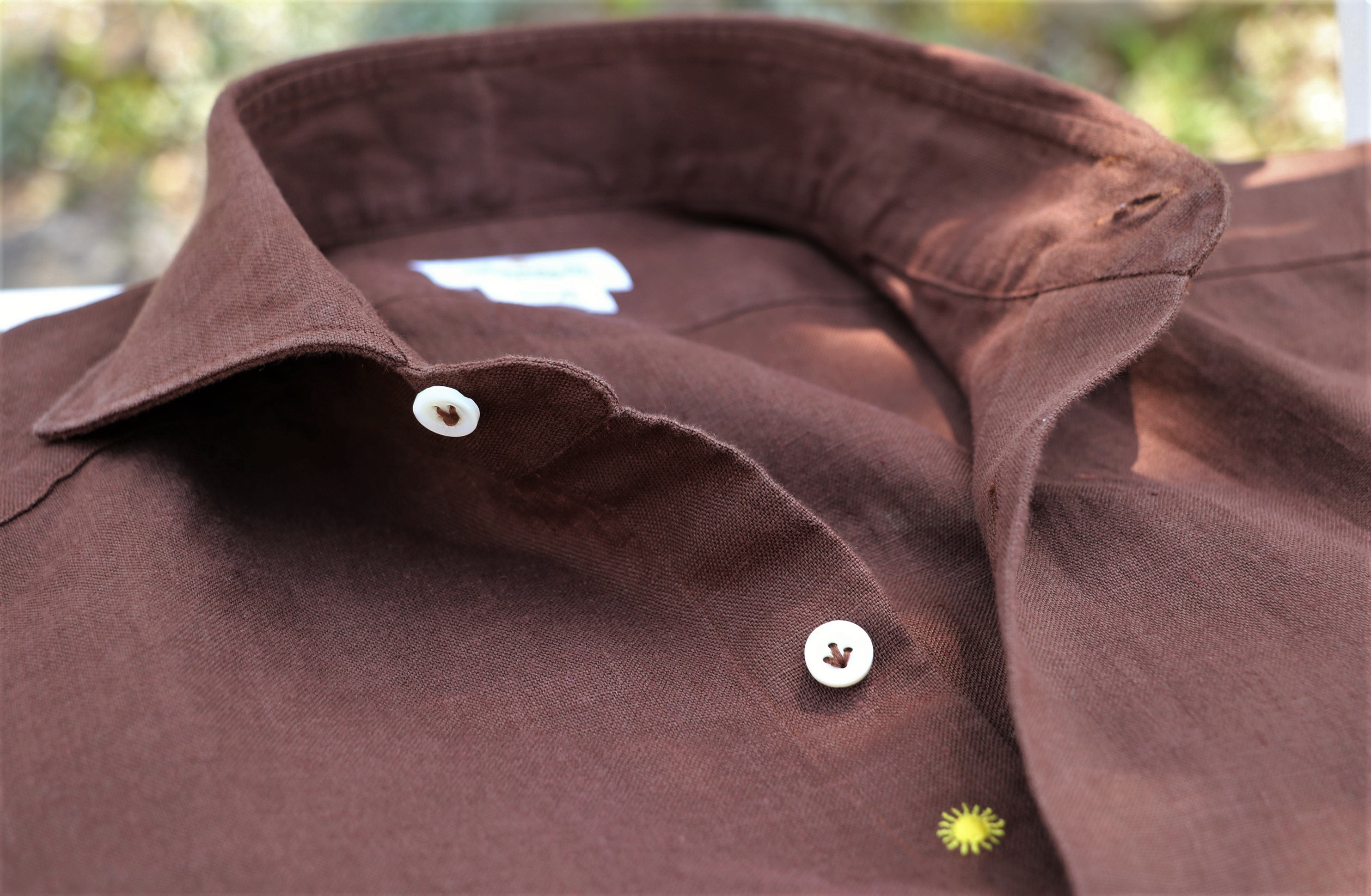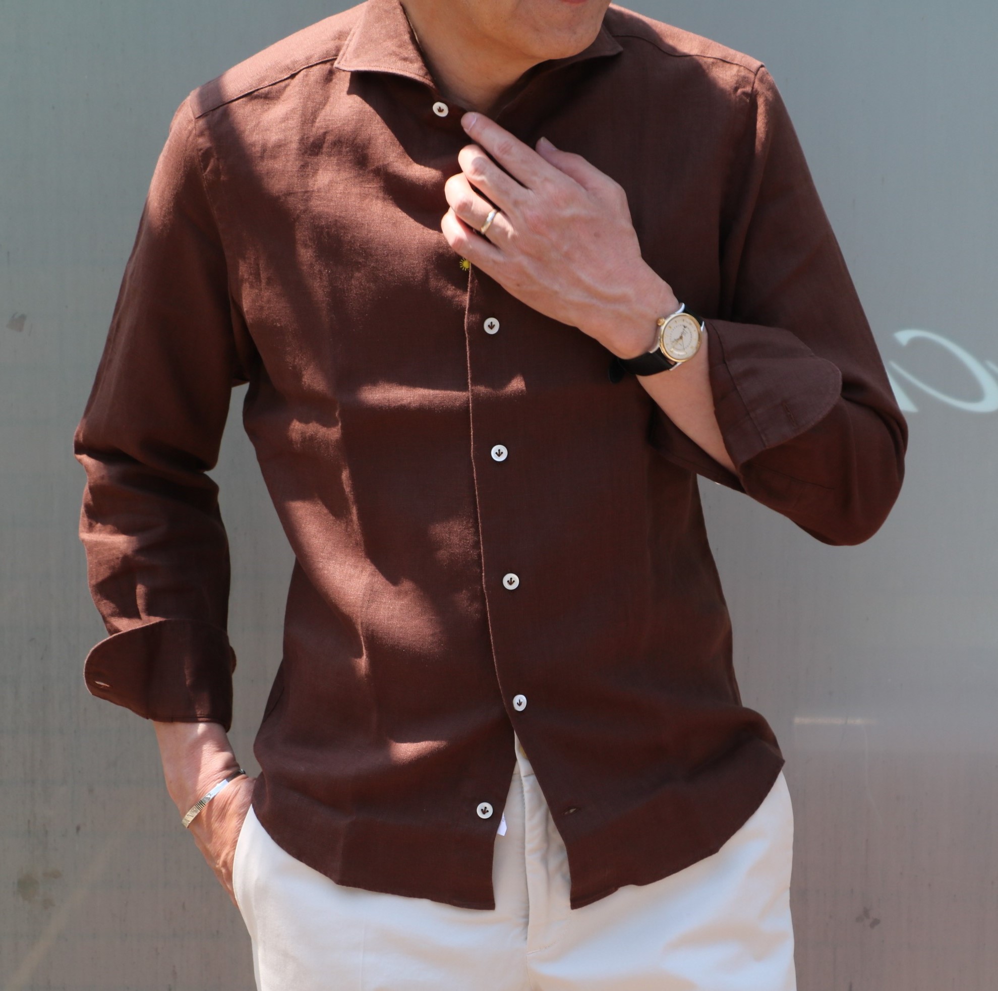 5月2日、本日の岡崎市は、夏のような天気。羽織るものに悩む...そんな方には、羽織れるシャツをお勧めします。例えば、こんな感じで。リネン100%のブラウンは、同色系のボーダーのカットソー(FILIPPO DE LAURENTIIS)に、ブルーのイージーパンツ(PT TORINO)、白スニーカー(SUPERGA)と合わせてみました。