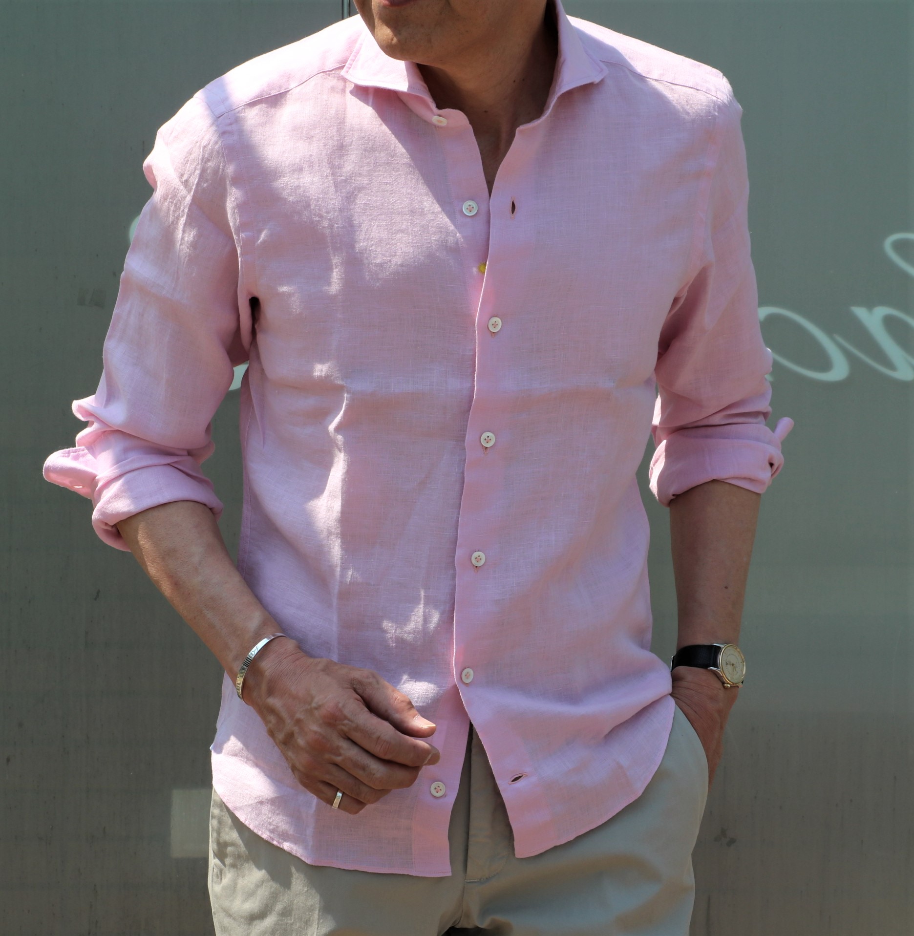 正確に言えば、ブラウン色については、先にマスヤマがご案内させていただいたオープンカラーシャツ「NEW CARAIBI」と同じ生地に。ホワイトとピンクは、ほんの少しですが、生地が薄くなりますので、ご了承ください。