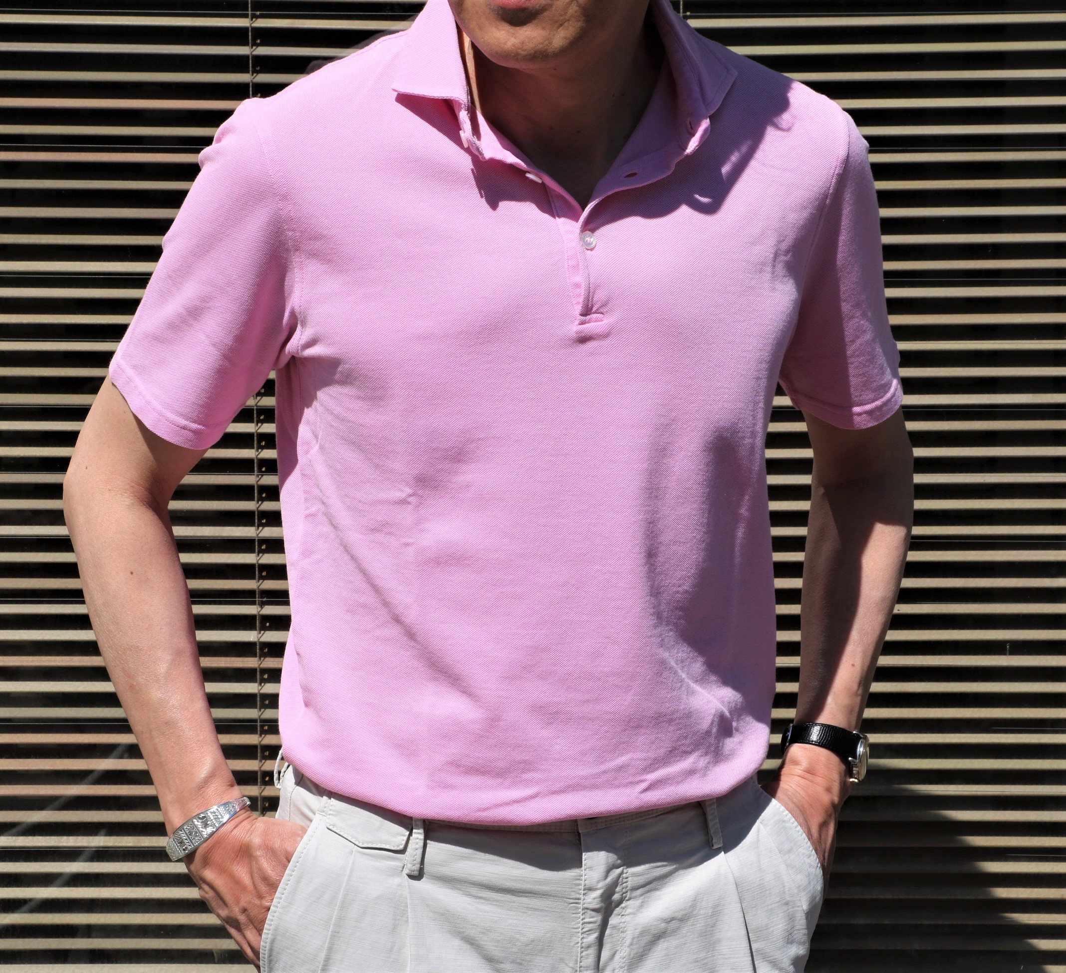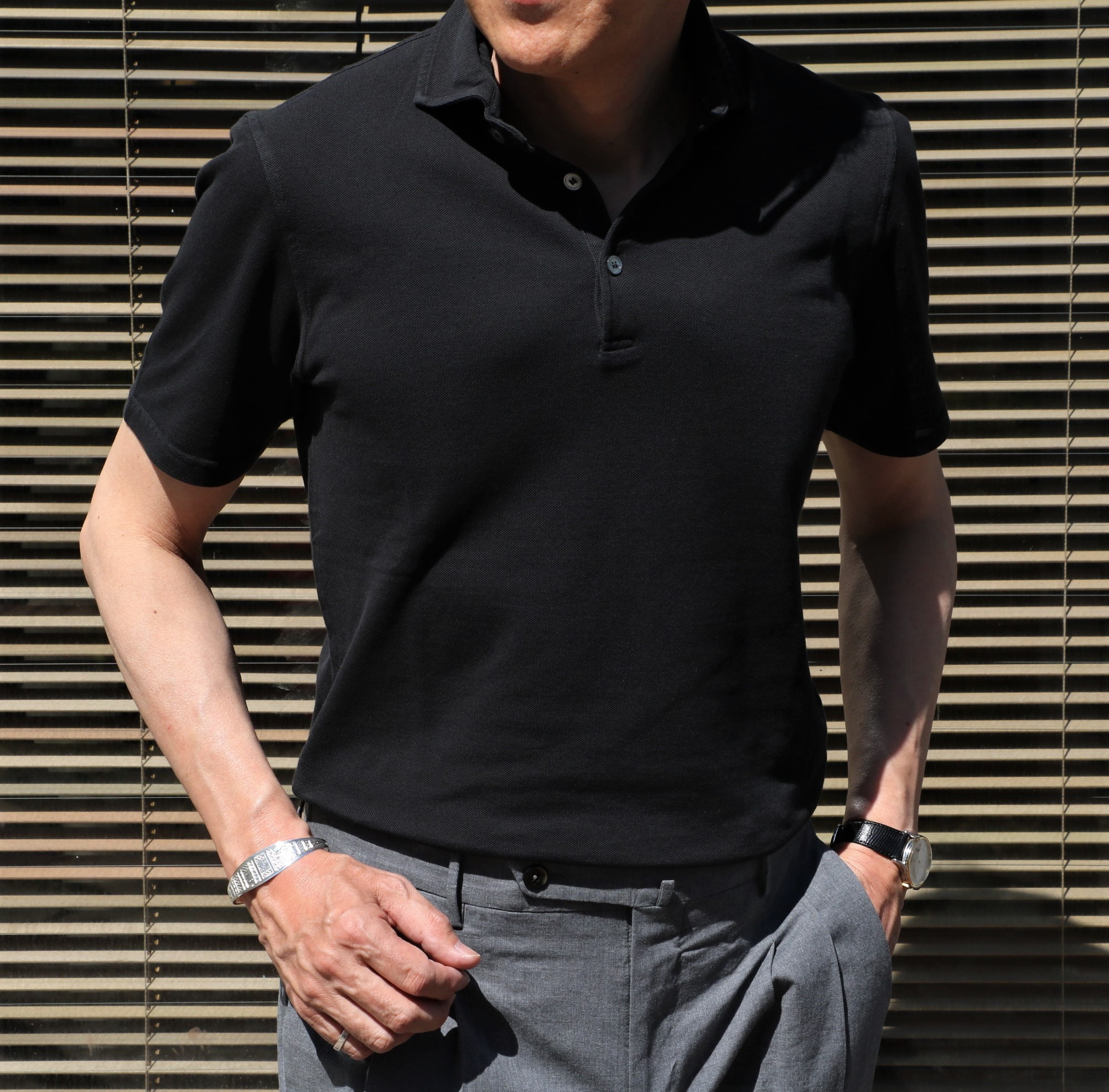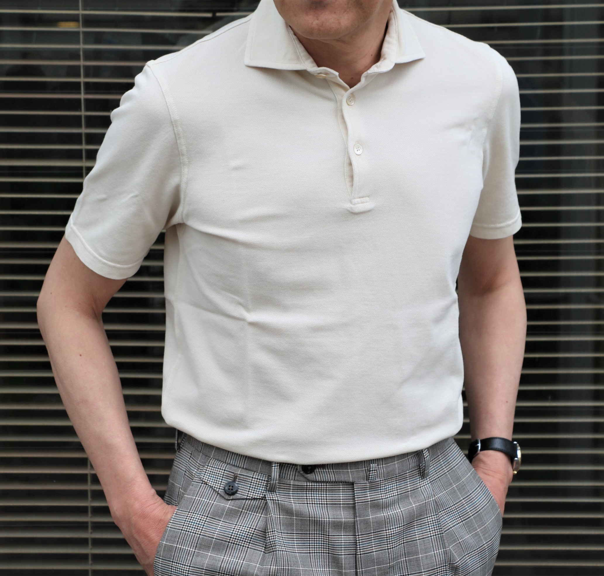 ドレスポロのようにエレガントさを求めるなら、このフィットモデルは最適。太めのボトムにも相性は良いはずです。