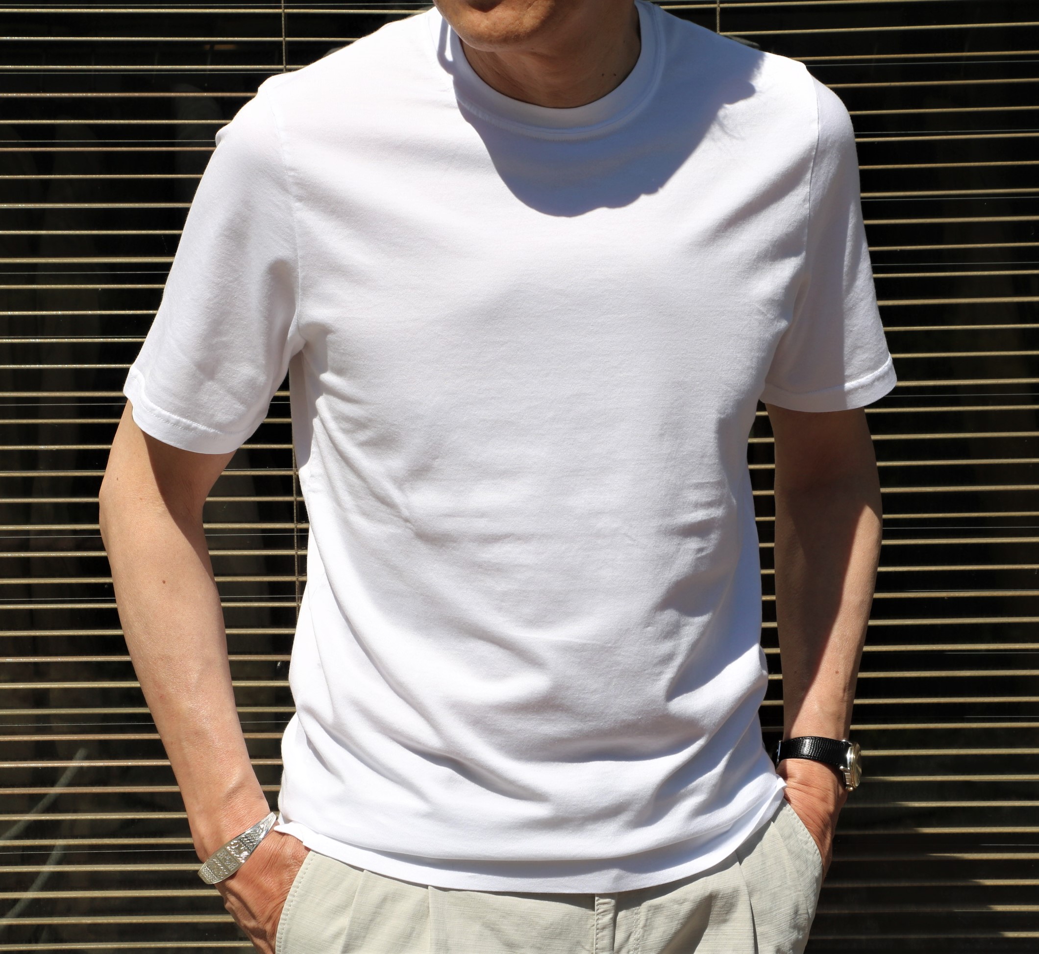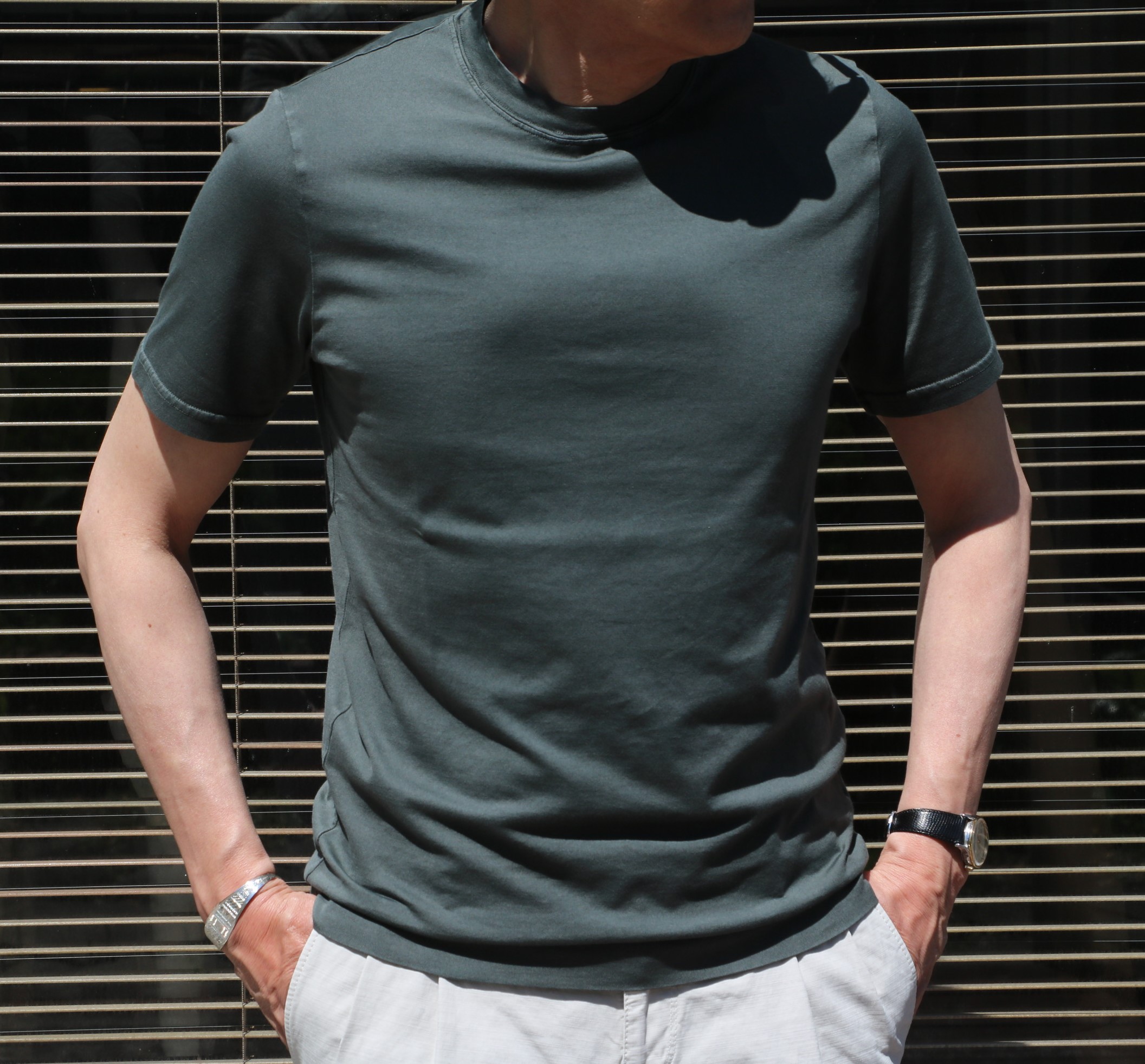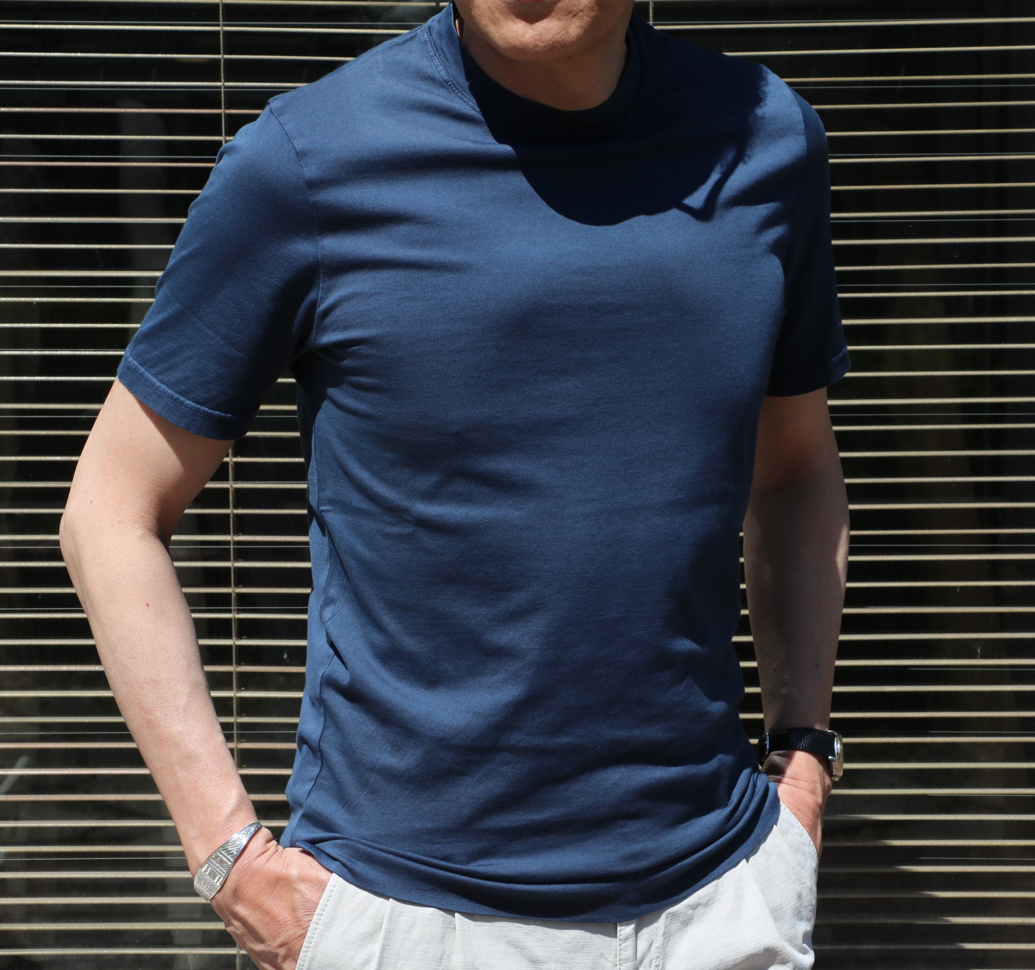 お待たせしました!! 今季、お勧めしているのが、シャツ屋さんが作る羽織りもの。写真は、ORIAN/オリアンのデニムワークシャツですが、インに着ているのが、【FEDELI/フェデーリ】のショートスリーブTシャツです。