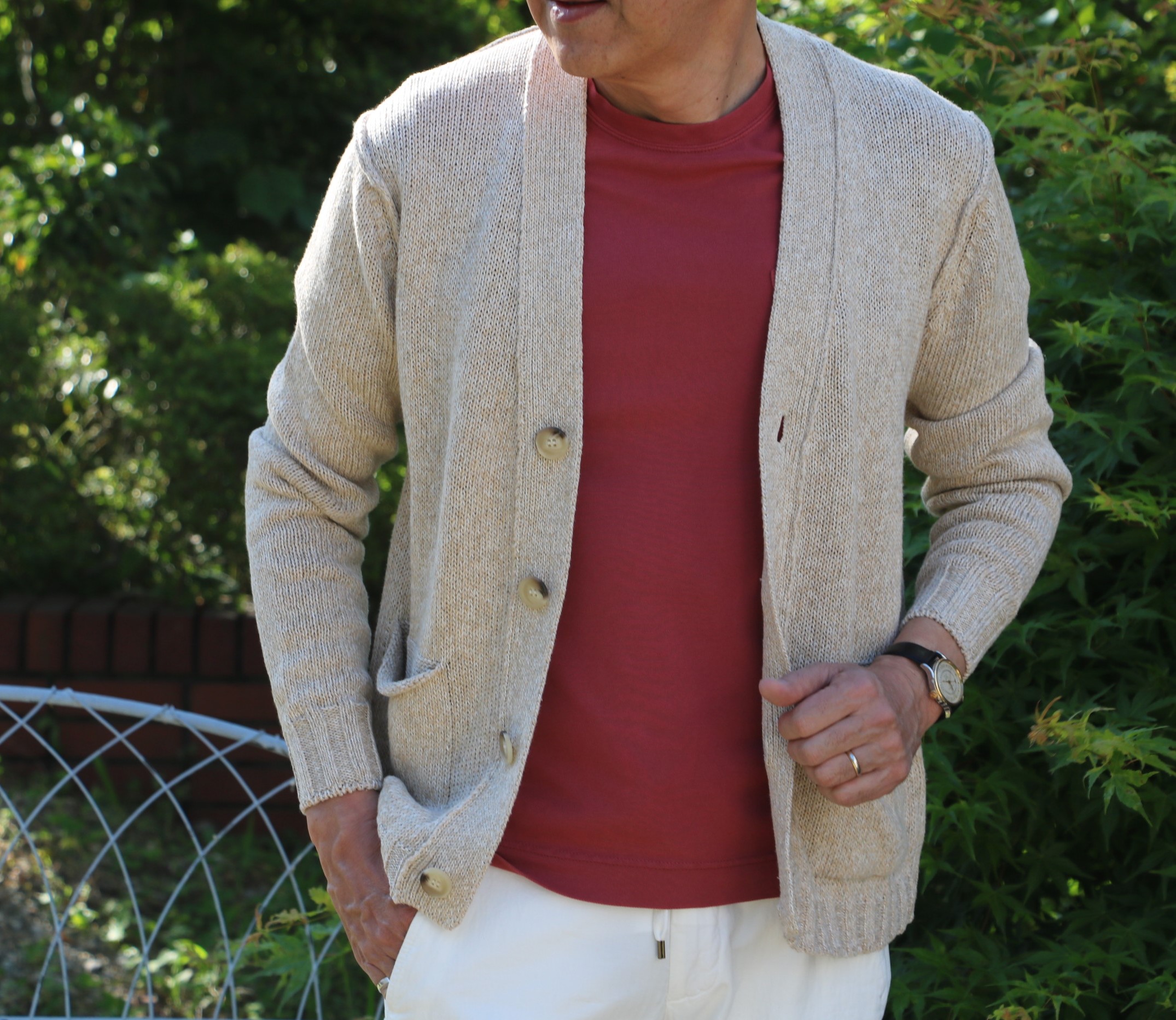 人気のBRIGLIA(ブリリア)のホワイトパンツに、スモークピンクが素敵なGianneto(ジャンネット)のリネンシャツを合わせ、羽織ったカーディガンは【FILIPPO DE LAURENTIIS/フィリツポ デ ローレンティス】のもの。リネン・コットンのナチュラルなカーディガンです。