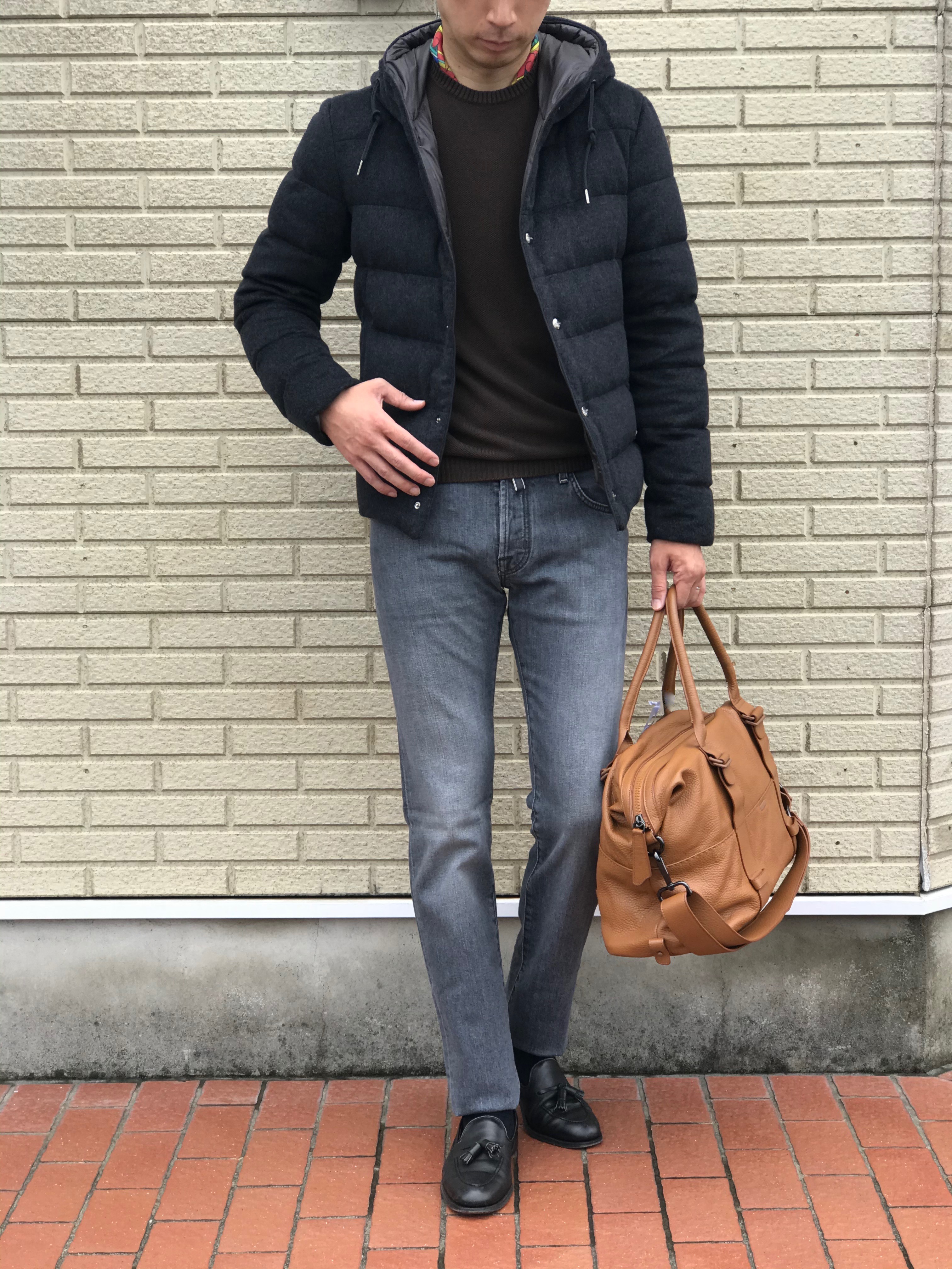 シックな装いで楽しむ秋の旅行は、こんなスタイルでしょうか。FEDELIのニットにKinlochのネッカチーフを挿し、パンツはJACOB COHENのデニム、シューズはCROCKETT&JONES。個人的に履きなれた靴ですが、もっとリラックスしたものを選んでもいいですね。バッグは、挿し色になるZANELLATOです。
