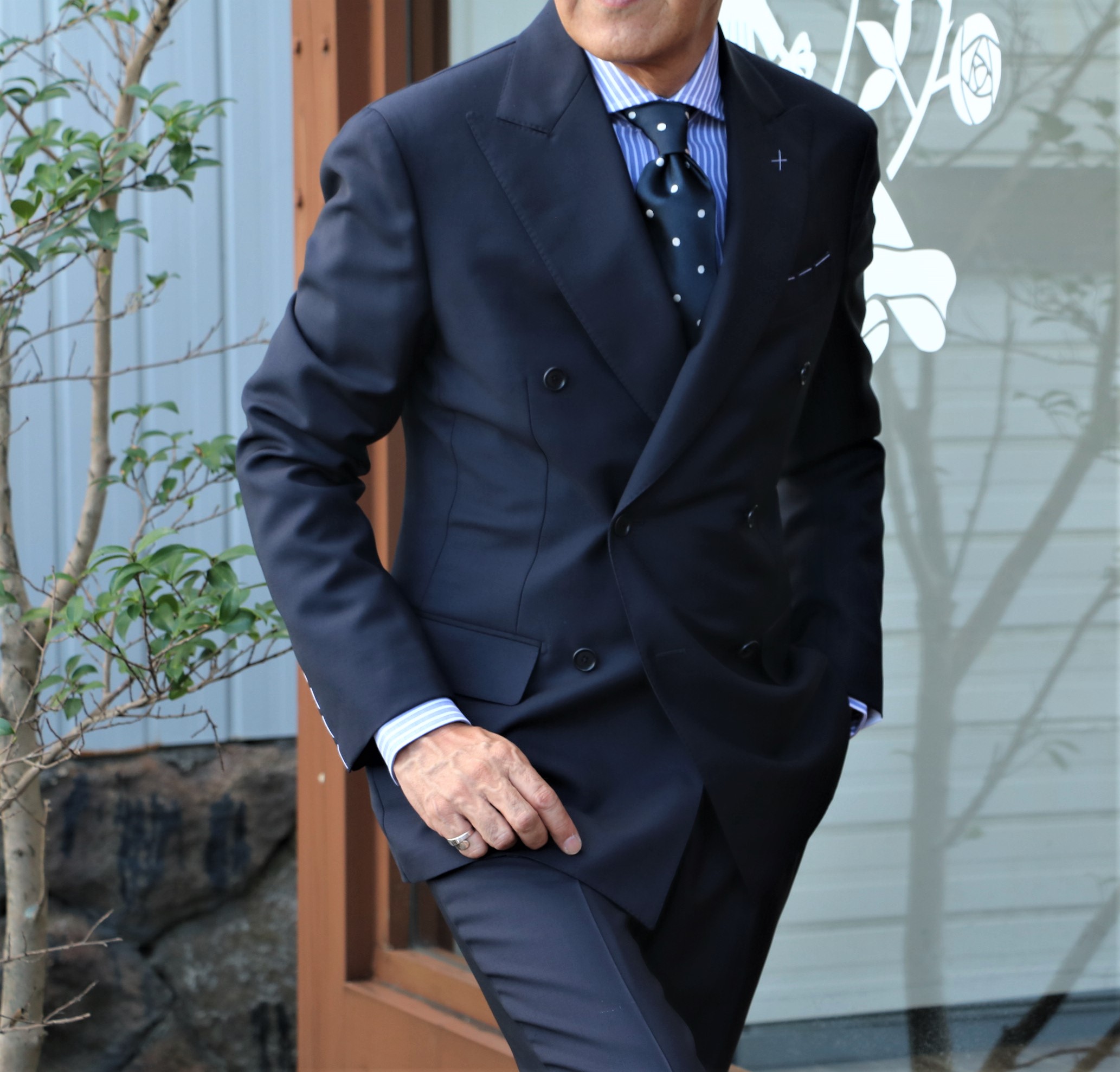 ボルドーは、TAGLIATORE(タリアトーレ)のスーツ、BAGUTTA(バグッタ)のシャツに合わせています。上の写真のネイビーは、BAGUTTA(バグッタ)のシャツに合わせています。