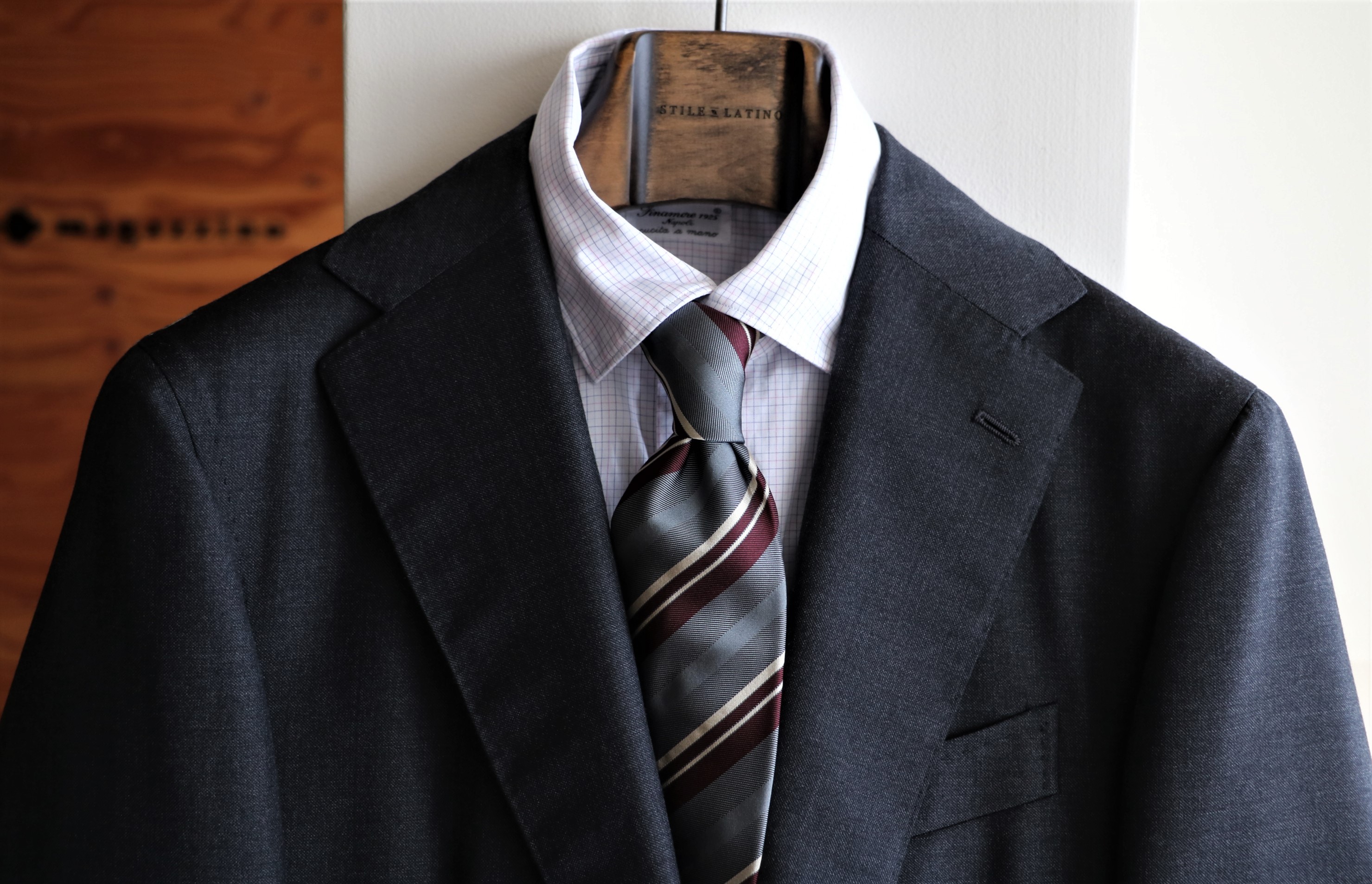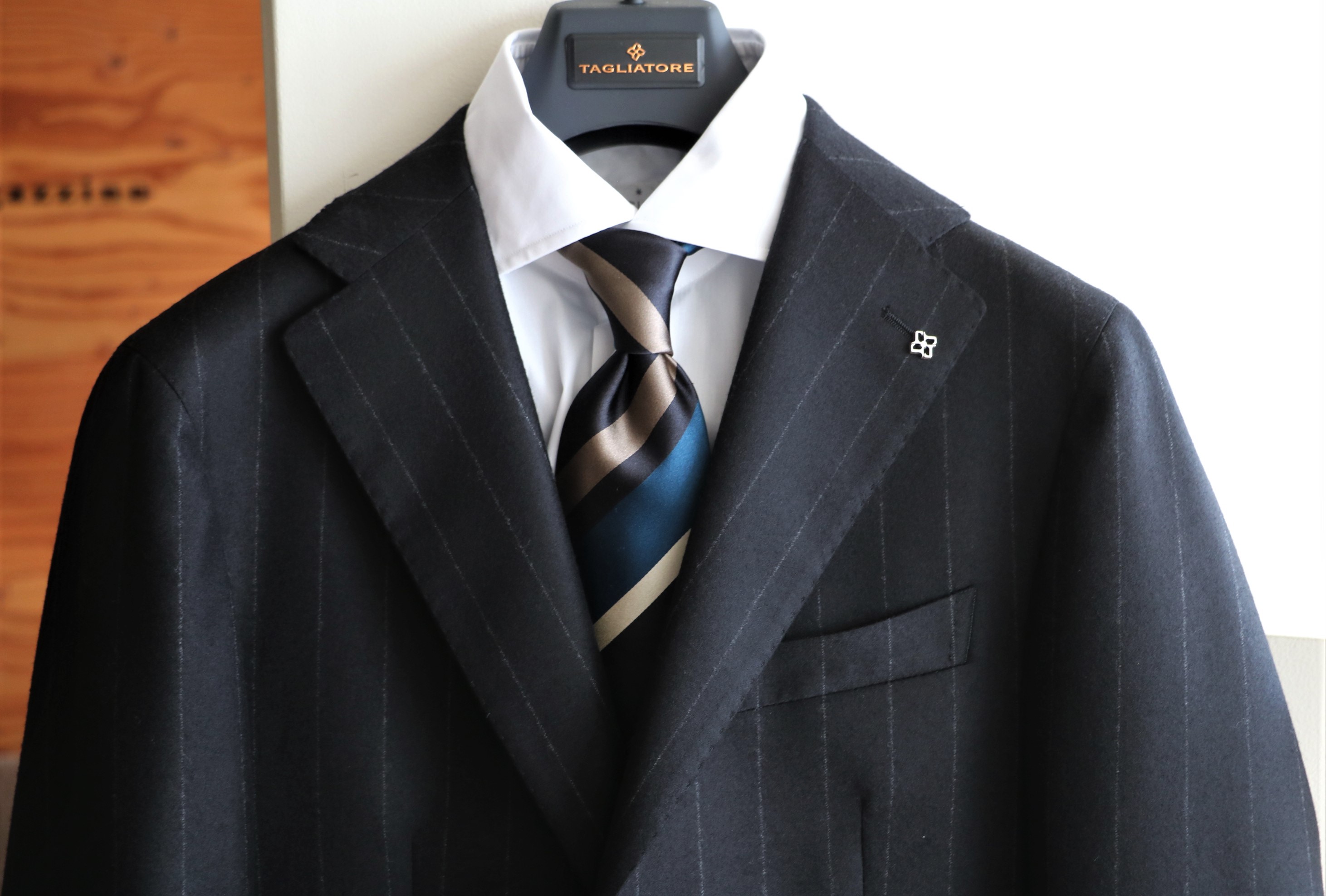 上はStile Latino(スティレ ラティーノ)のスーツに、私の洗いざらしのFinamore(フィナモレ)のシャツ、下のスーツはTAGLIATORE(タリアトーレ)、シャツはBAGUTTA(バグッタ)です。
