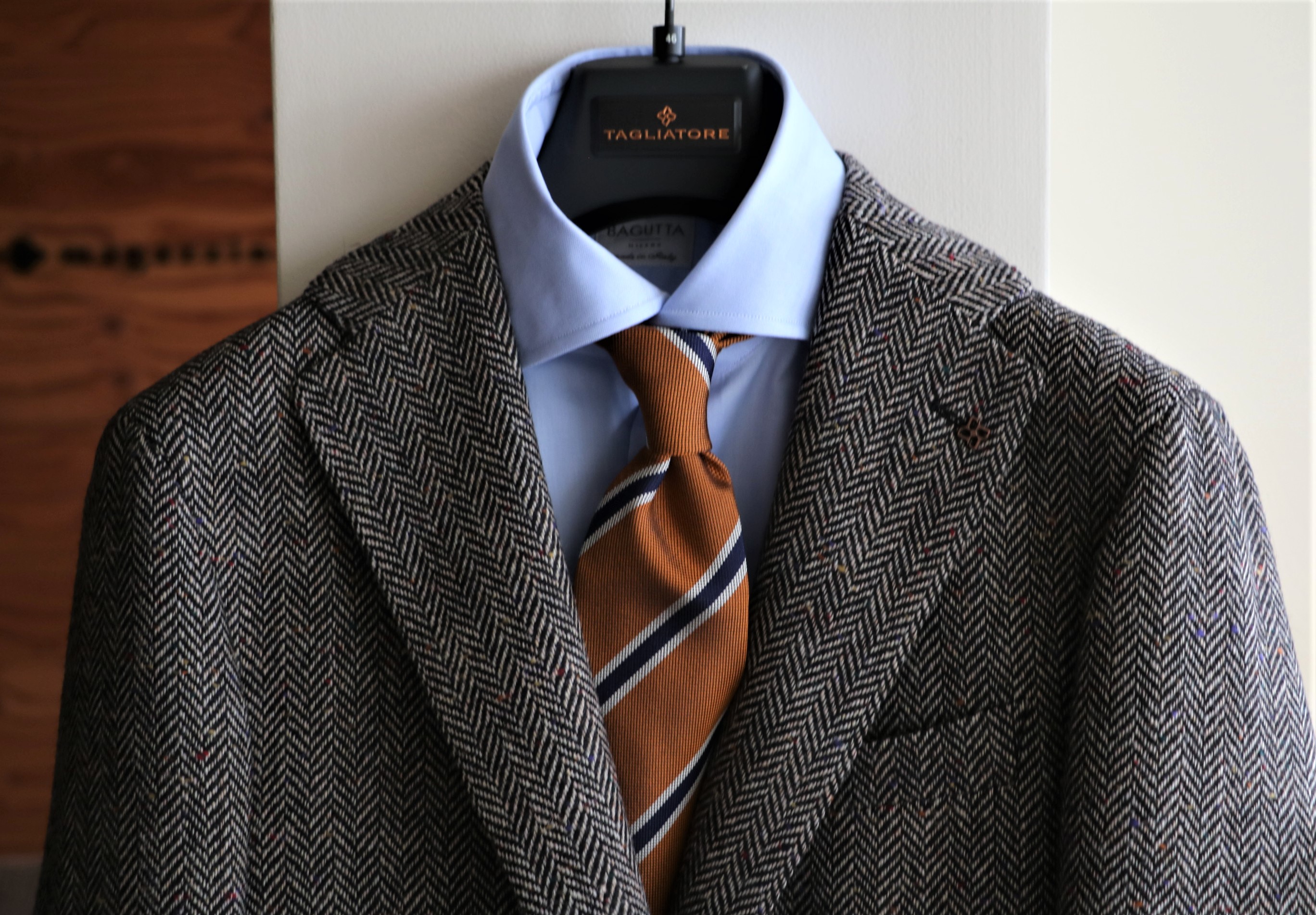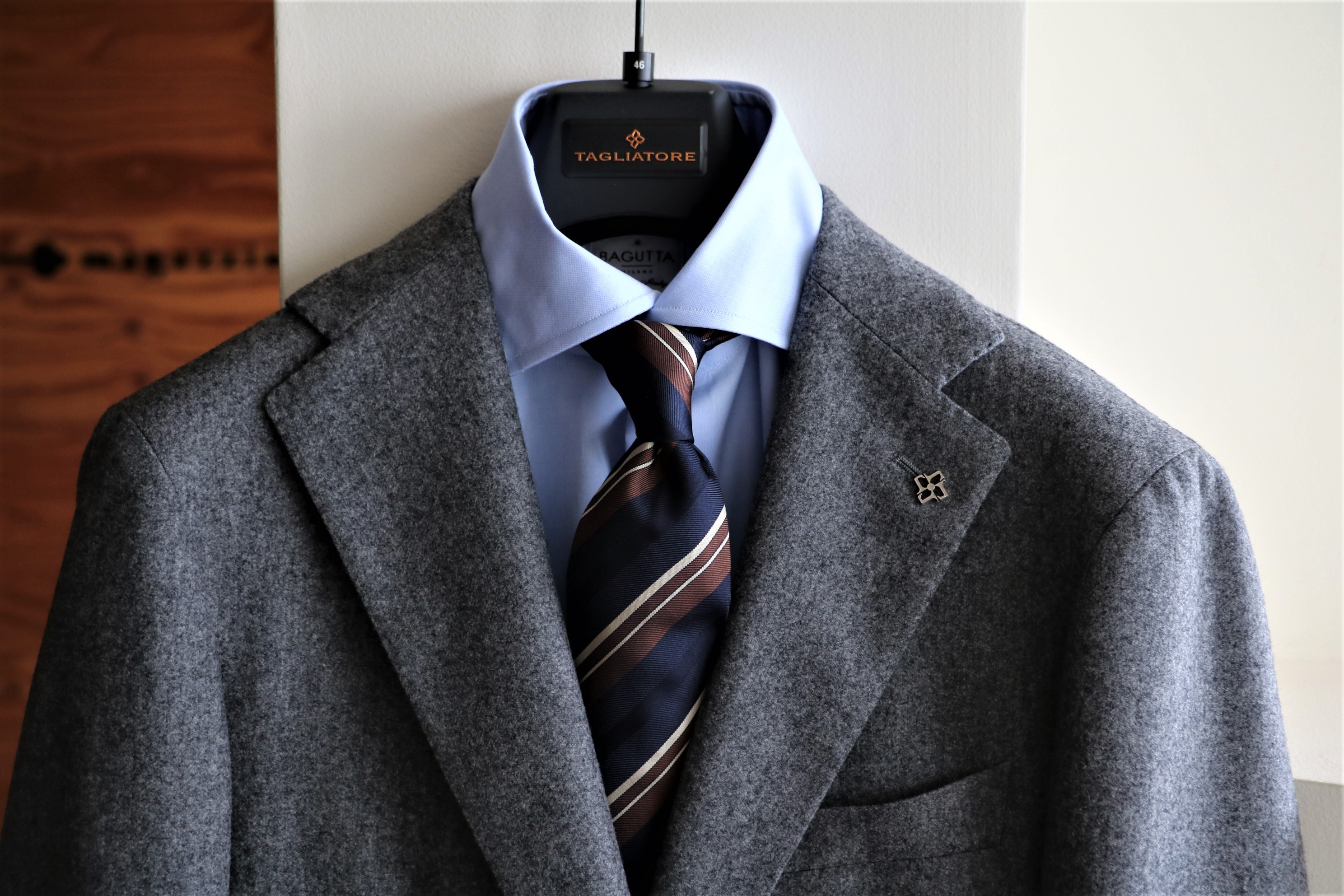 合わせたジャケットは未公開のTAGLIATORE(タリアトーレ)、スーツもTAGLIATORE(タリアトーレ)で、シャツはどちらもBAGUTTA(バグッタ)です。