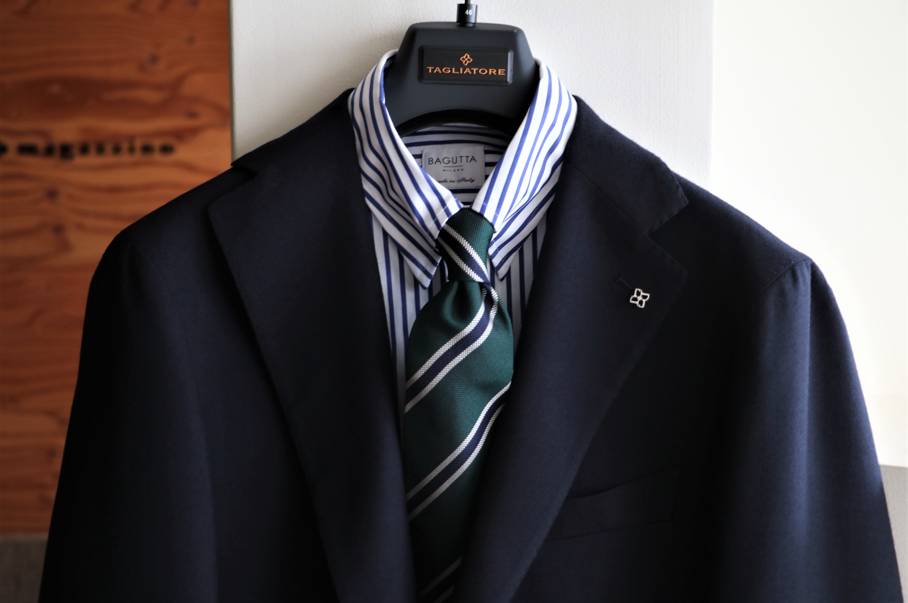 どちらも未公開のTAGLIATORE(タリアトーレ)のジャケット。上のシャツはご案内済み。下のロンドンストライプのタブカラーシャツはBAGUTTA(バグッタ)のものになります。