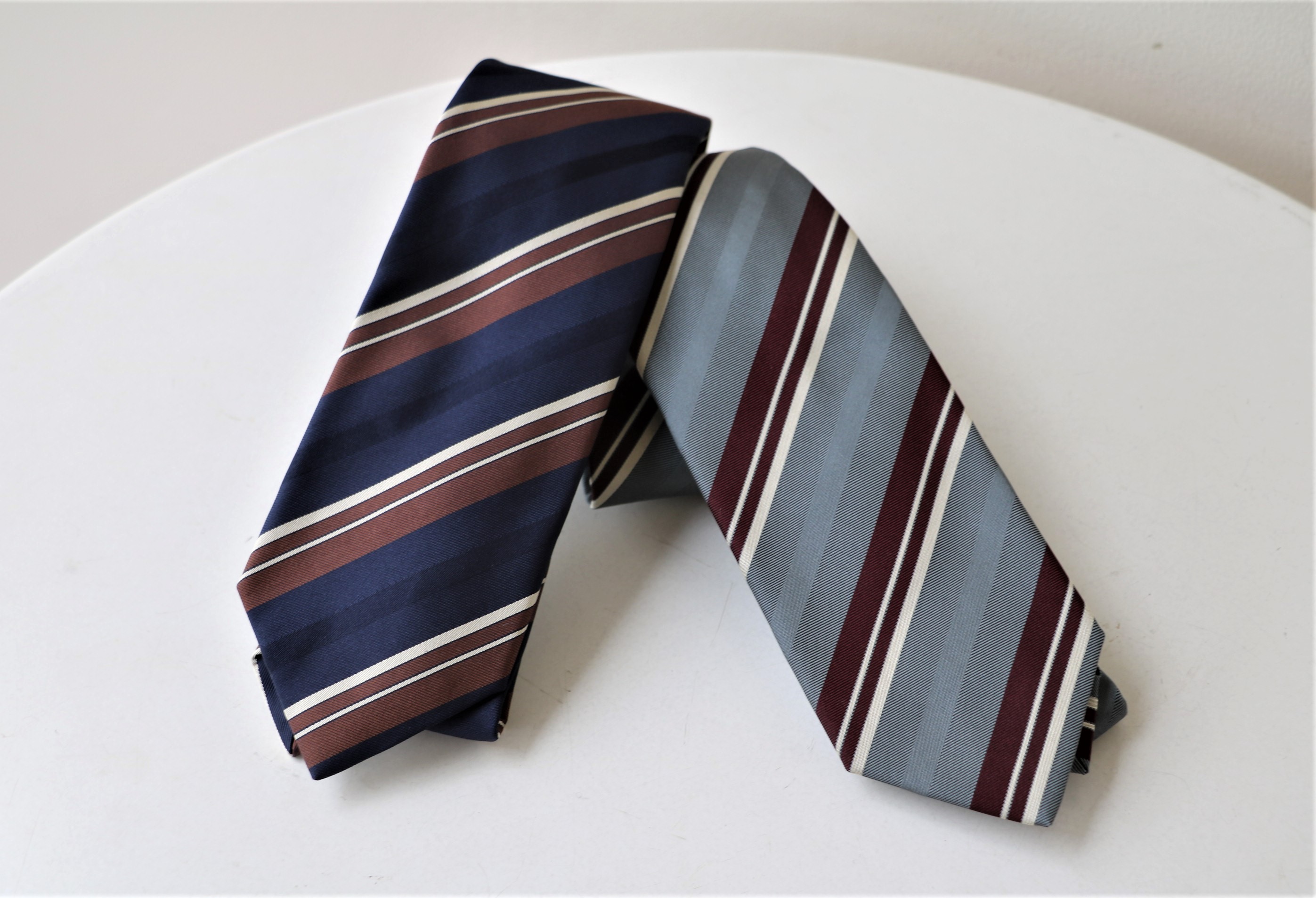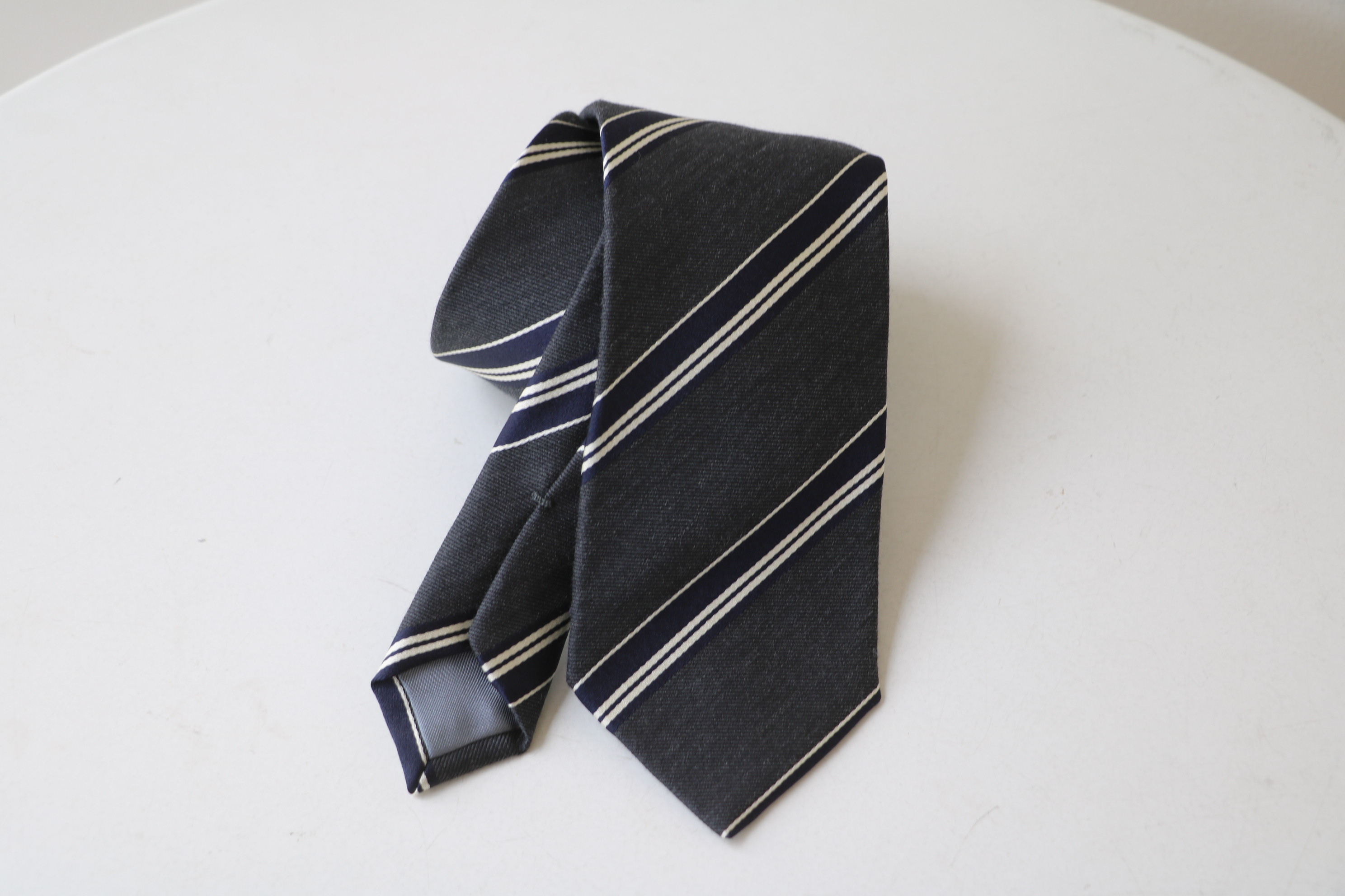 織柄のあるグレイとネイビーベースのストライプ柄は、配色の見事さからか、表情豊かで奥行きのあるネクタイです。