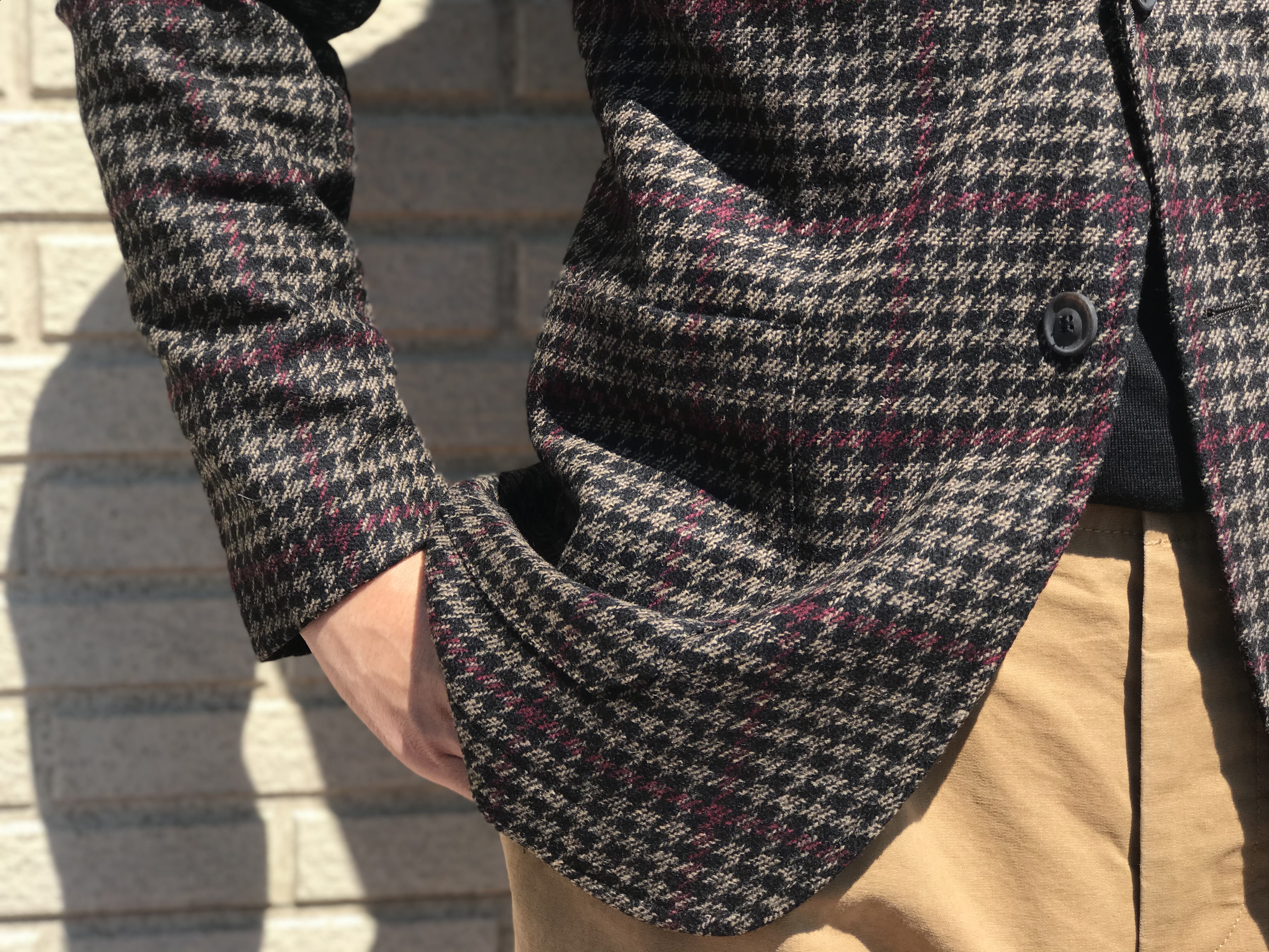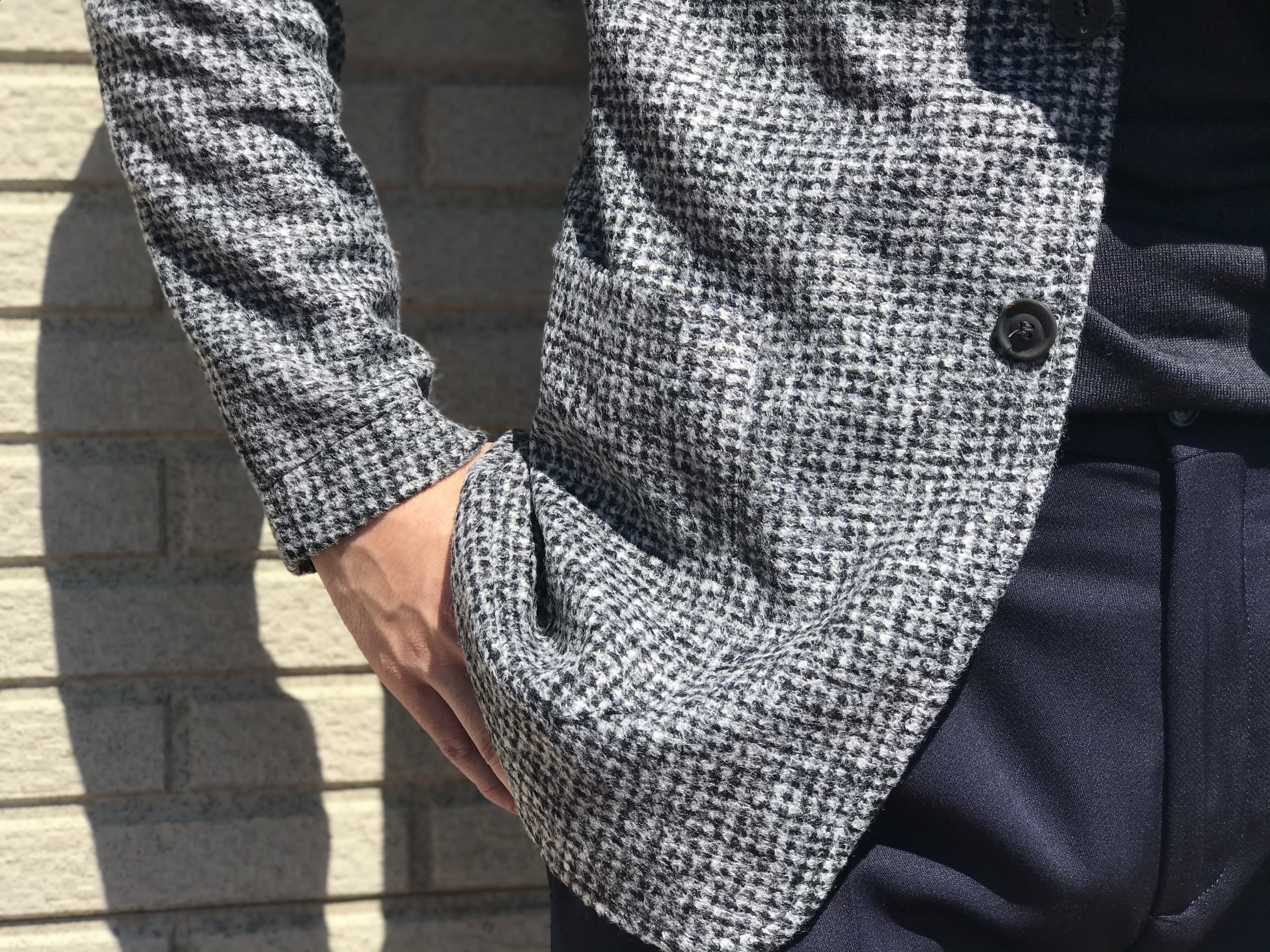 う~ん、なんと表現したらよいのか悩ましい生地ですね。細かなチェックのような、千鳥格子のような...。表面の起毛によって、柄をぼかしたファンシーな表情です。