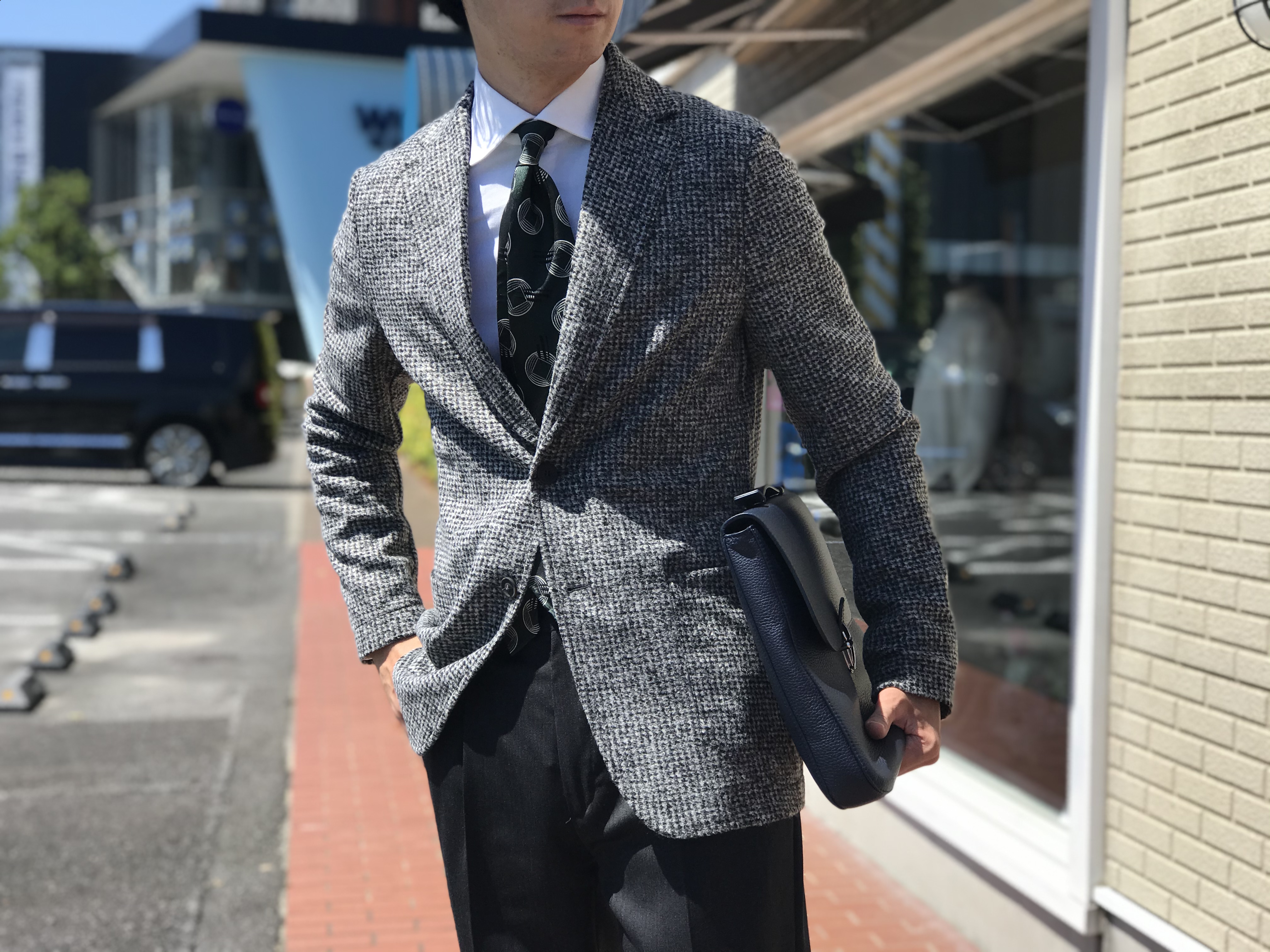 モデルは身長180㎝、体重67㎏、胸囲94㎝で、サイズMを着用しております。ビジネススタイルでコーディネートしたシャツはMario Muscariello、ネクタイはF.Marinoです。
