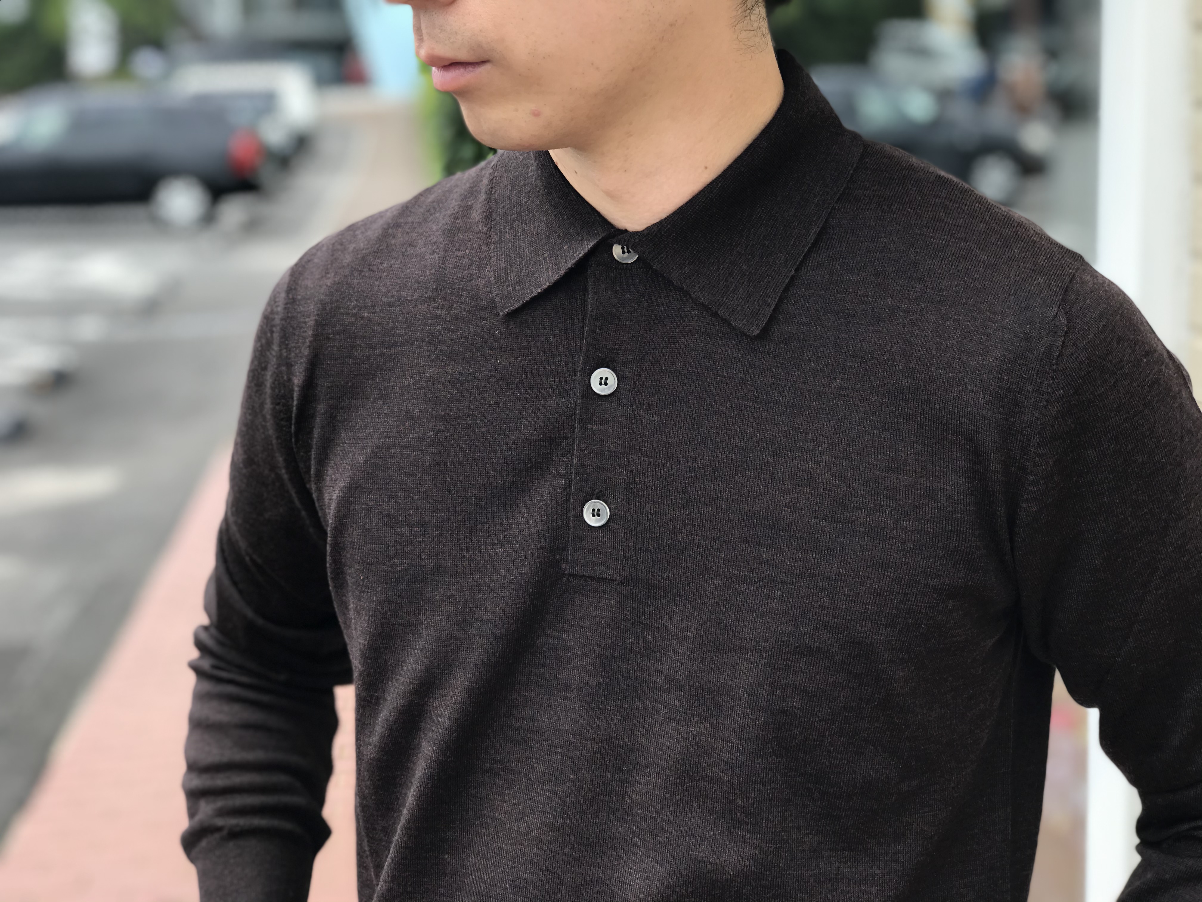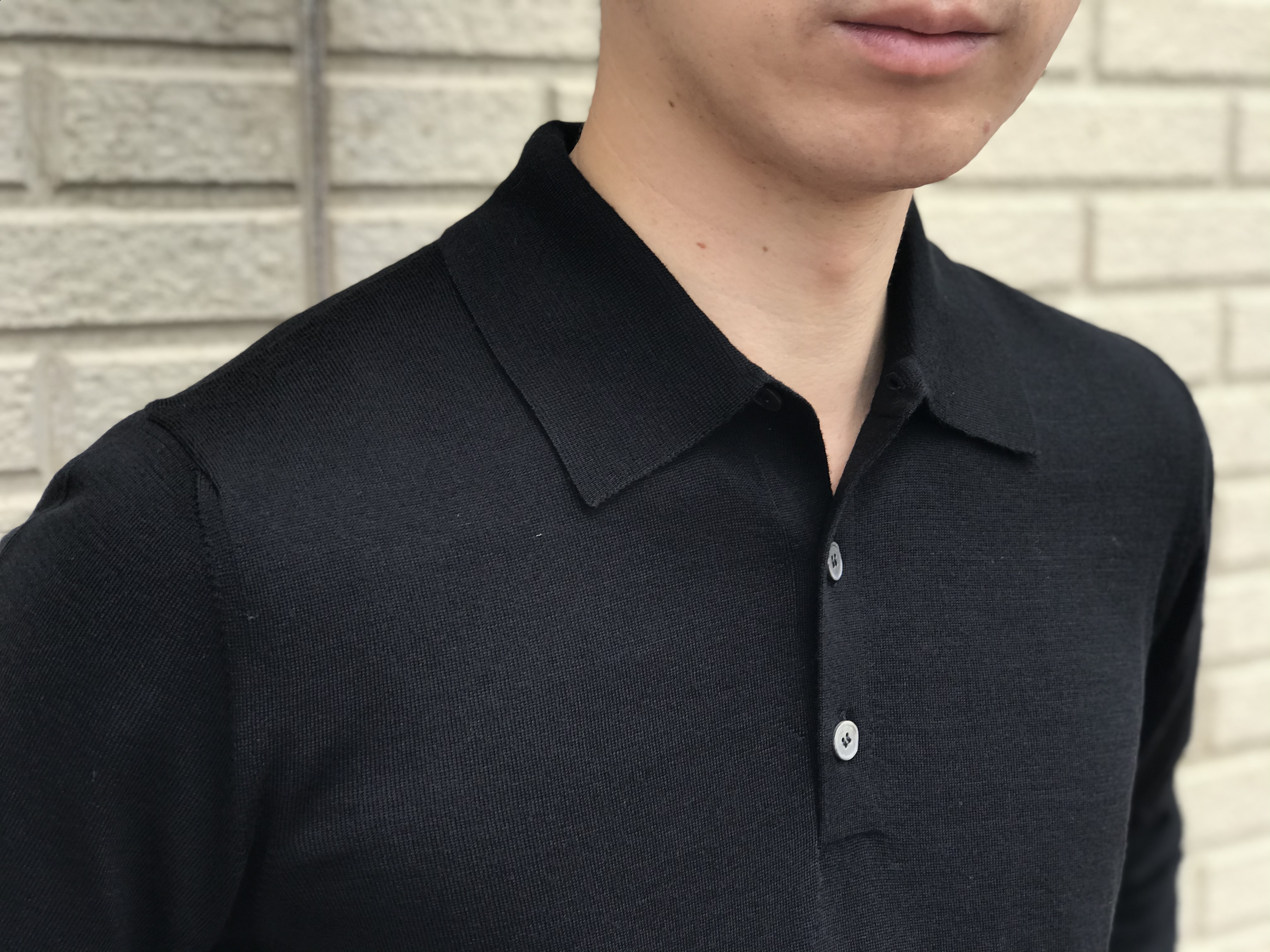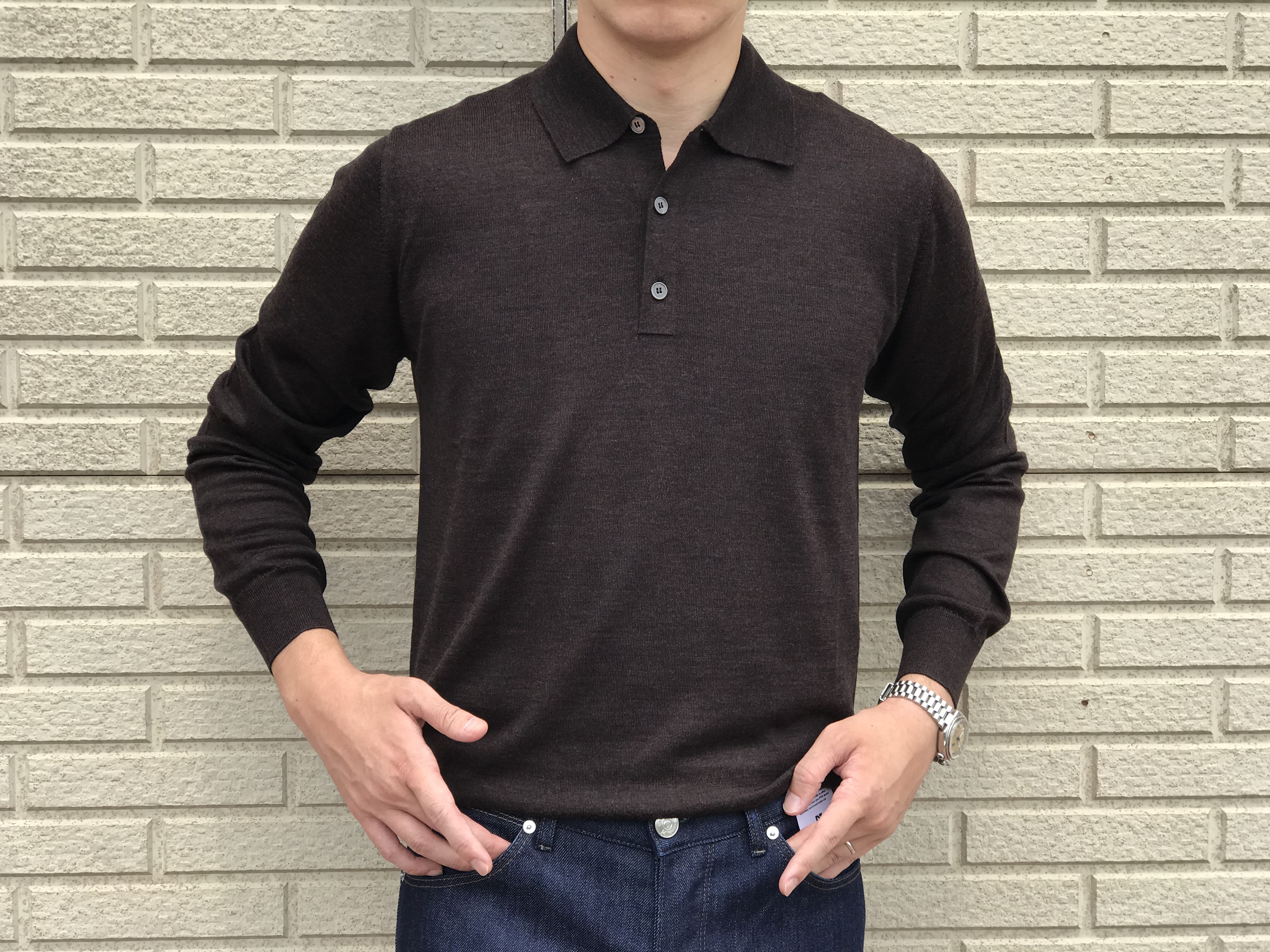 先のラウンドネックセーターと同生地を使用した、メリノウールのポロセーター。
