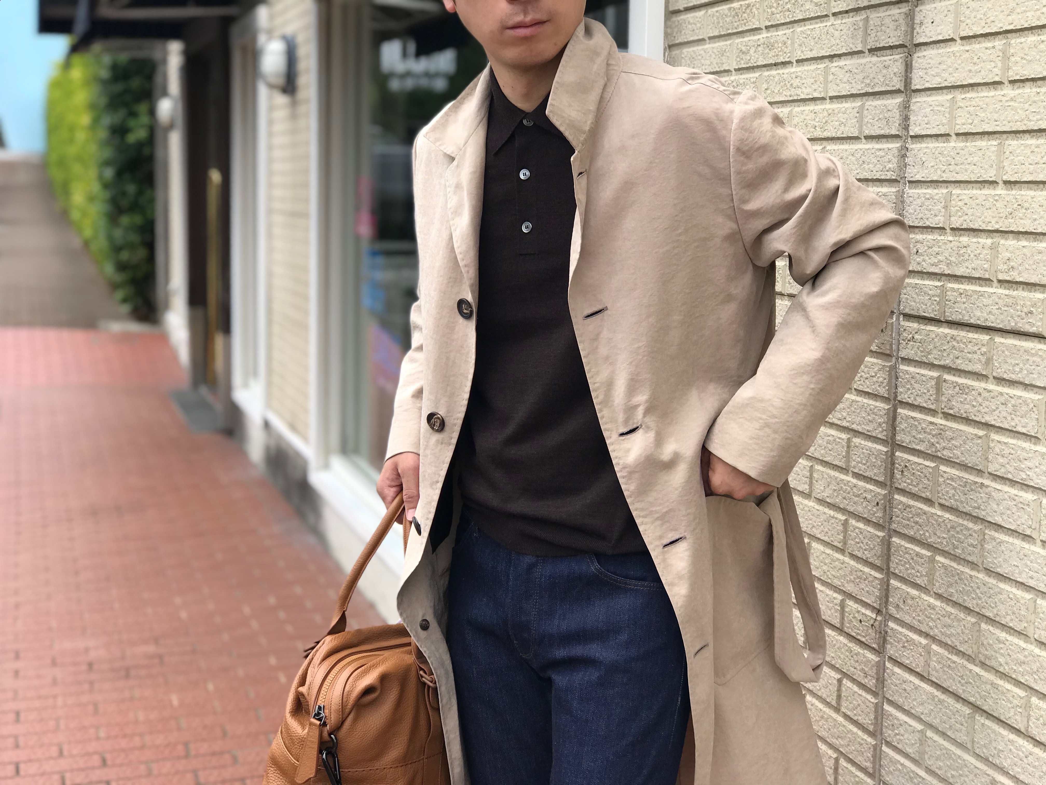 こちらのコーデもStile Latino。フォーシーズン仕様のポロセーターに、こちらも汎用性の高いベルテッドコートを合わせれば、季節や場所、目的を問わず、様々な場面に合ったコーディネートになるはずです。