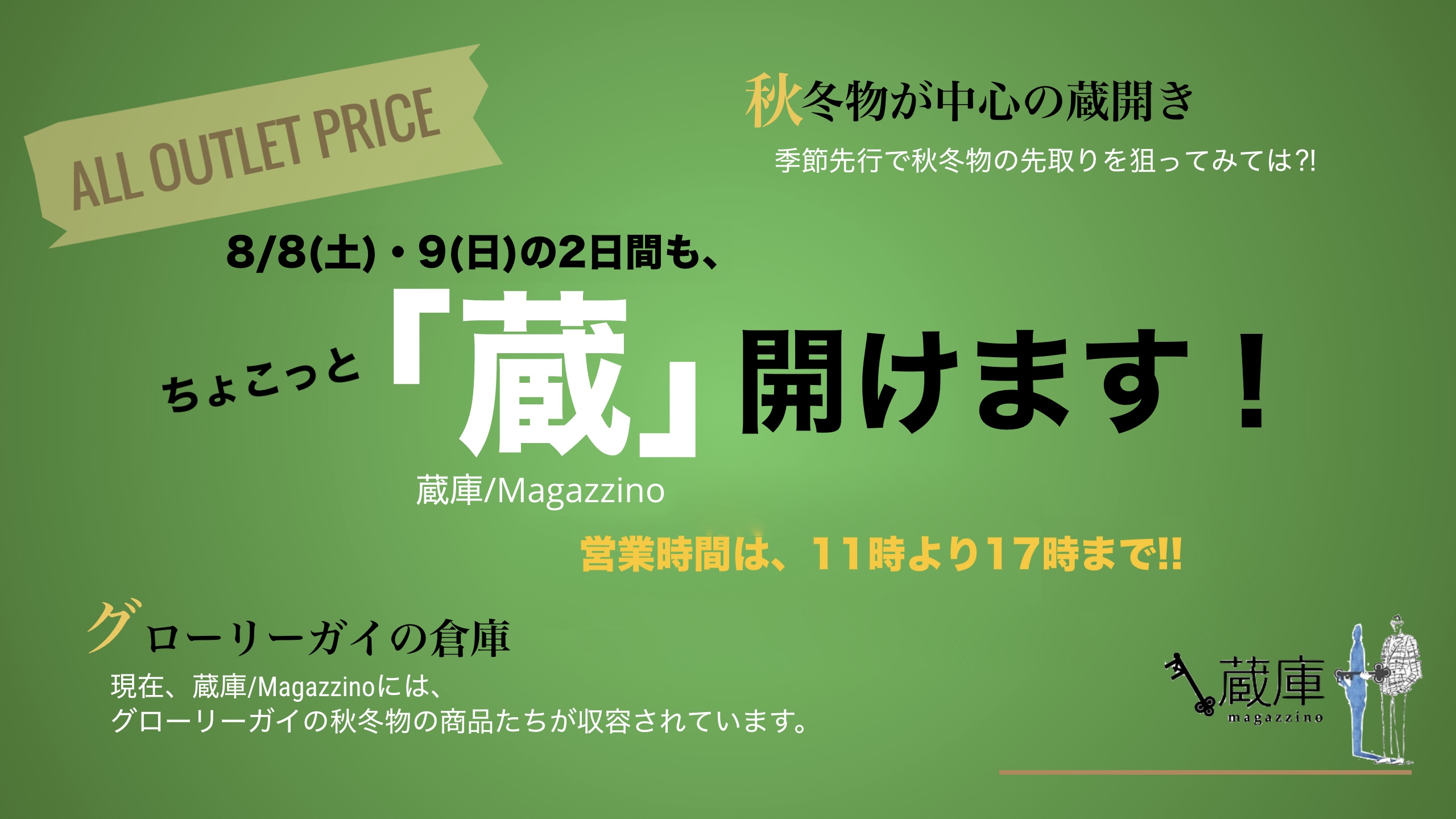 現在、私どもが所有する秋冬物の殆どが収まっている蔵庫/マガジーノ。先週に続き、明日の8/8(土)と8/9(日)の2日間も蔵開けします。営業時間は、11時より17時までとなります。漠然と陳列されてはいますが、未来に向けて気になるものがございましたら、ぜひお立ち寄りください。