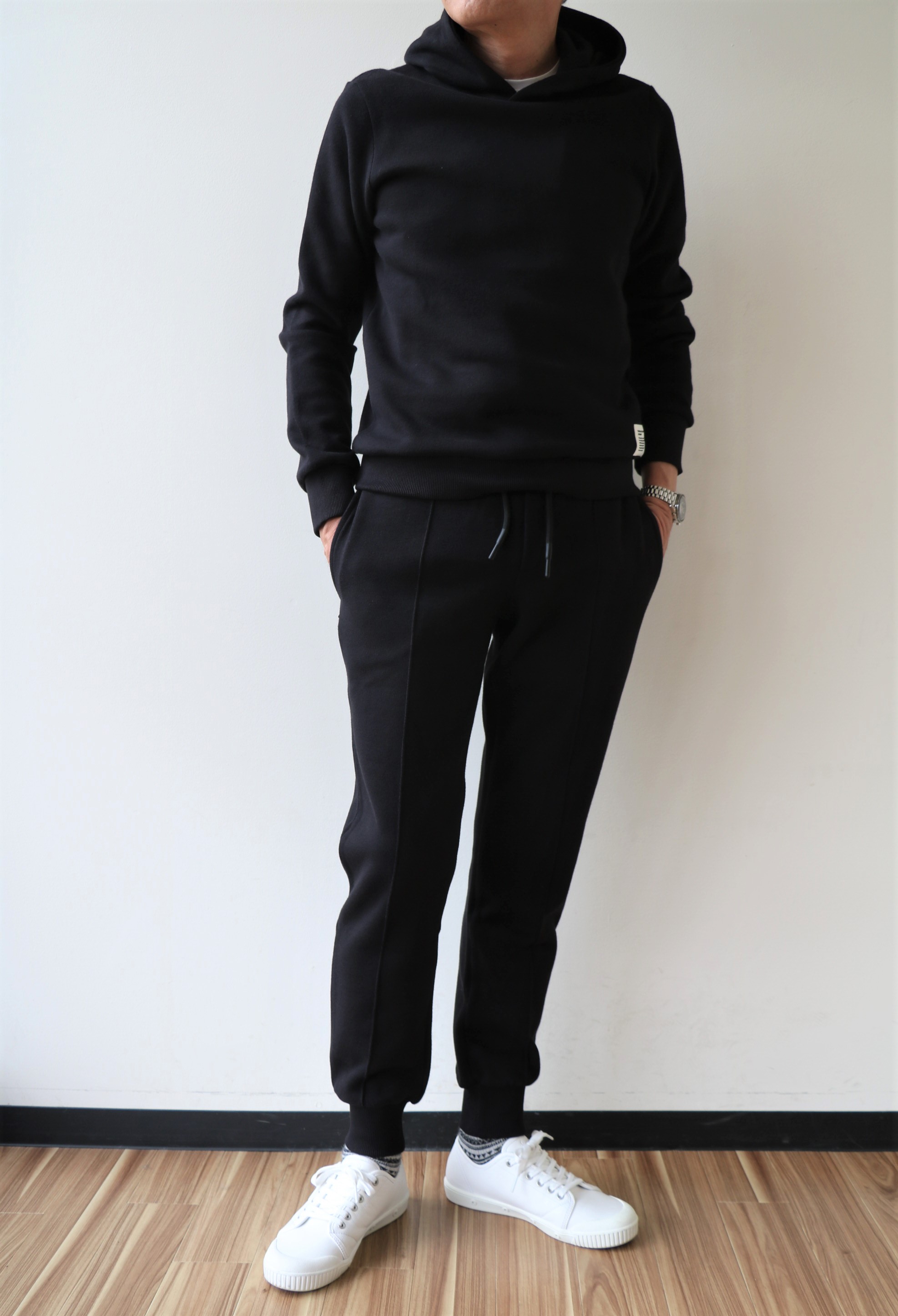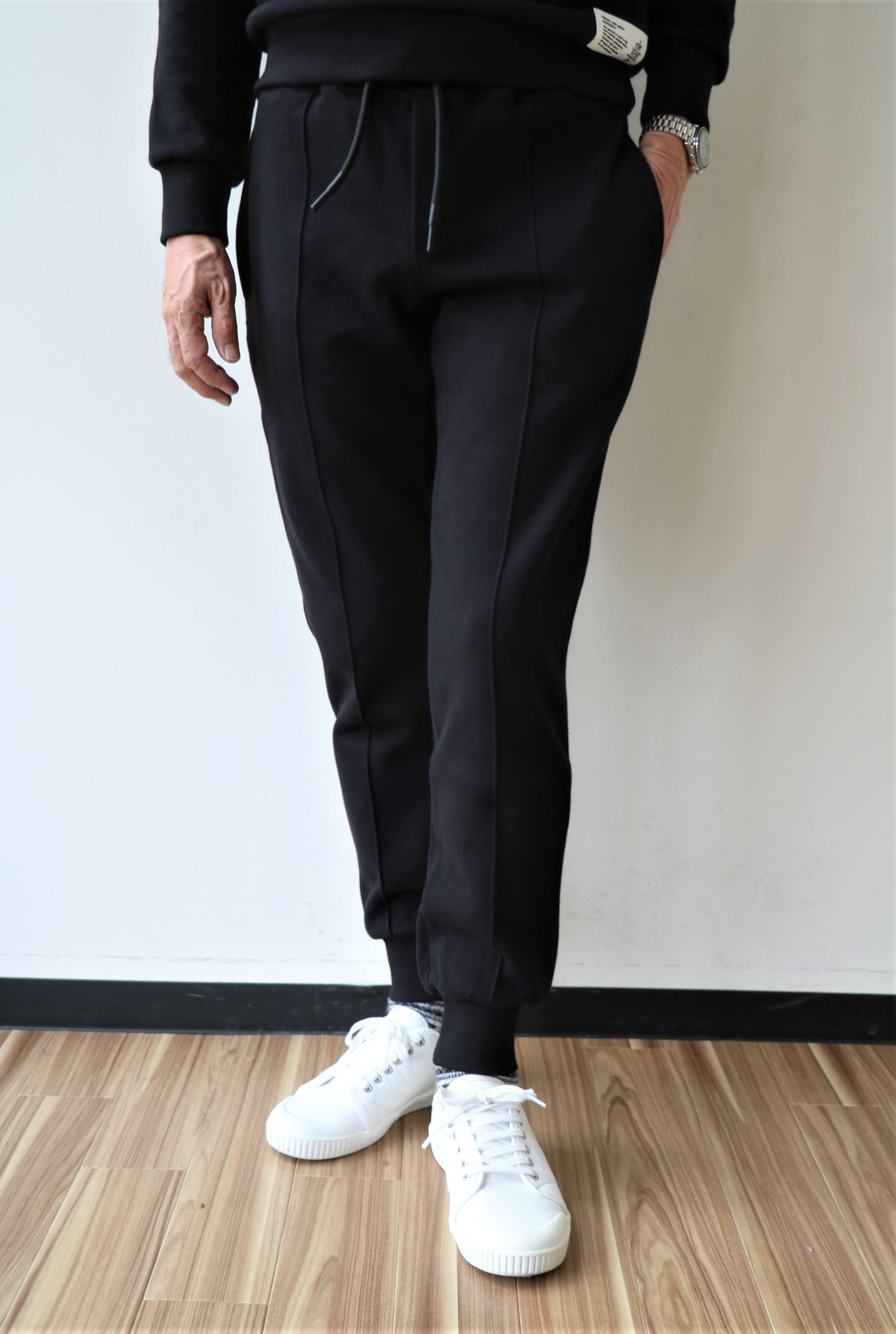 フロントのセンタークリースが、全体のフォルムをスッキリ見せます。山を作っていますので、洗濯しても取れることはありません。これなら穿いてみたい...そう思わせるスウェットパンツです。