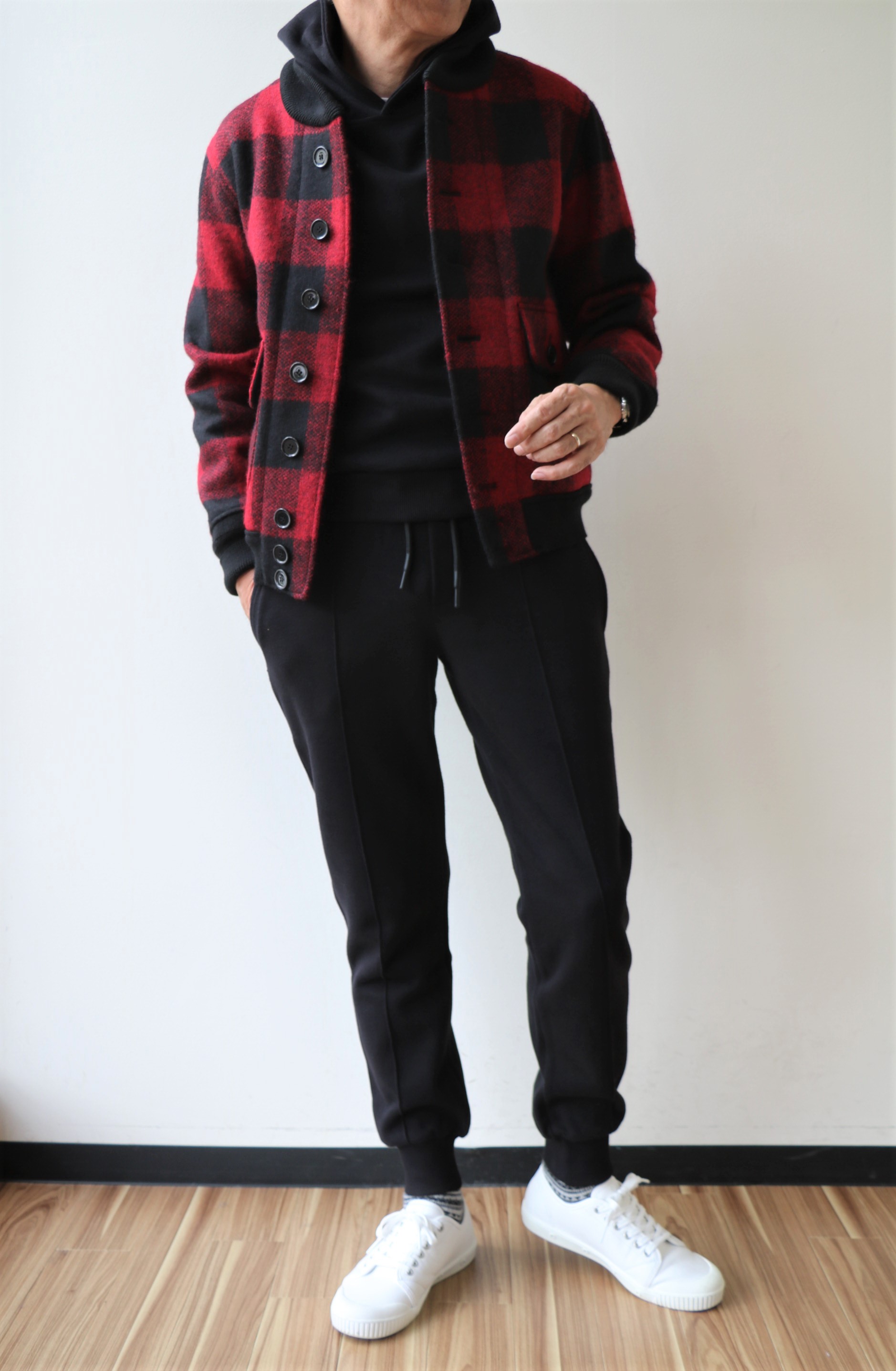 モデルは身長175㎝、体重64㎏、胸囲92㎝で、XSを穿いております。サイズにおいては、店頭で悩まれる方もございます。目安としてはXSが44、Sが46、Mが48に相当するでしょうか。タイトに着るか、ゆとりを持つかでご判断ください。