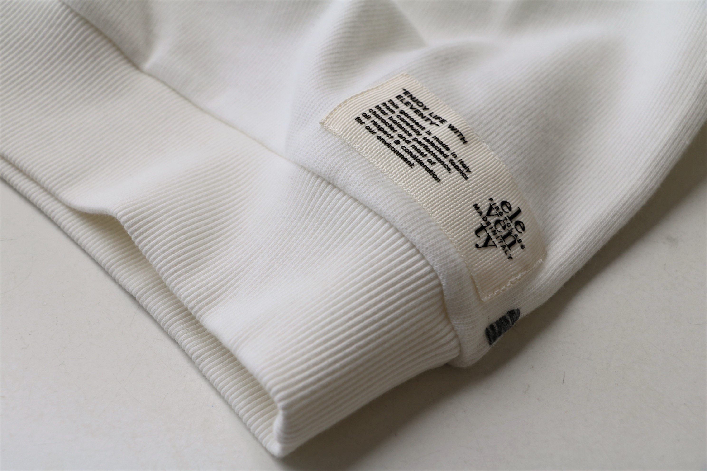 "ENJOY LIFE WITH ELEVENTY" のメッセージタグ。隣の刺繍と共にデザインとしても美しく、さりげなさが得意な【eleventy/イレブンティ】ならではの仕上がりです。