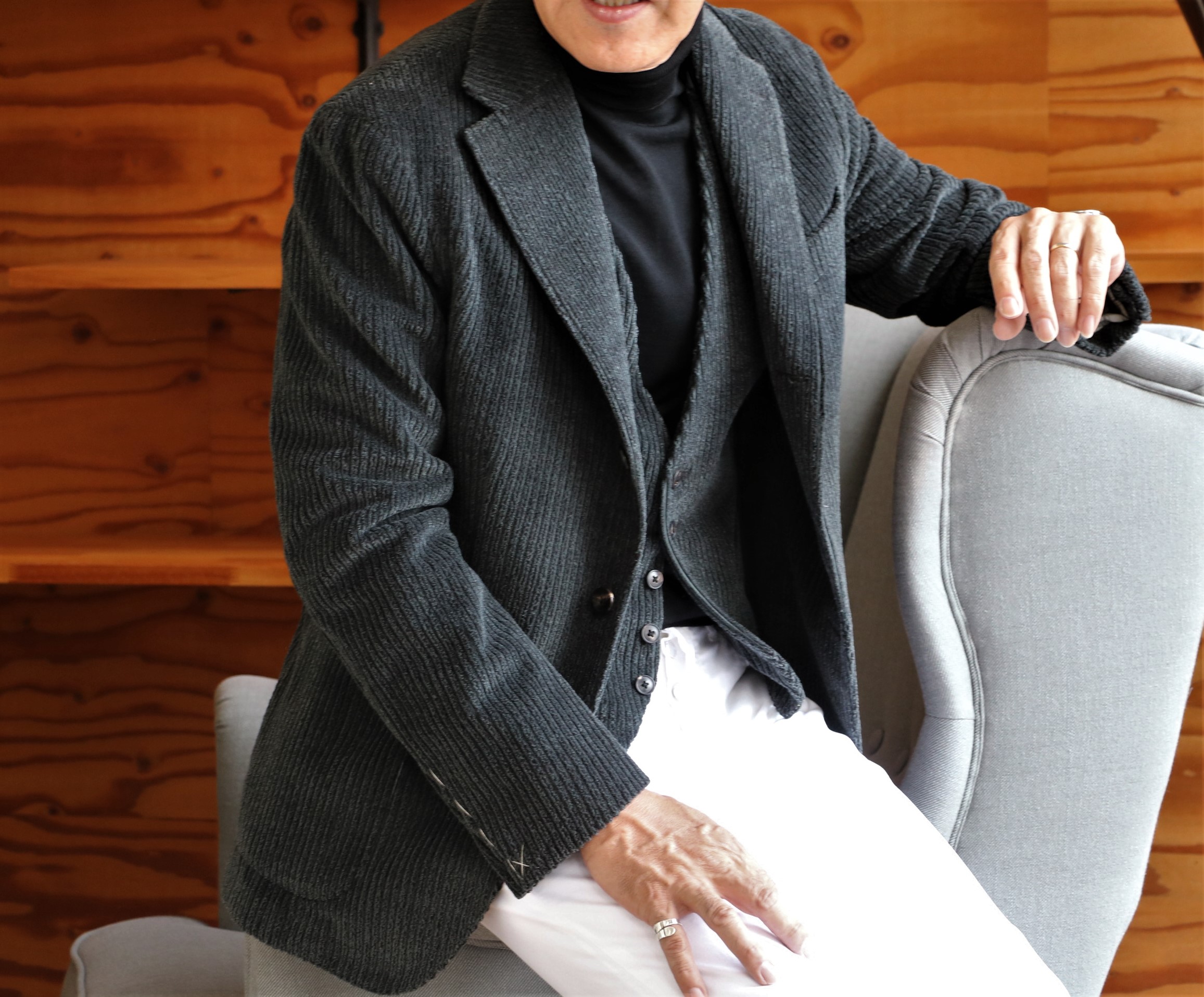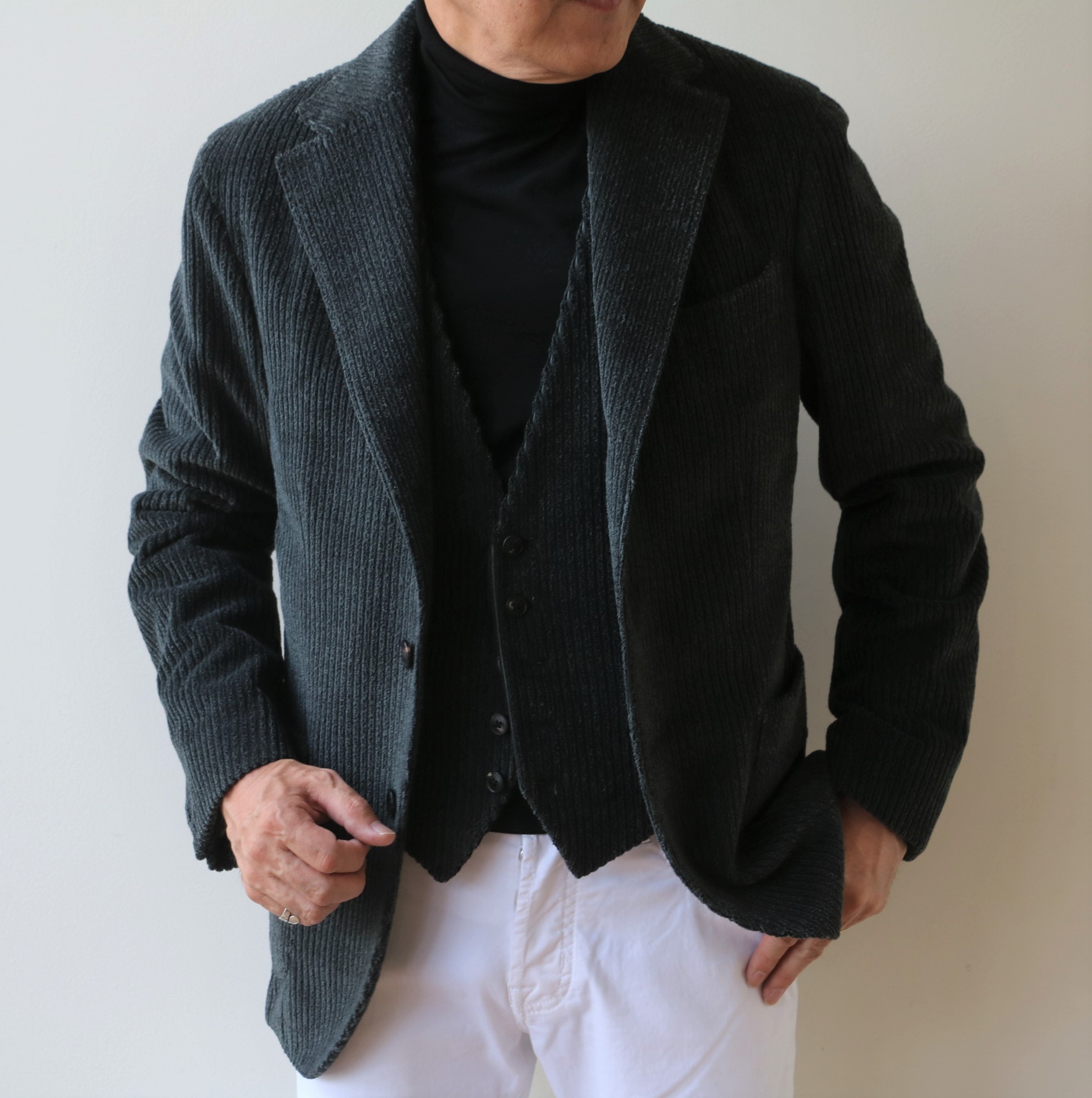 上品な顔をもつ太コーデュロイは、コットンとウールのブレンド素材。メランジのダークグレイが、さらにモダンでエレガントな表情を作り出しています。