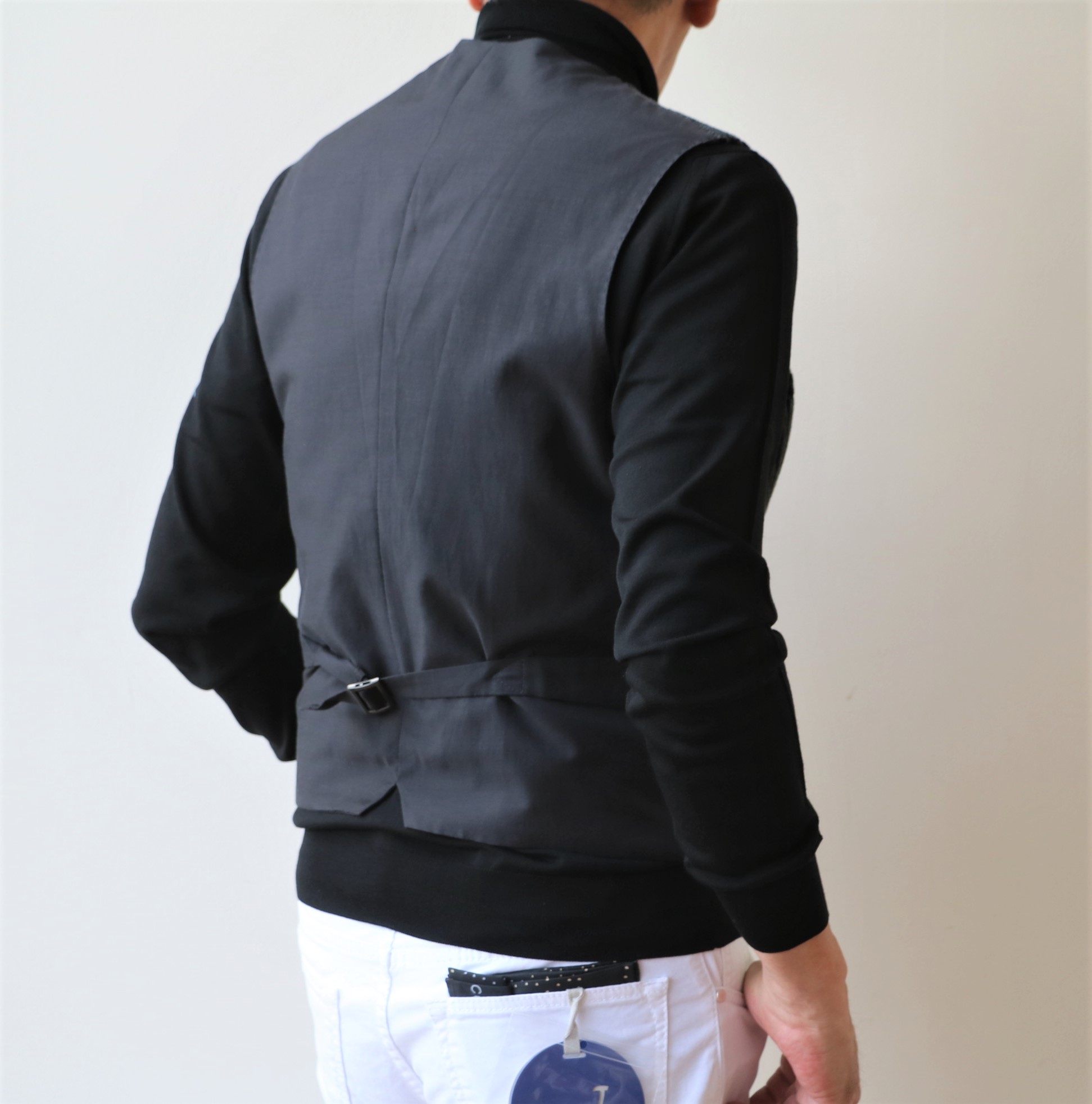 比較的、Vゾーンは深めの5つ釦です。単品でも使いやすいジレですが、予算に余裕があれば、ジャケットに合わせて揃えていただきたい。ツインニットのエレガントさのように、女性の視線を感じるとともに、その目をも楽しませることができる...そんなジレです。