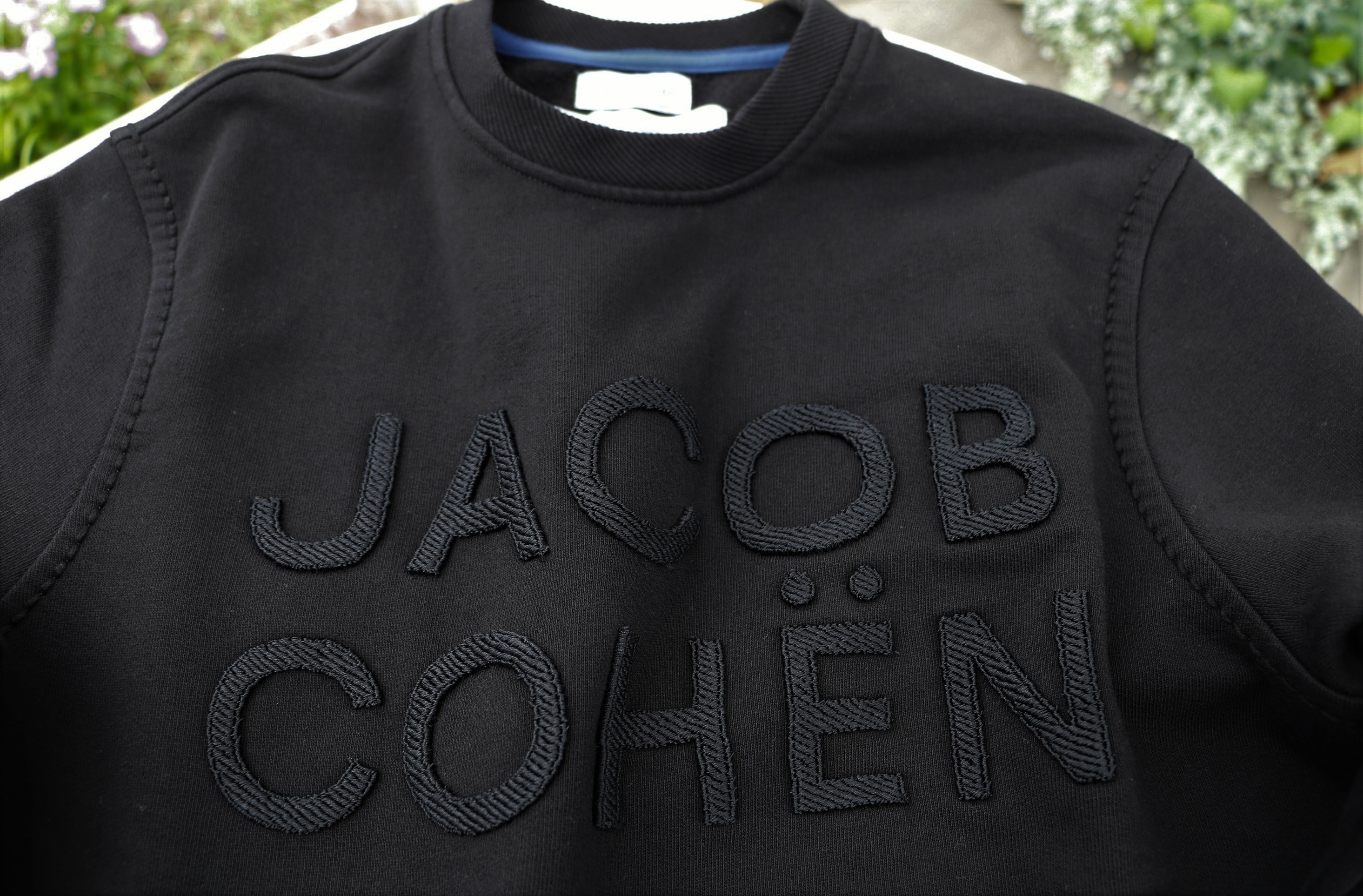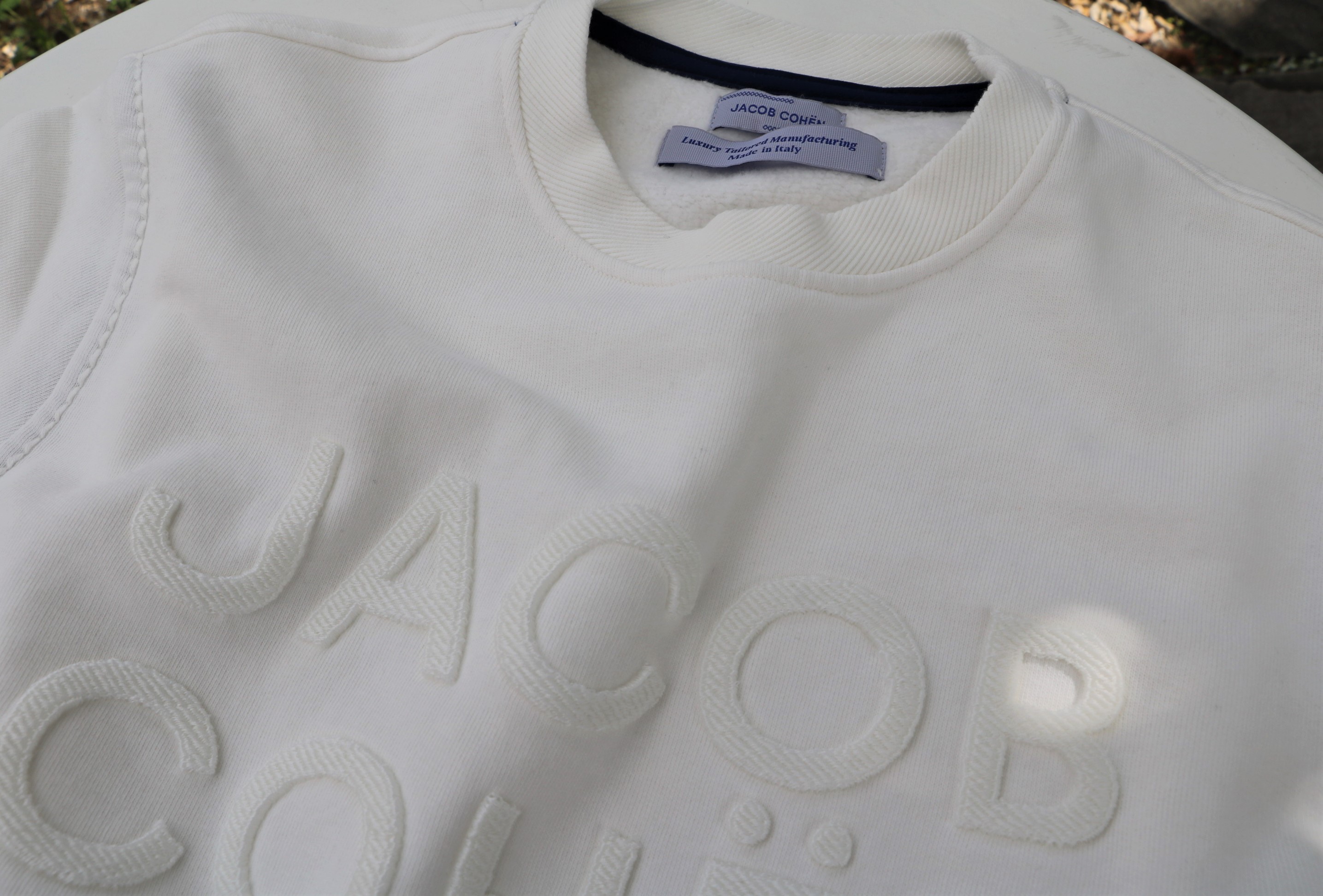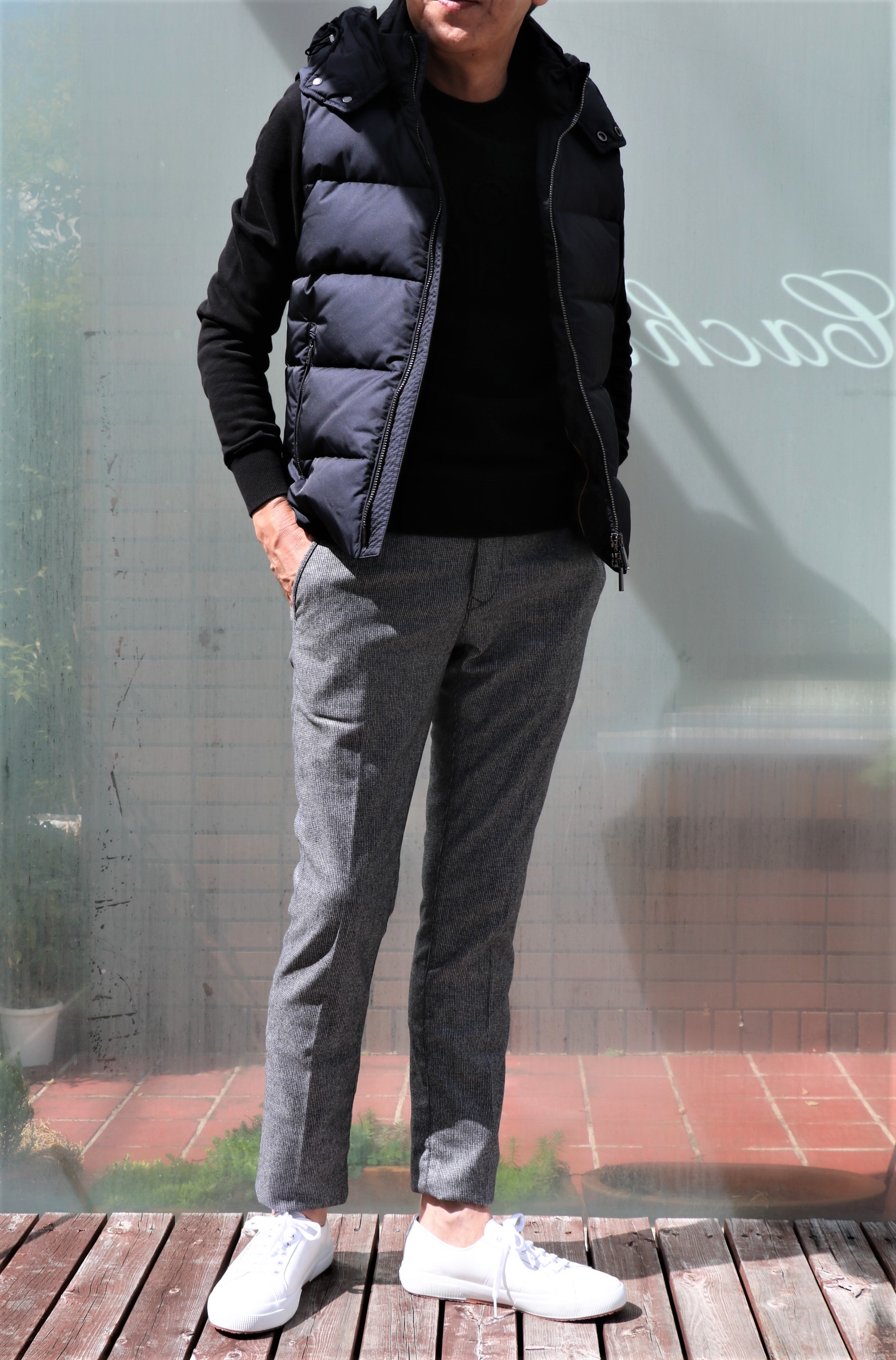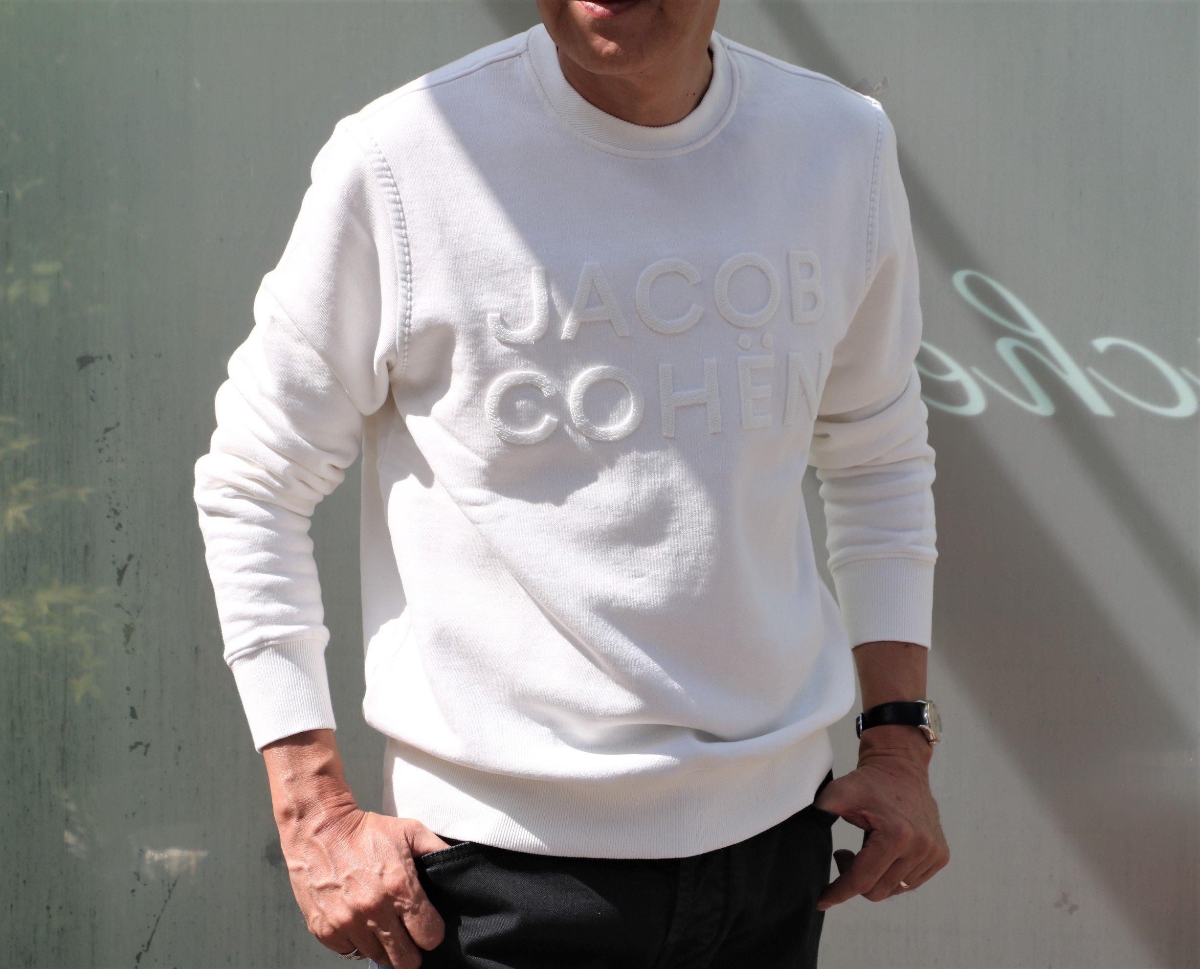 光が降り注ぐカシェートのテラス。眩しいほどの日差しの中、撮影です。ご紹介するのは、【JACOB COHEN/ヤコブ コーエン】。どれがと言いますと、MooRER(ムーレー)のダウンベストに合わせているカットソーとパンツ。足元には、未公開のSUPERGA(スペルガ)。レザーのスニーカーです。
