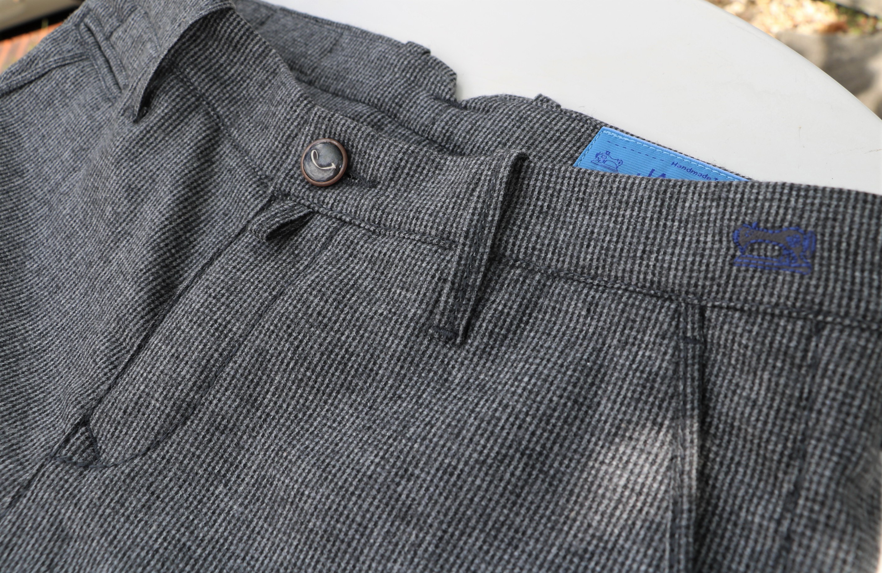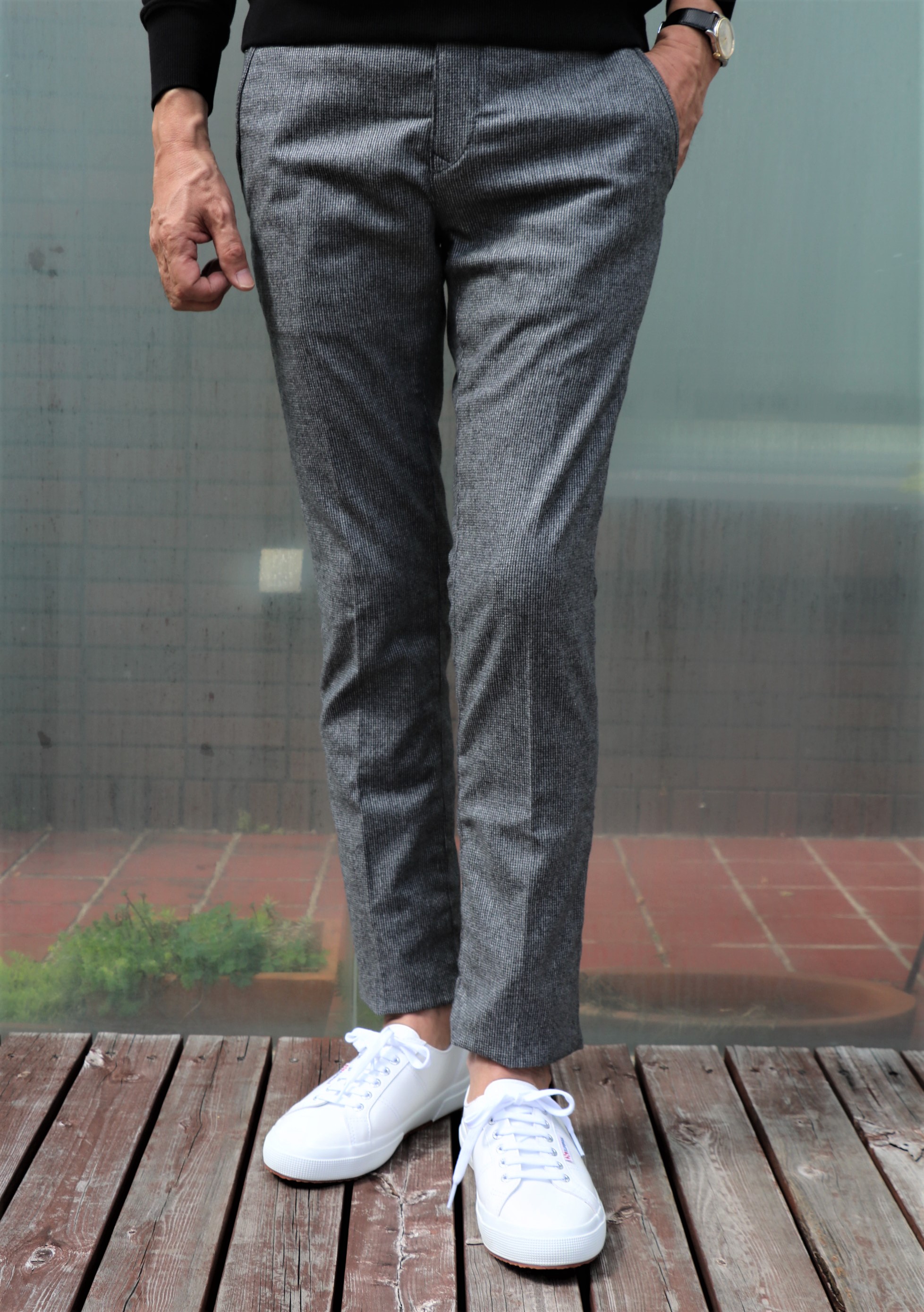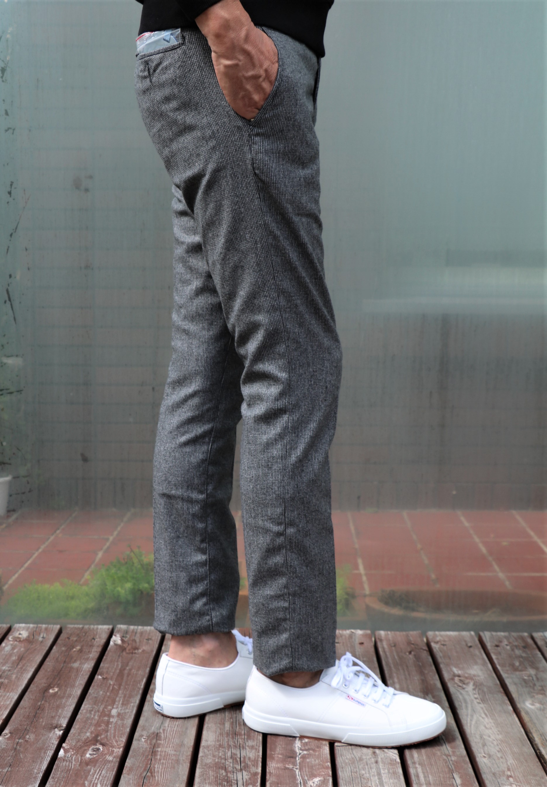 モデルは「BOBBY WOOL COF」。ジーンズと同じ5ポケットでも、L字型ではなく、スラックスにみるスラントポケットになります。カシミアをほんのり混ぜたウールストレッチのパンツは、千鳥格子に似たミニチェック柄です。個人的に愛用している「BOBBY WOOL COF」。腰回りのフィット感が抜群の美脚パンツです。