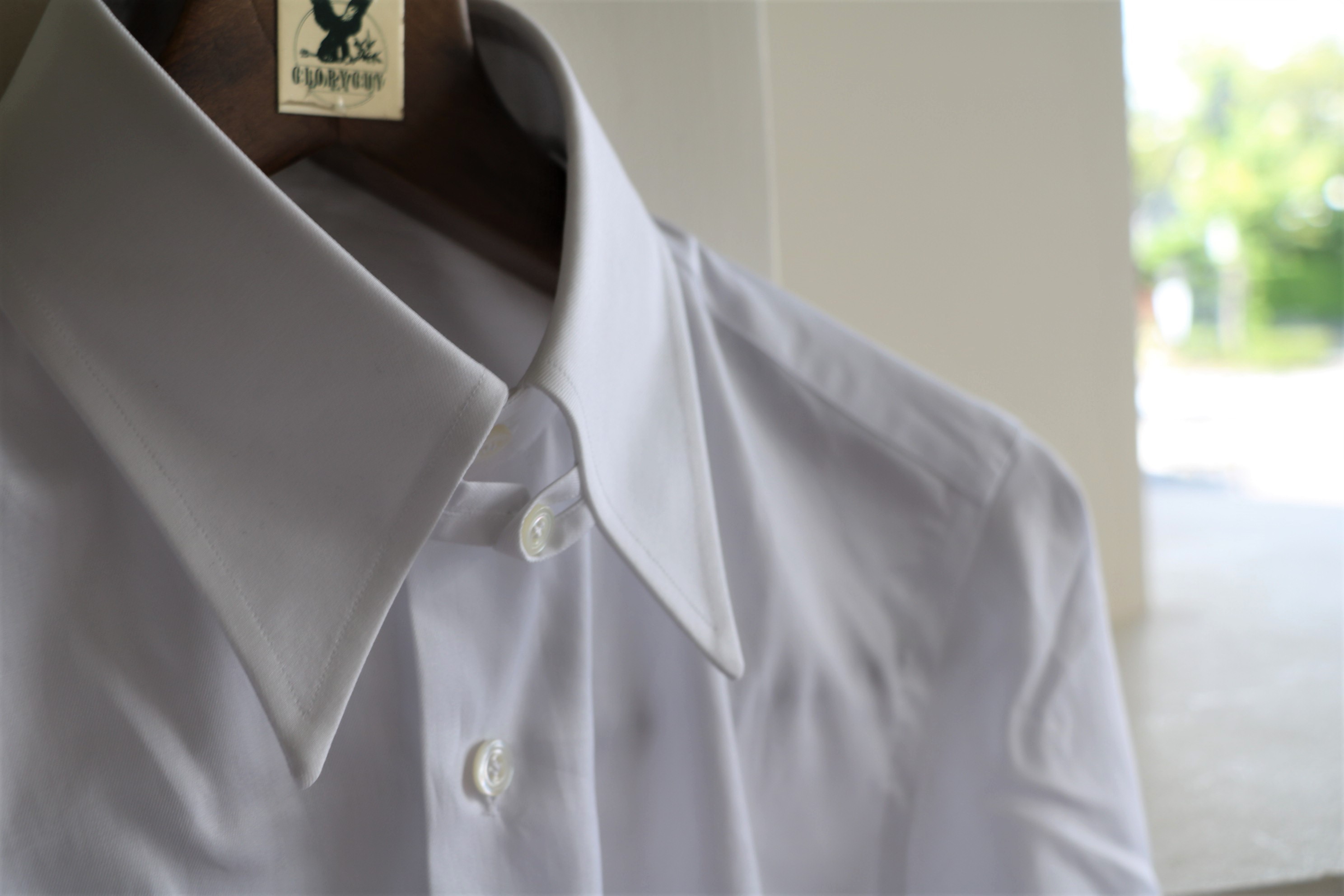 業界人の中では大人気のタブカラー。美しい光沢のあるブロードクロス(ポプリン)のホワイトでご用意しました。華やかでクラシックなVゾーンを演出できます。そろそろ普及してもいい頃ですね。