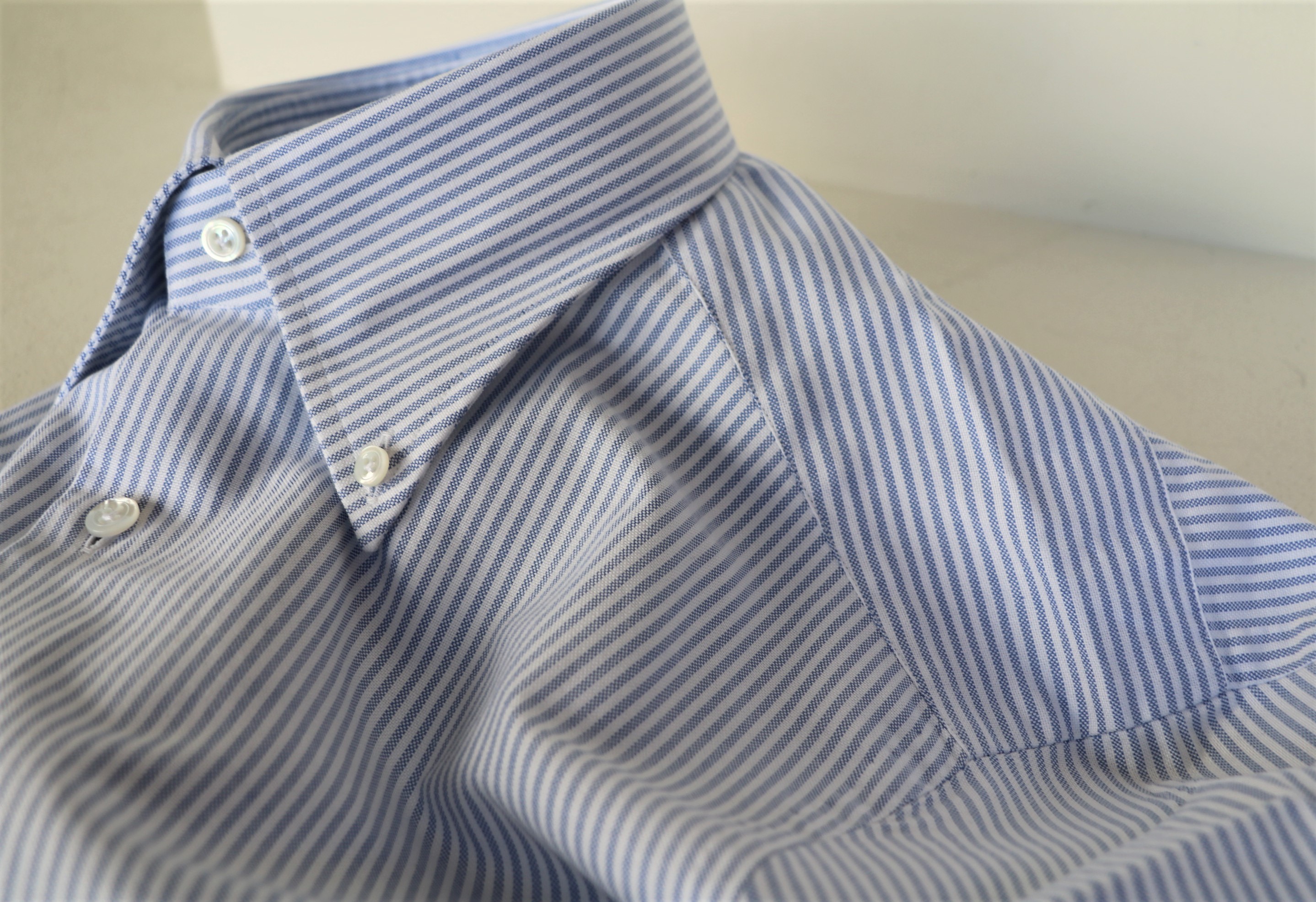 スポーティーなオックスフォード地のボタンダウン(BD)と言えども、タイドアップしてジャケットを羽織った際、エレガントに見せる為に必要なのは、BDの釦を見せないことと襟のロール具合。襟の長さ9.5㎝のモデル「MBD」は、そんな条件をクリアしたカラーモデルです。